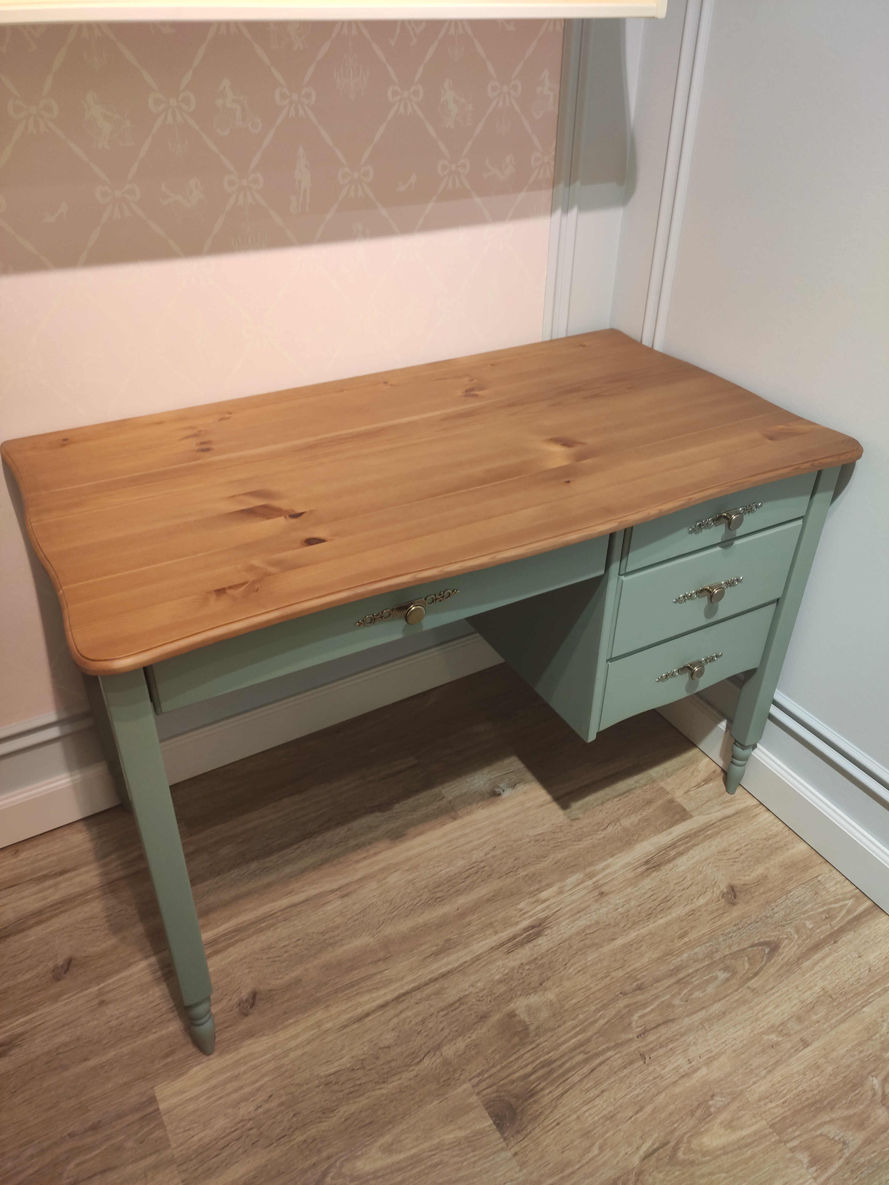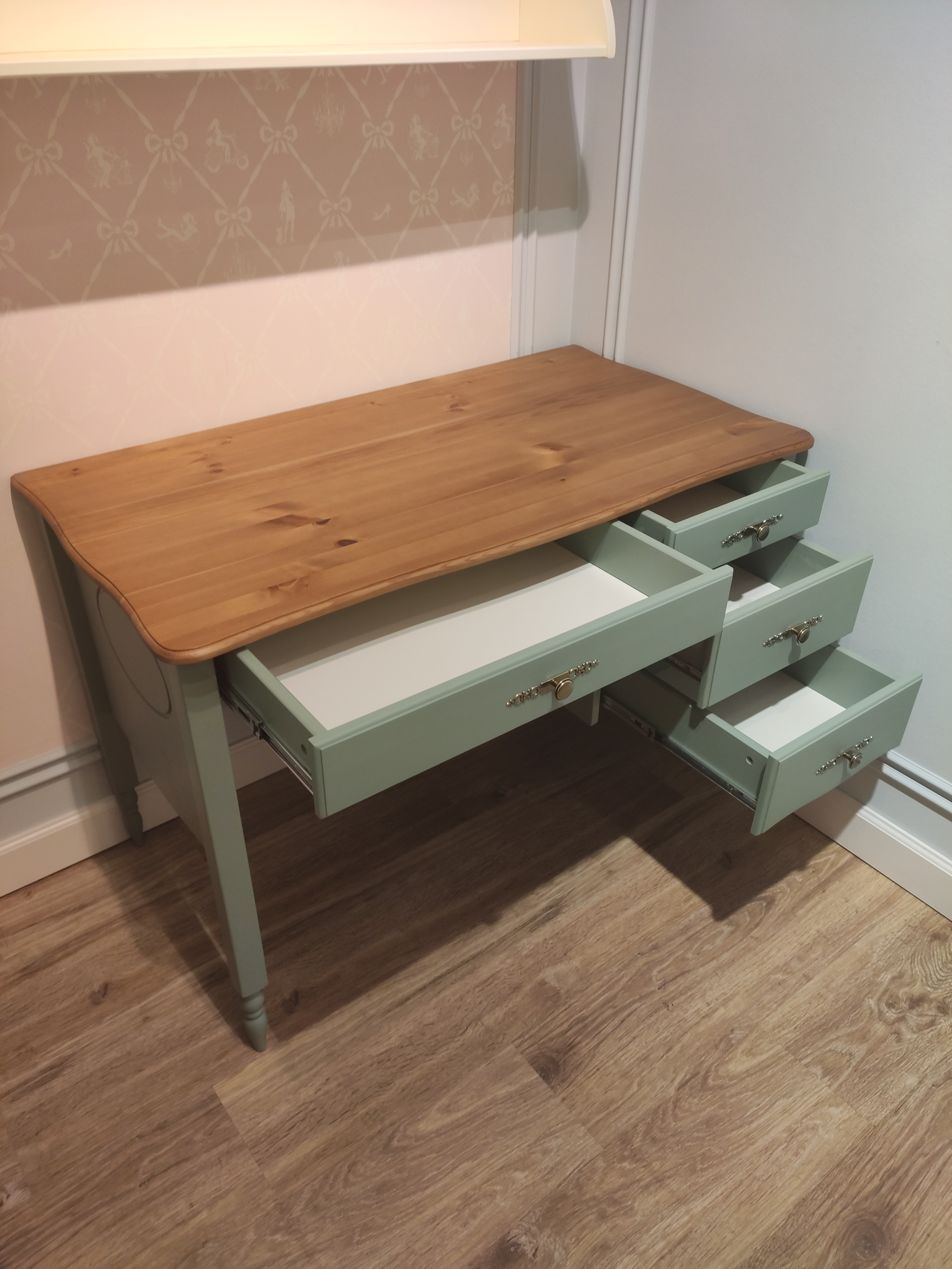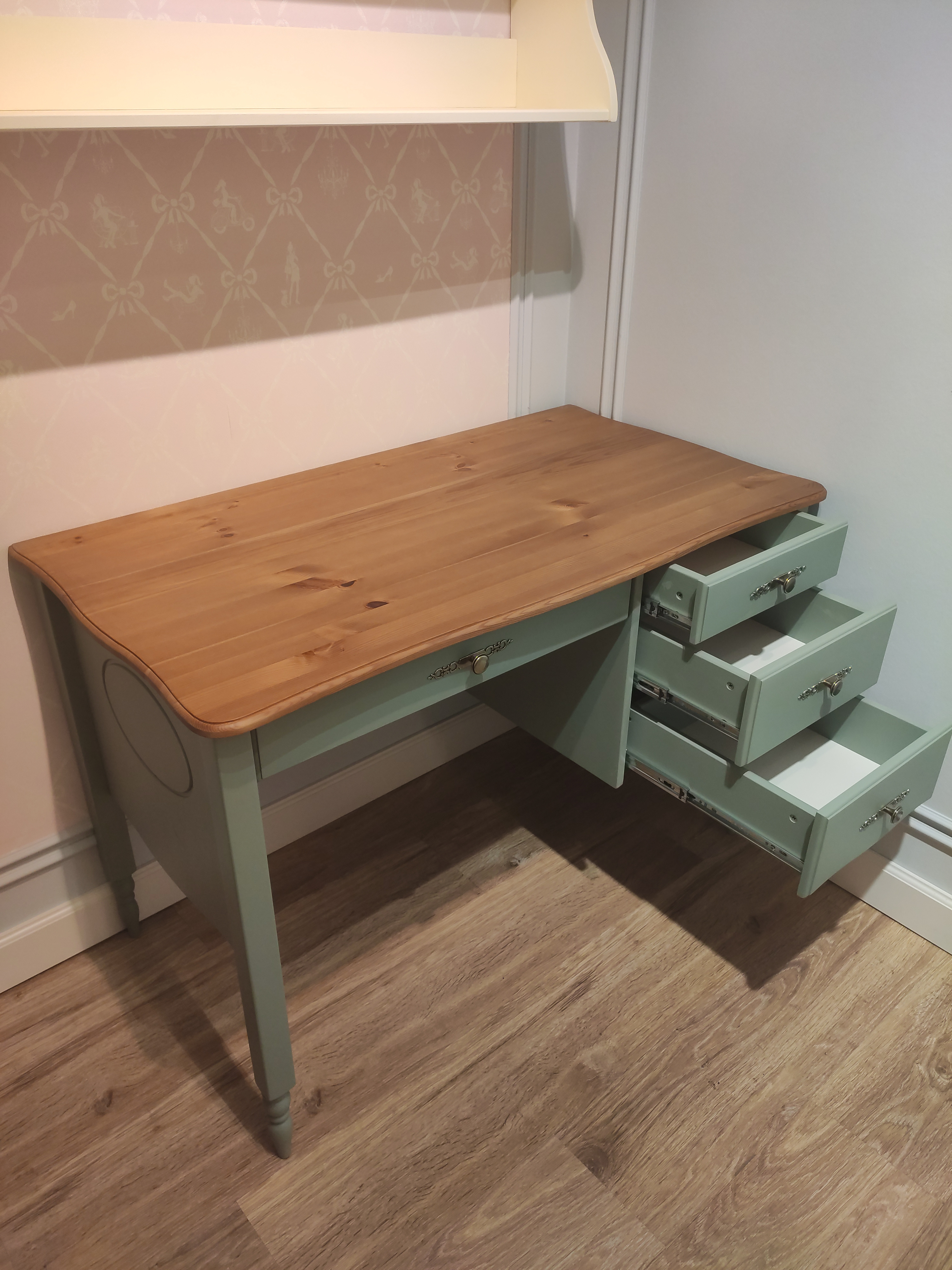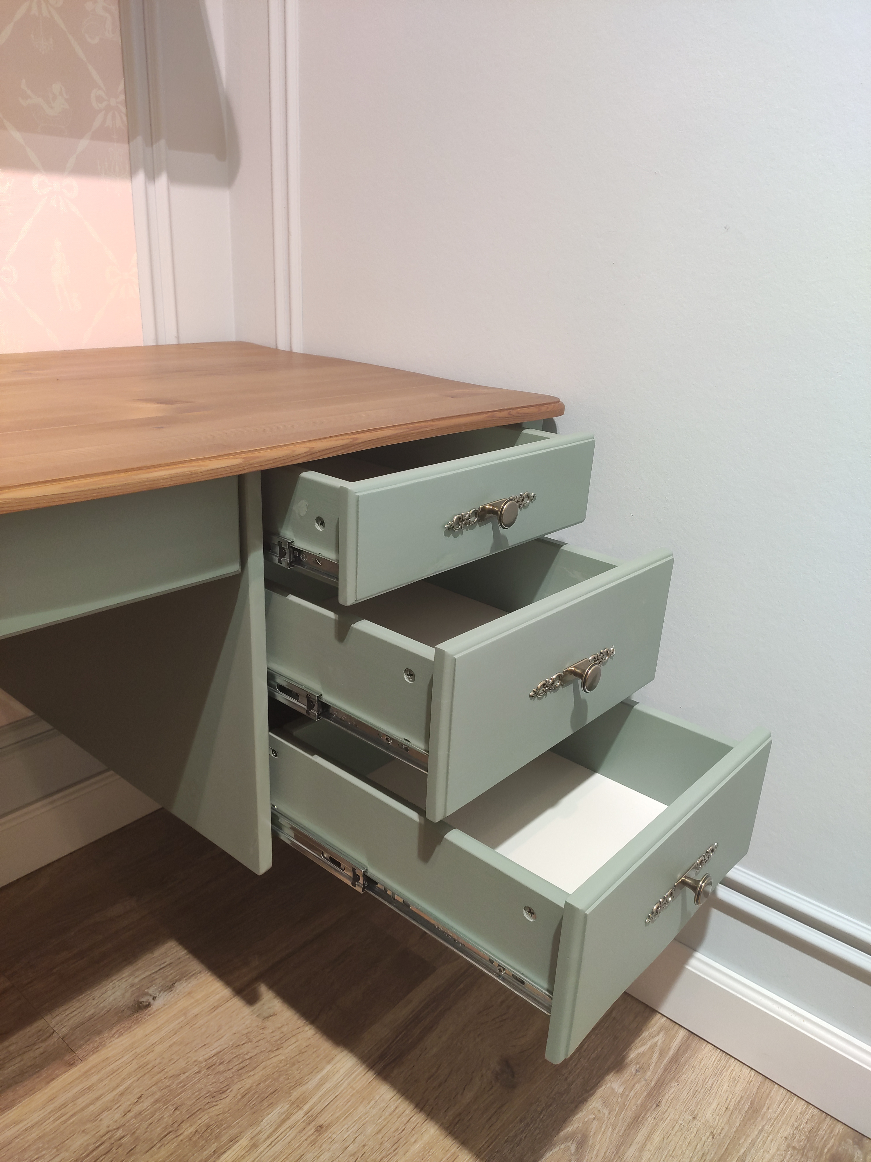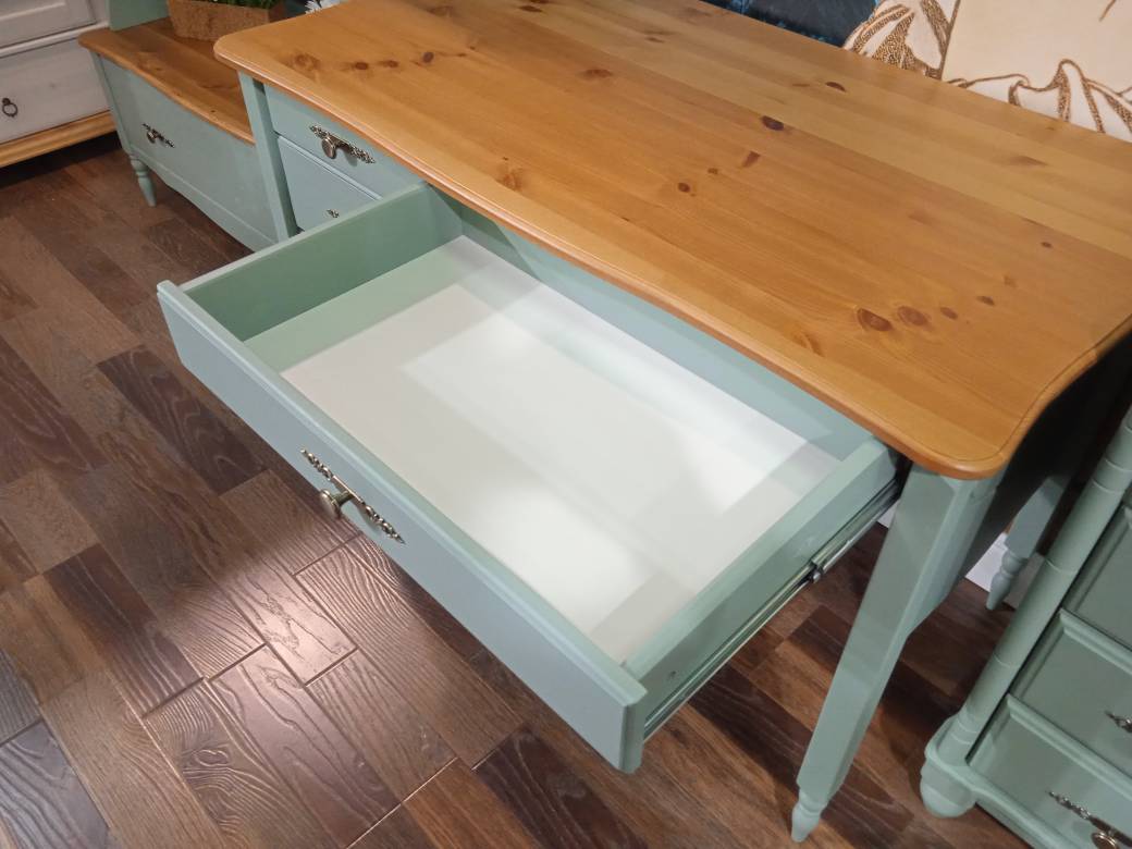 Материал - сосна, в том числе задние стенки, дно ящиков - ДВП.