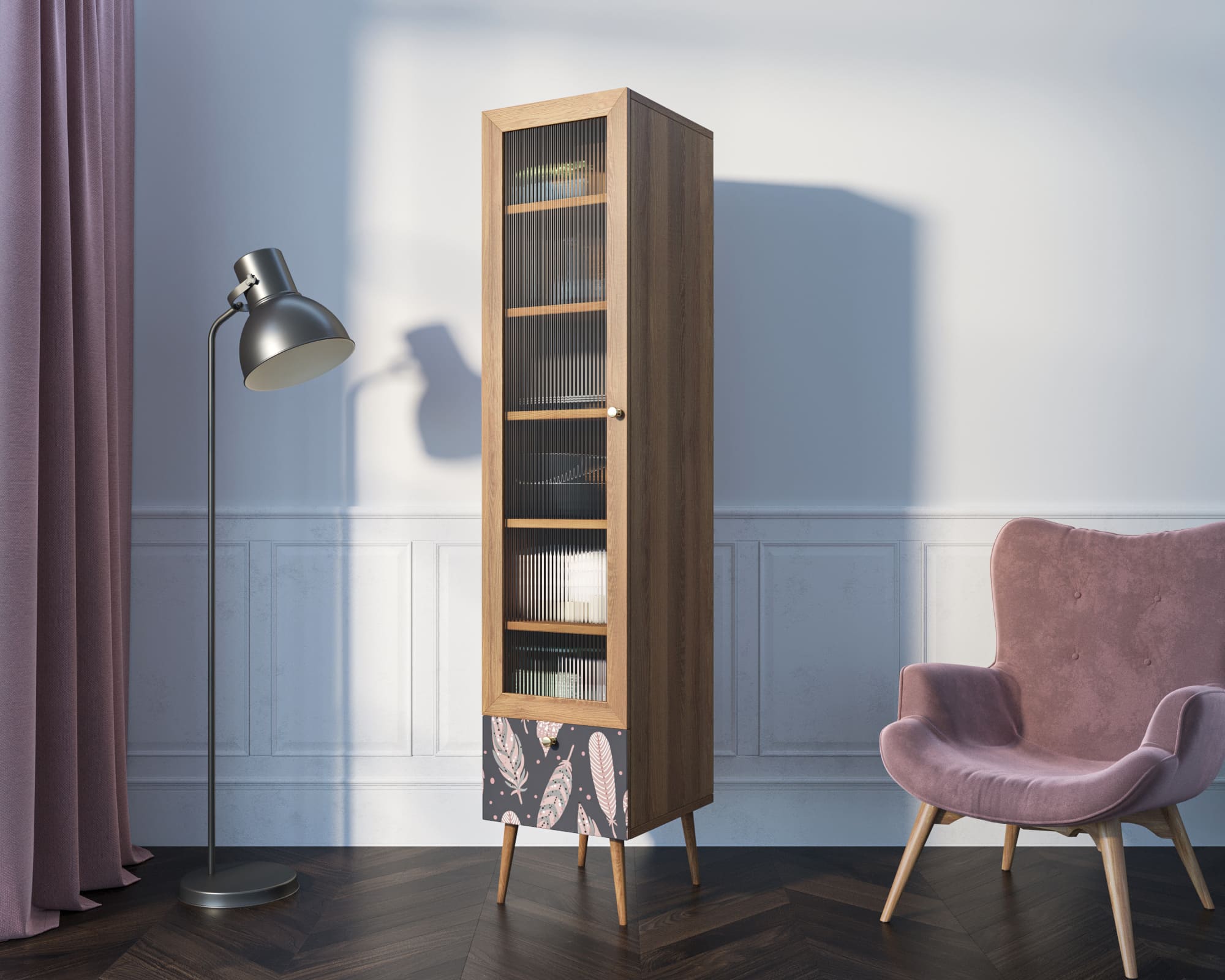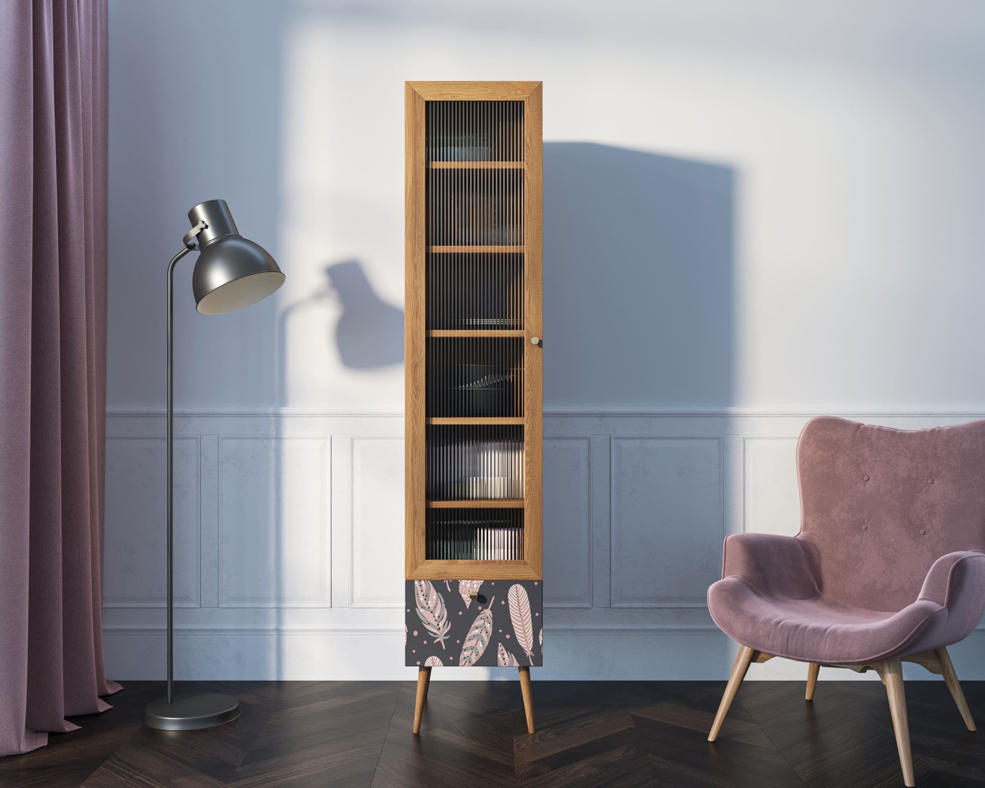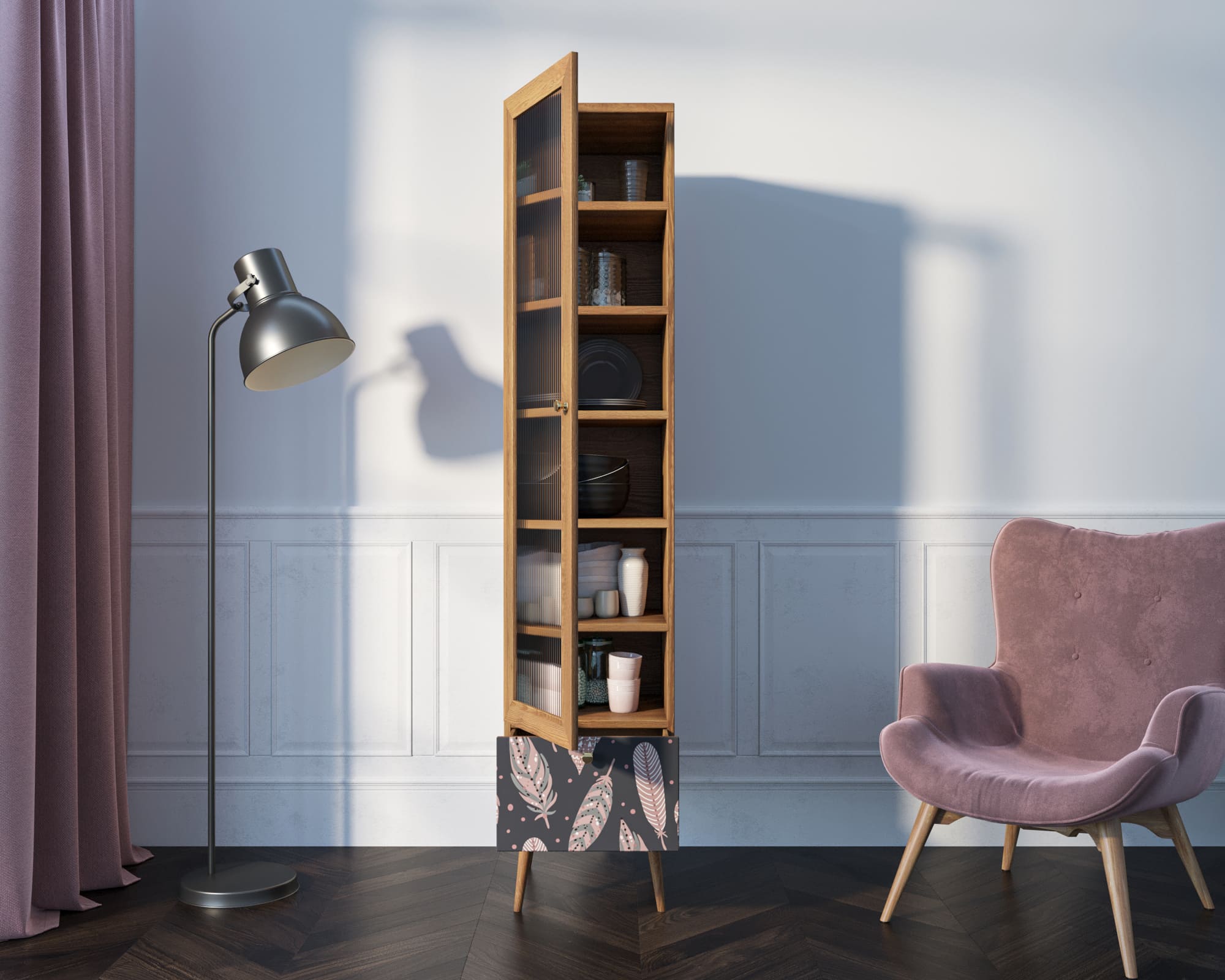 Корпус и ящики изготавливаются из ЛДСП австрийской компании "EGGER". Ножки мы делаем из массива ясеня и крепим на стальную пластину, на дверях петли с доводчиком а на ящиках шариковые направляющие. Принт на фасады наносится принтером специальными УФ - чернилами.