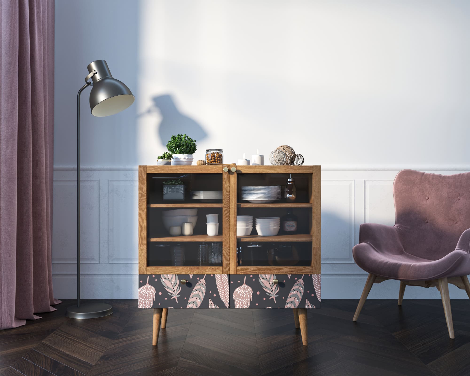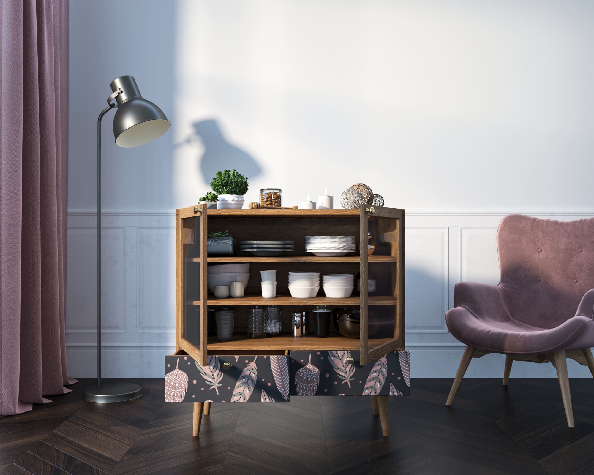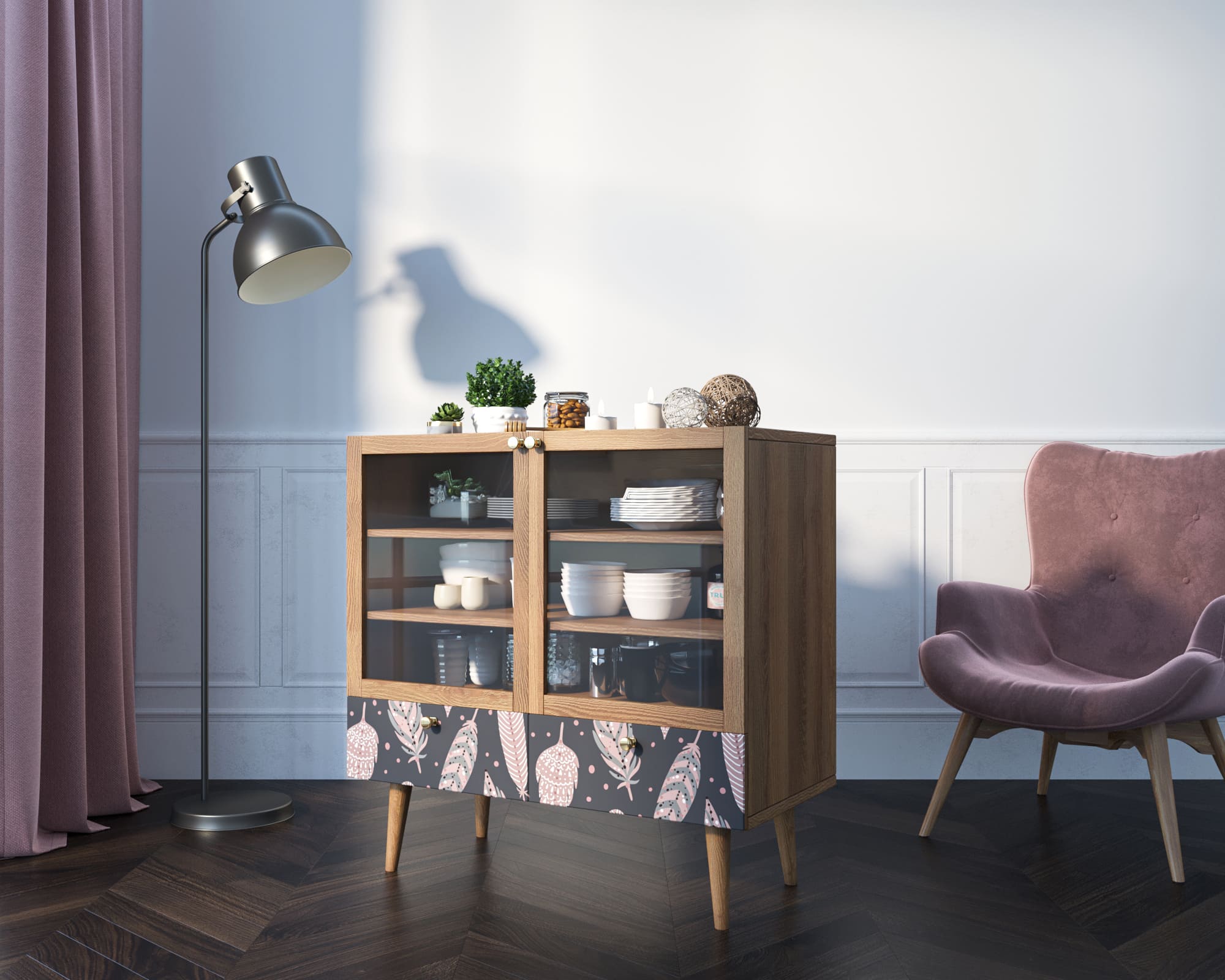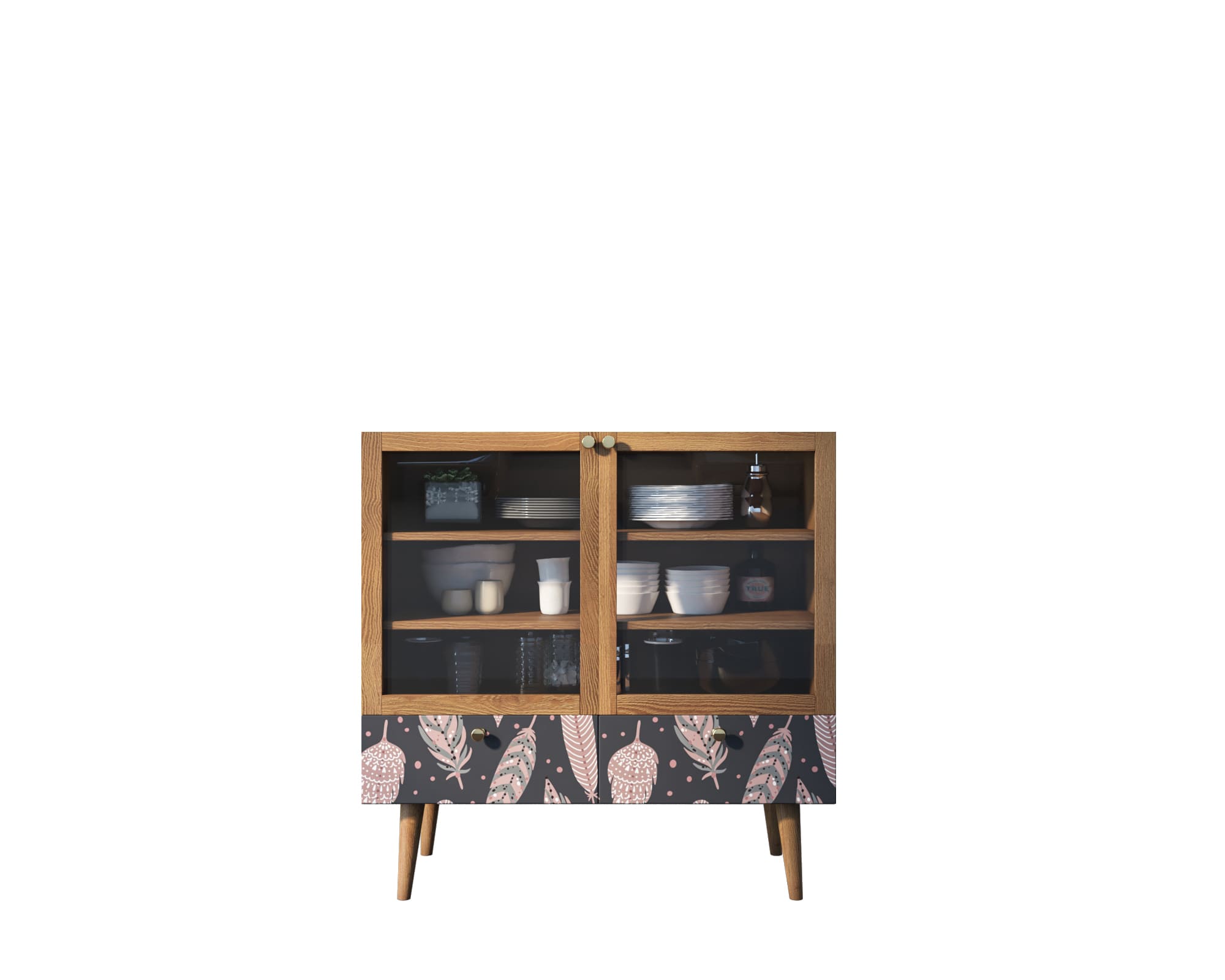 Буфет низкий с дверцами. Буфет "Berber" – оригинальная модель с выделяющимся внешним видом, поэтому ее лучше комбинировать с предметами мебели из аналогичной коллекции. Корпус изделия сделан из ЛДСП, высокие ножки изготовлены из массива ясеня. Обе дверцы буфета выполнены из прозрачного стекла, поэтому кухонную утварь внутри шкафа будет видно хорошо. Снизу буфет оформлен ящиком с лиственным принтом в яркой расцветке, благодаря чему изделие можно отнести к стилям этно или скандинавскому.