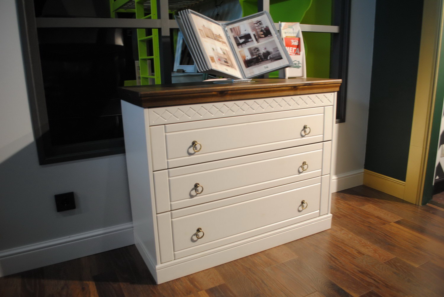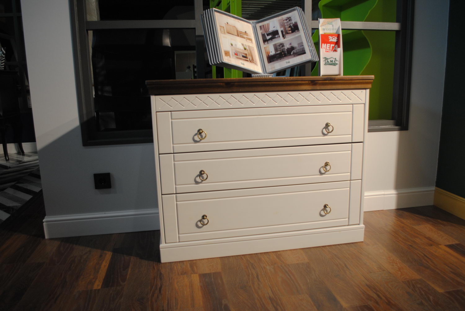 Комод с тремя выдвижными ящиками на шариковых направляющих.