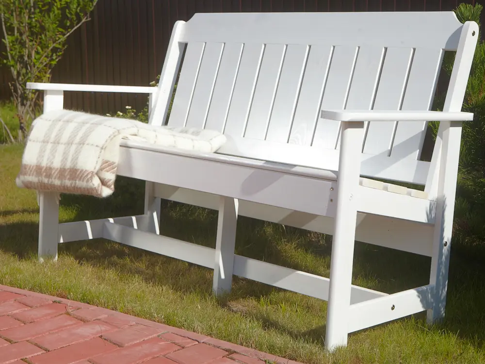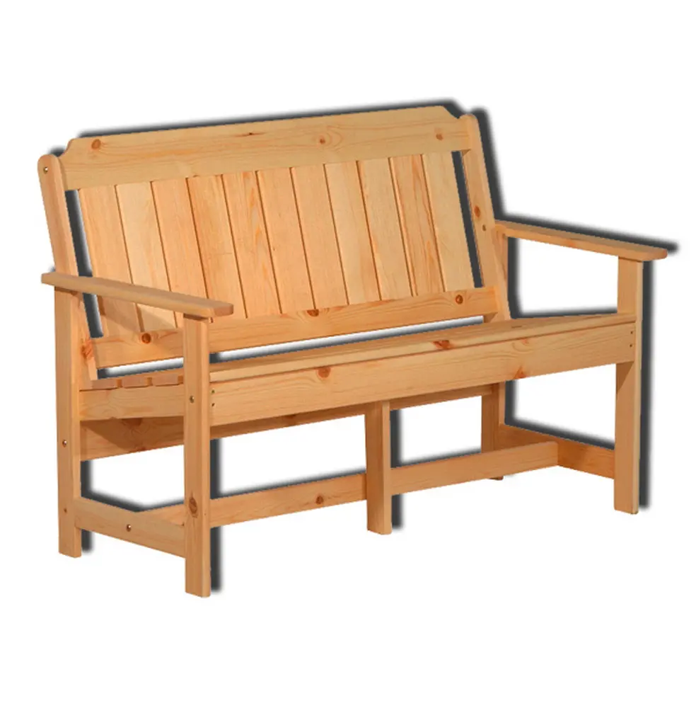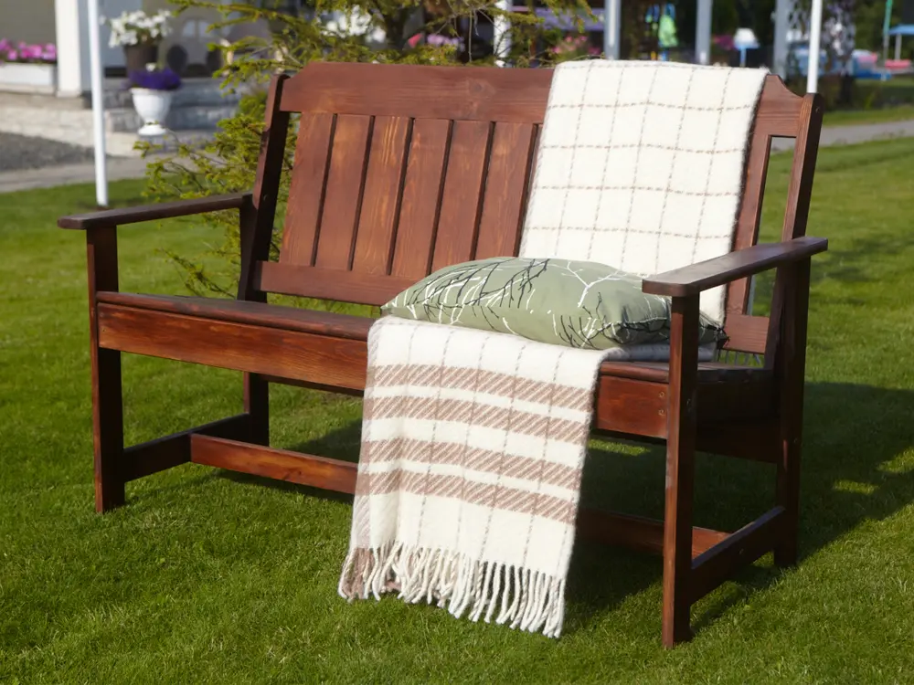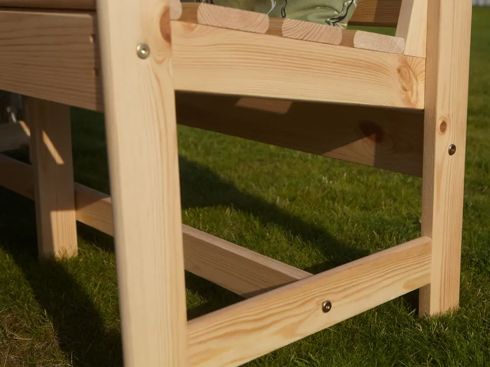 Скамейка выполнена из массива сосны, покрытого защитным лаком, который обеспечивает устойчивость к воздействию солнечных лучей и осадков.
