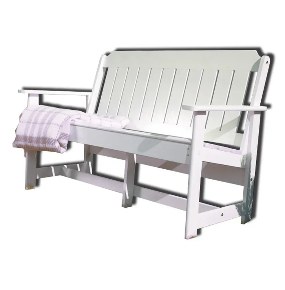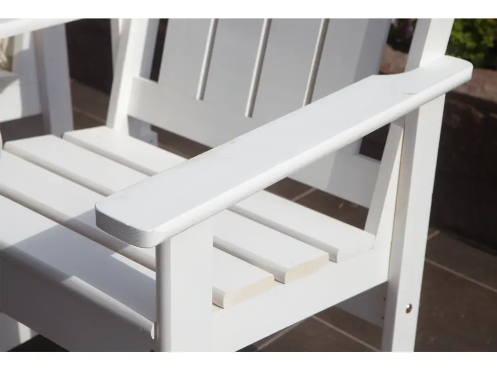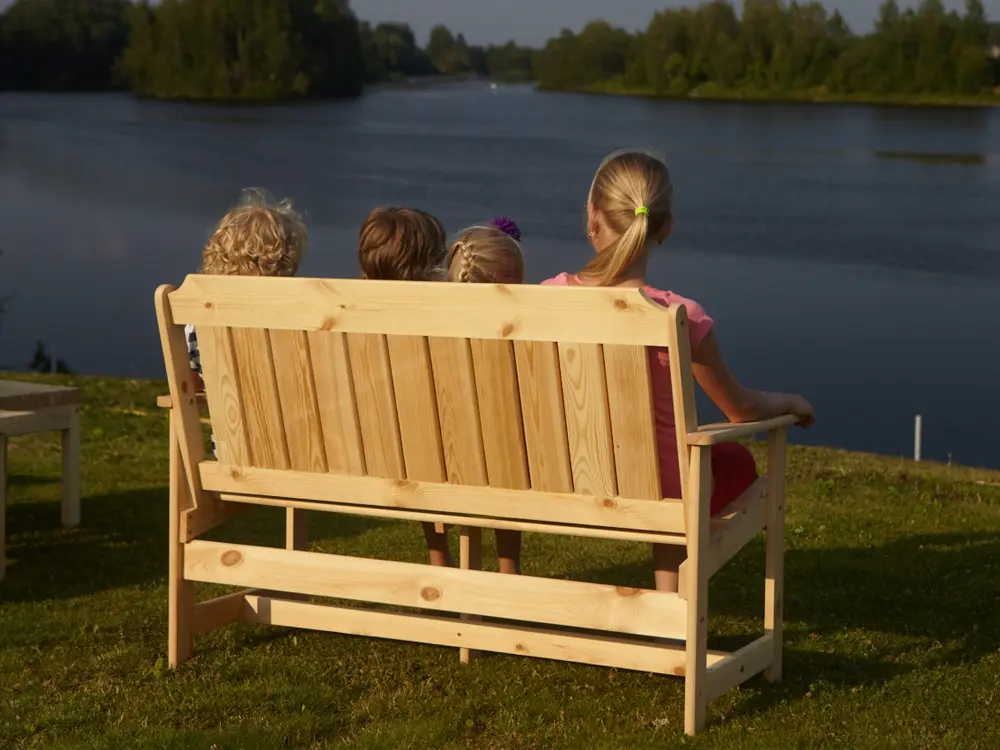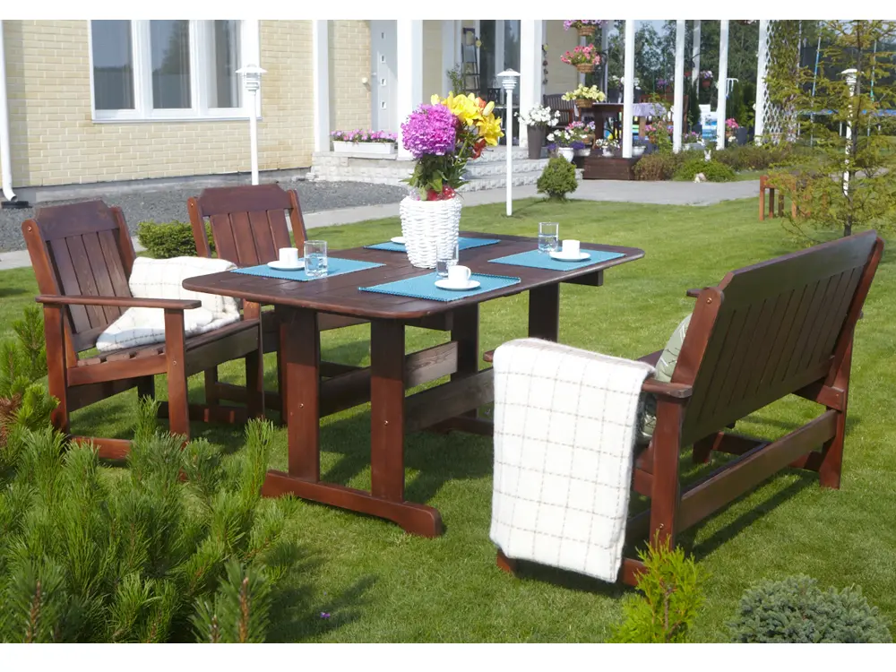 Скамейка выполнена из массива сосны, покрытого защитным лаком, который обеспечивает устойчивость к воздействию солнечных лучей и осадков.