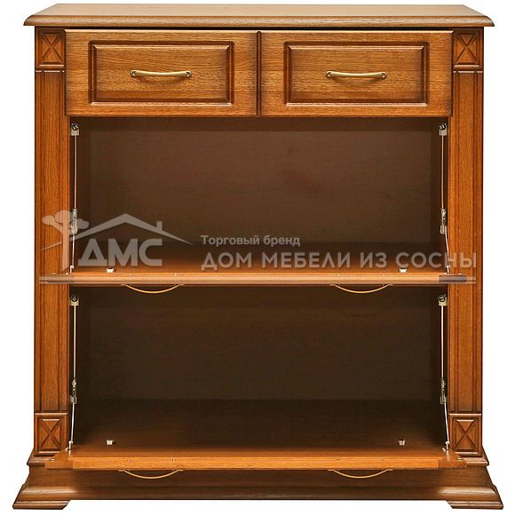 Образец комплектуется двумя отделами с откидными дверками и таким же количеством небольших выдвижных ящиков.