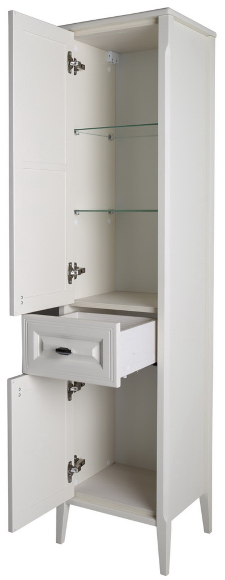 Верхний ящик тумбы разделен на 3 отсека для раскладывания предметов, в отделении с дверцами есть полка. Пенал имеет два отделения с дверцами, в верхнем установлены съемные стеклянные полки. Кроме того, в пенале есть небольшой выдвижной ящик. На ящиках и дверях установлены направляющие и доводчики европейского производства, они открываются плавно и тихо.