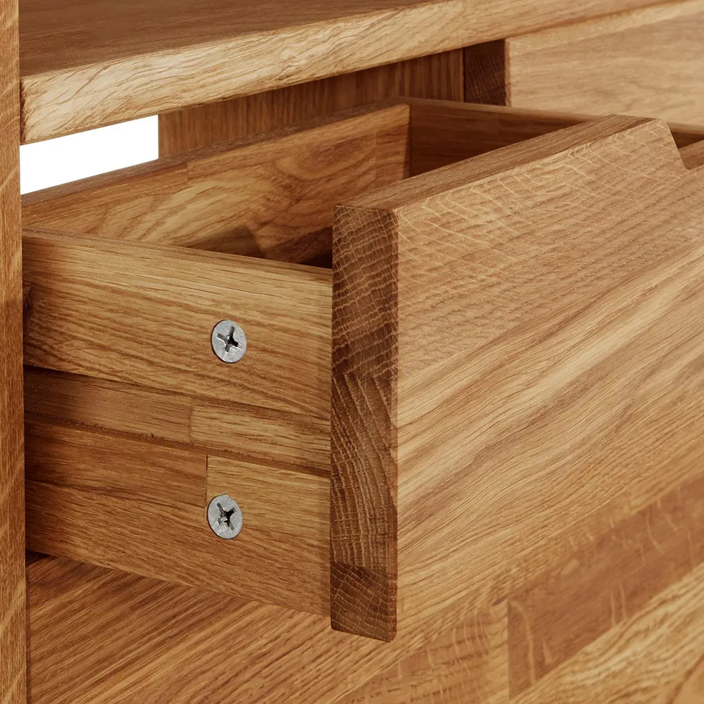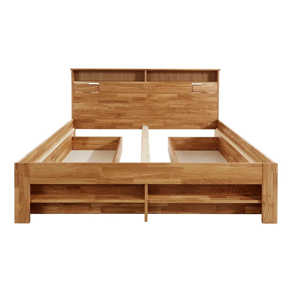 В изголовье и в изножье кровати есть широкие встроенные полки, в изголовье также сделаны маленькие выдвижные ящики для мелочей с каждой стороны. Кроме этого, кровать комплектуется двумя выкатными ящиками для хранения одежды и постельного белья.