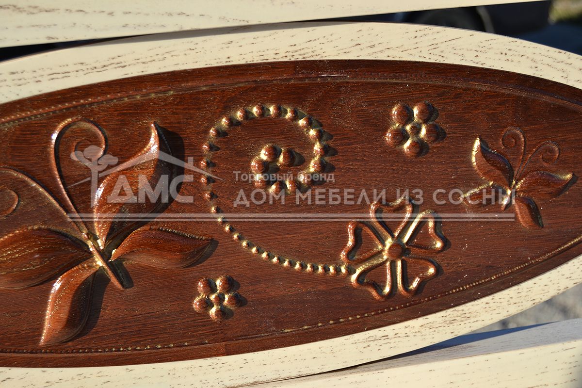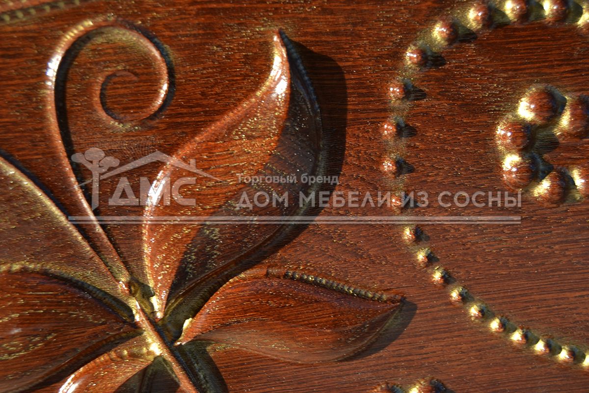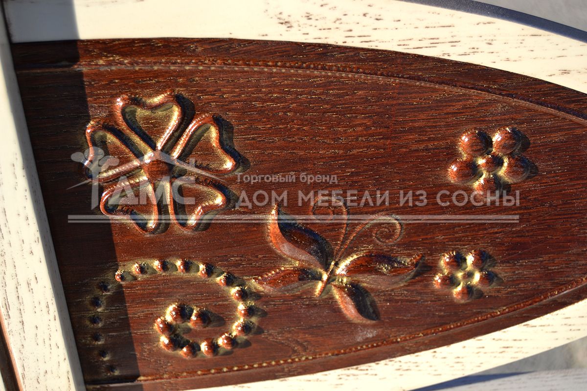 Изголовье кровати украшено резными элементами из берёзы, которые придают ей особый шарм и изысканность. Это делает кровать не только функциональной, но и эстетически привлекательной.