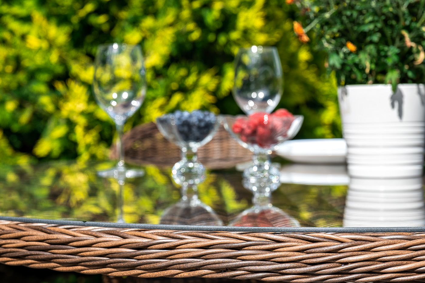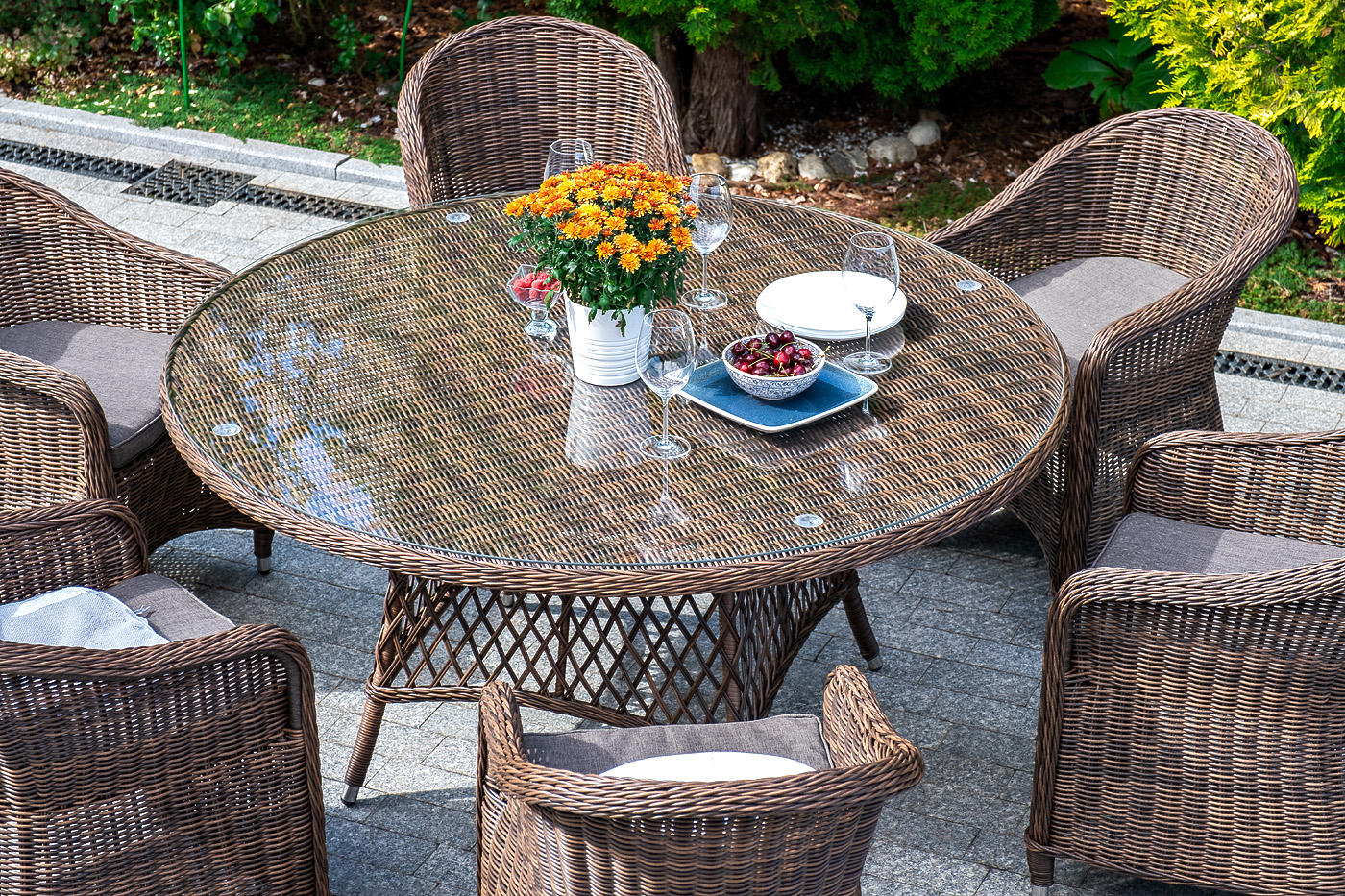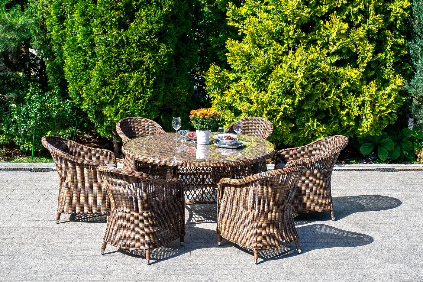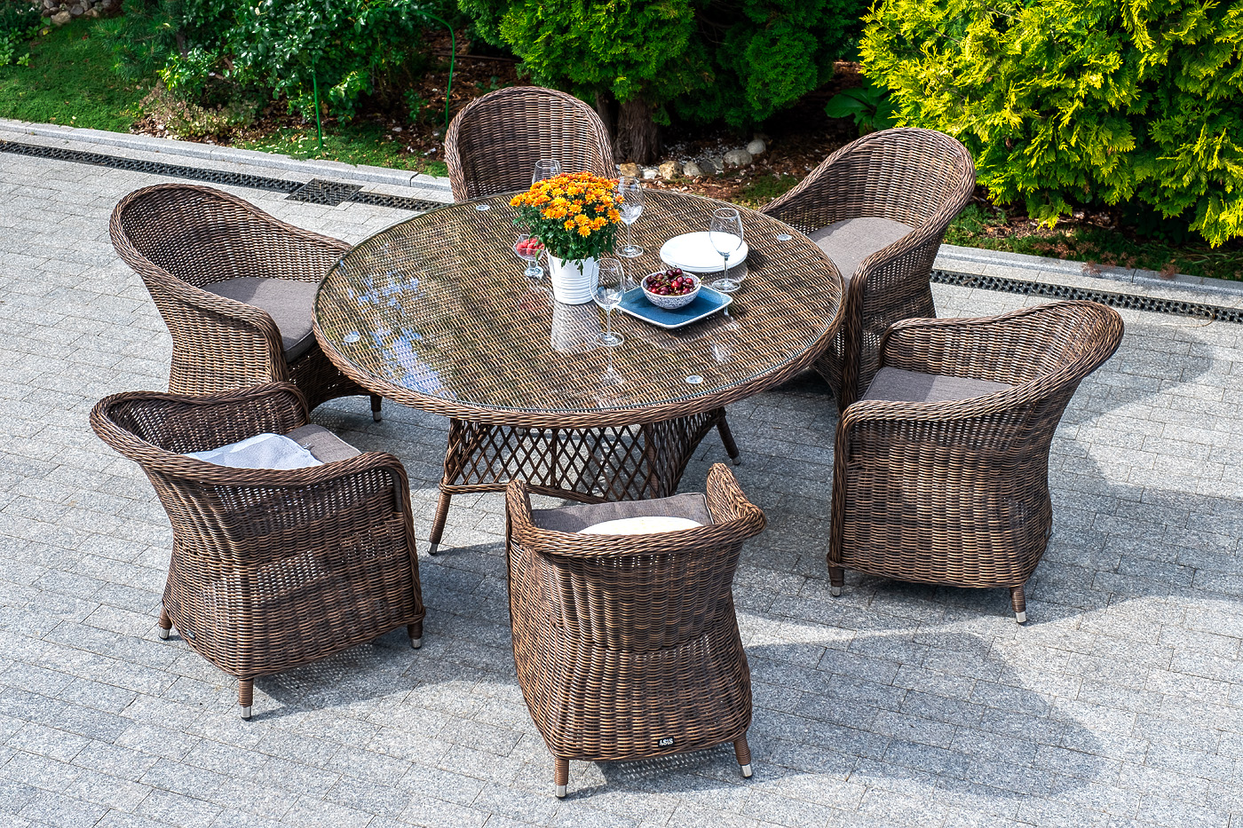 В комплект входит круглый обеденный стол «Эспреззо» (1500×1500×750 мм) с ударопрочной стеклянной столешницей и 6 кресел коллекции «Равенс» 680×570×810 мм. "Эспреззо" плетеный круглый стол, диаметр 150 см, цвет коричневый 1шт. 1 500Х1 500Х750, "Равенс" плетеное кресло из искусственного ротанга, цвет коричневый с серой подушкой 6шт. 570Х680Х810,