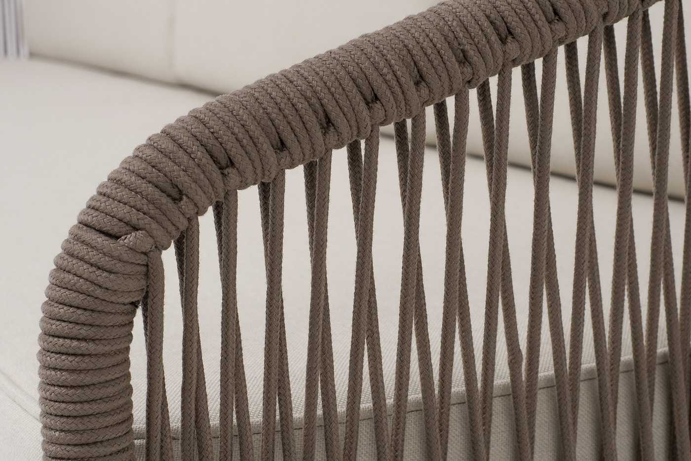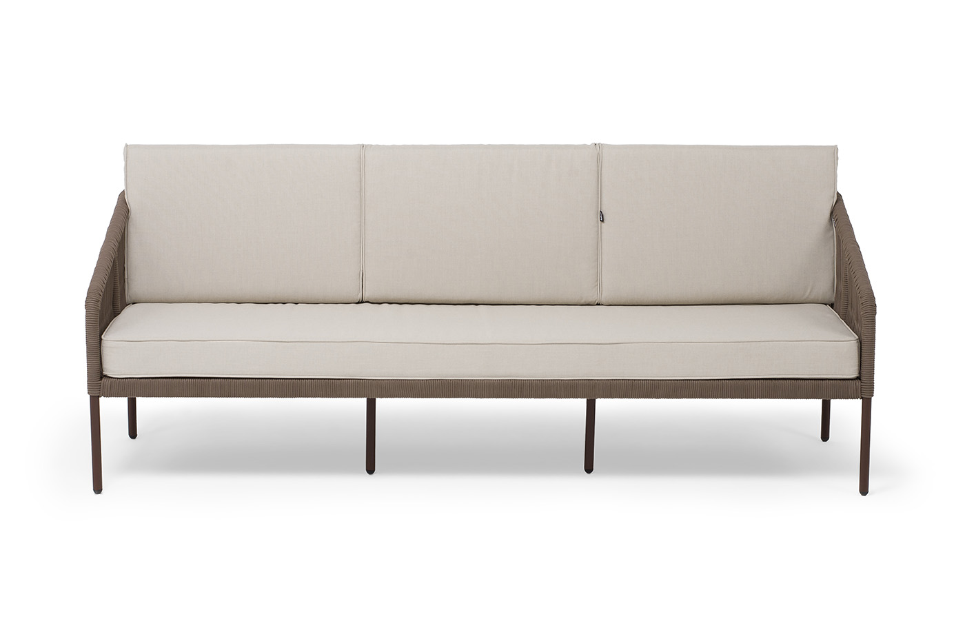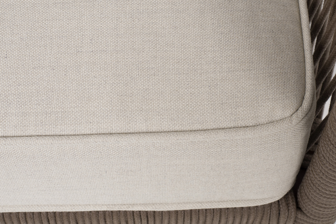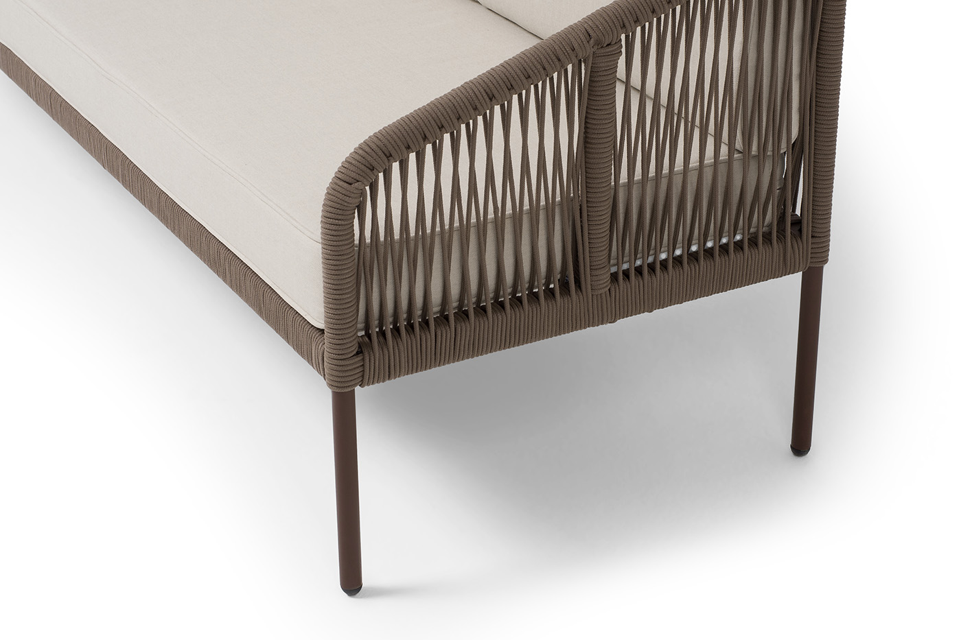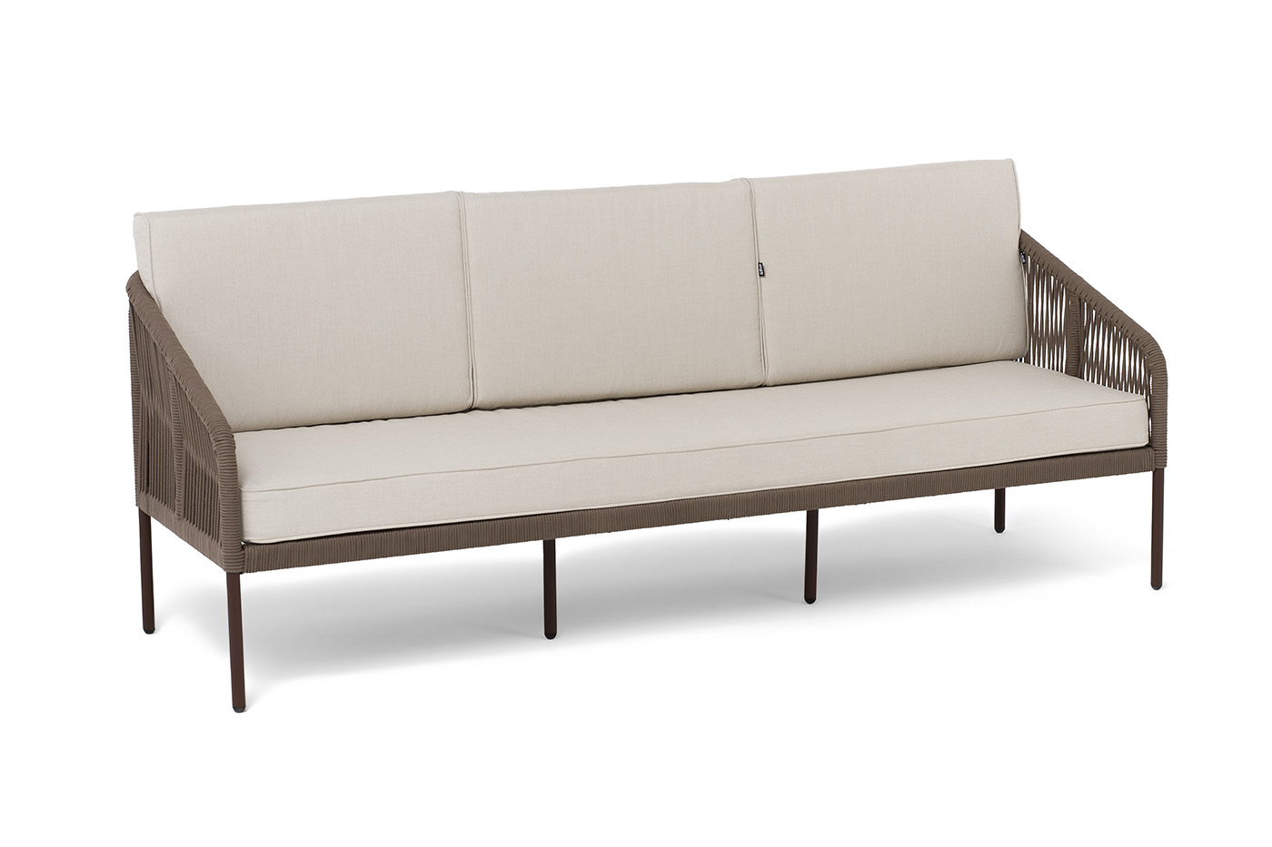 "Канны" диван 3-местный плетеный из роупа, каркас алюминий коричневый (RAL8016) муар, роуп коричневый круглый, ткань бежевая 035
