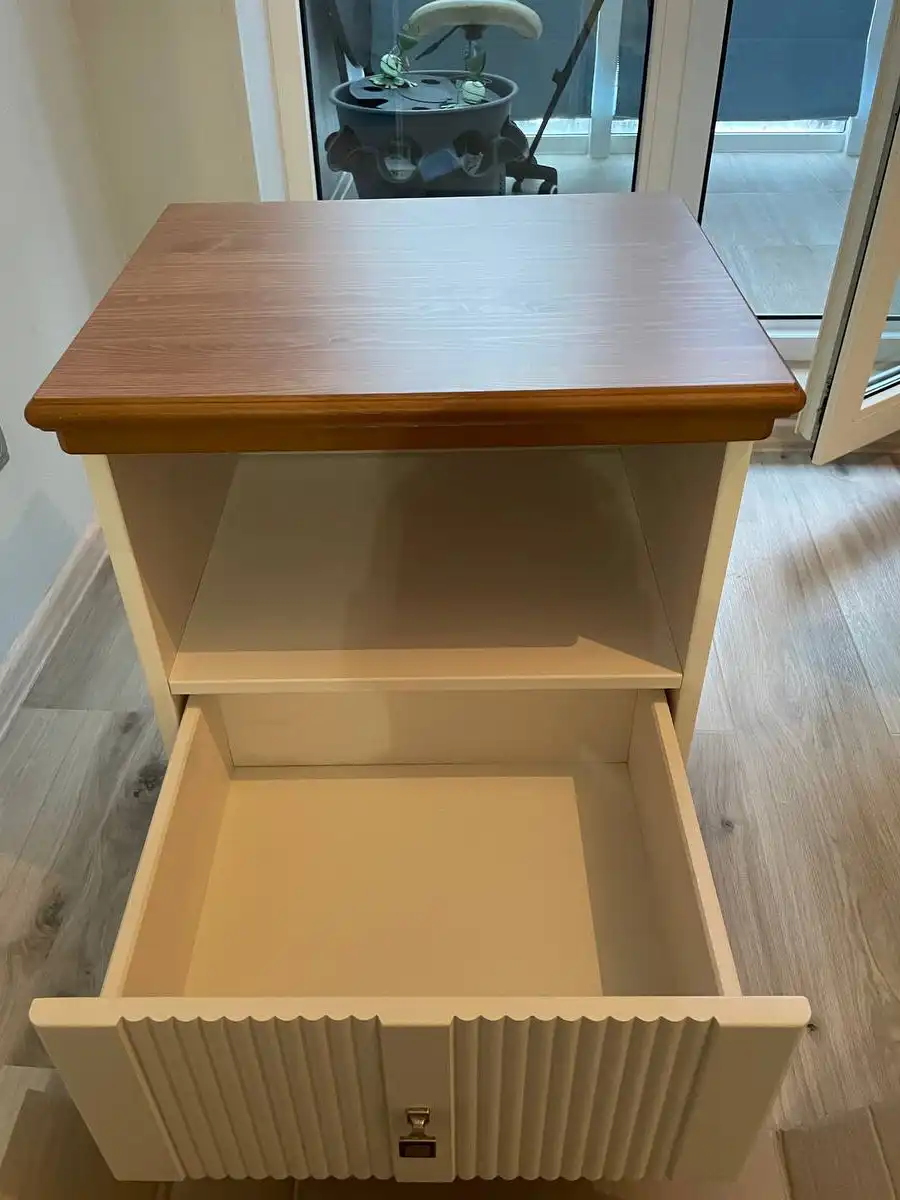 Оснащена одним выдвижным ящиком и открытой полкой для хранения.