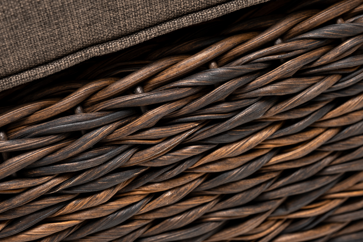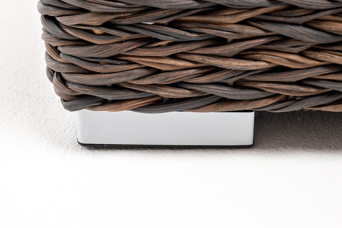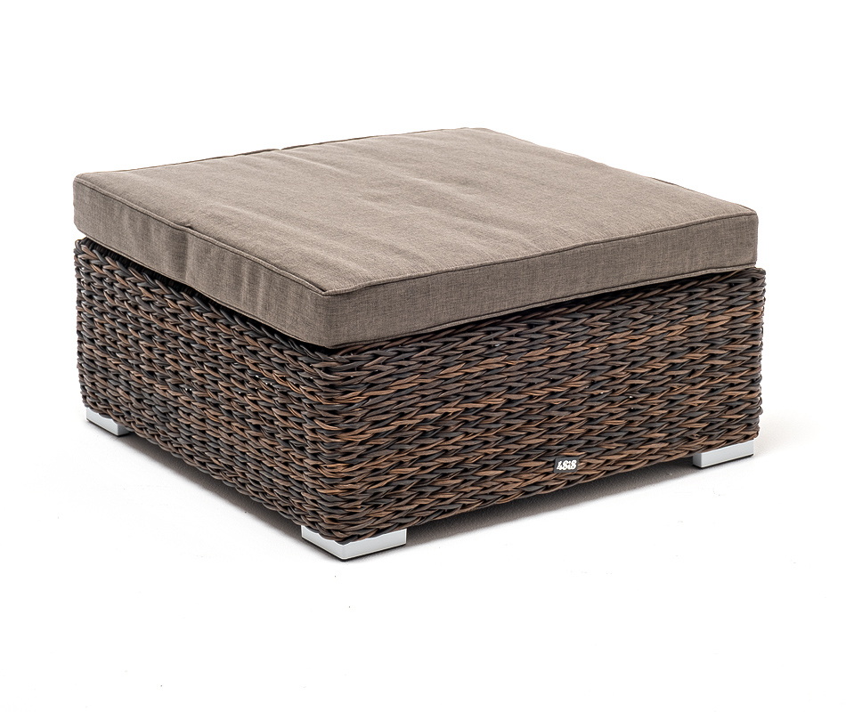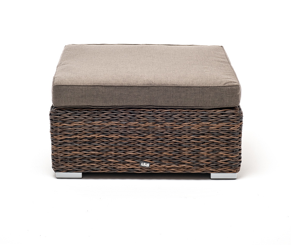 Оттоманка без спинки "Лунджи" представлена в коричневом цвете. Размер модели – 740×740×380 мм. Высота без подушки - 300 мм. Она имеет каркас из алюминия высокой прочности. Для изготовления используется ручное плетение вида "гиацинт", выполненное из искусственного ротанга. Оттоманка может служить в комплекте с трансформирующимся диваном "Лунджи". Предмет мебели дополняется мягкой подушкой в съемном чехле серого цвета. При пошиве берется полиэстер с плотностью 230гр/м2. Предусмотрена влагоотталкивающая пропитка, которая защищает изделие от влаги.