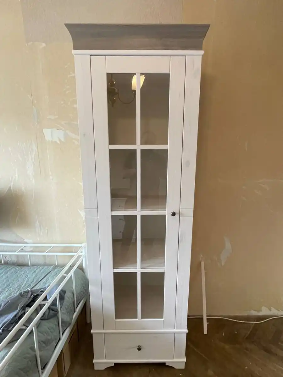 Витрина со стеклянной дверью. Один выдвижной ящик в нижней части и три полки за дверью.