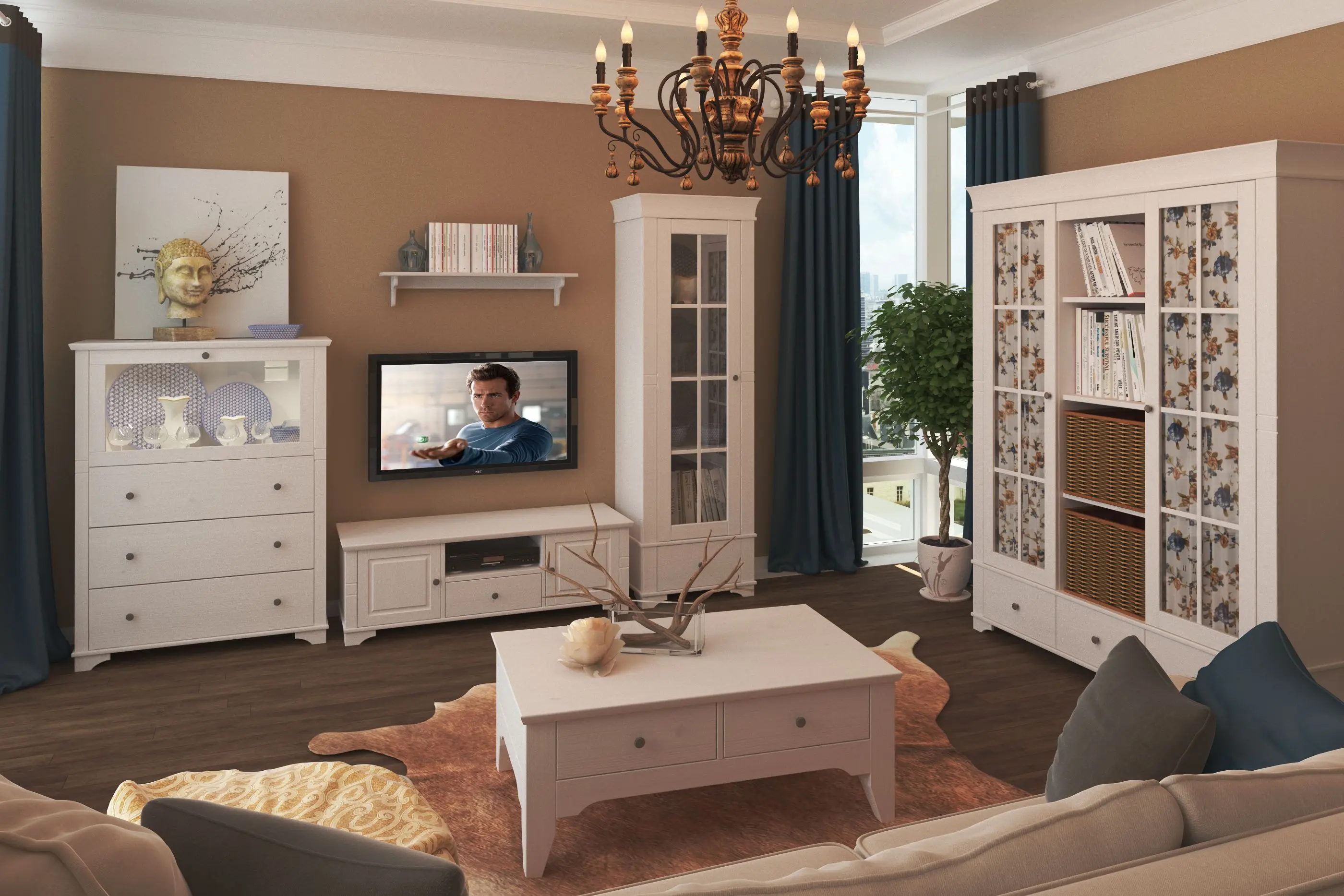 Коллекция производится в трех цветовых вариантах: белый воск, белый воск/антик и белый воск/антрацит. Комбинация цвета подразумевает отделку карниза стеллажа в цвет «антик» или «антрацит» (серый), остальная часть изделия в цвете «белый воск». Структура древесины под покрытием просматривается, что безусловно украшает коллекцию и является показателем натуральности мебели.