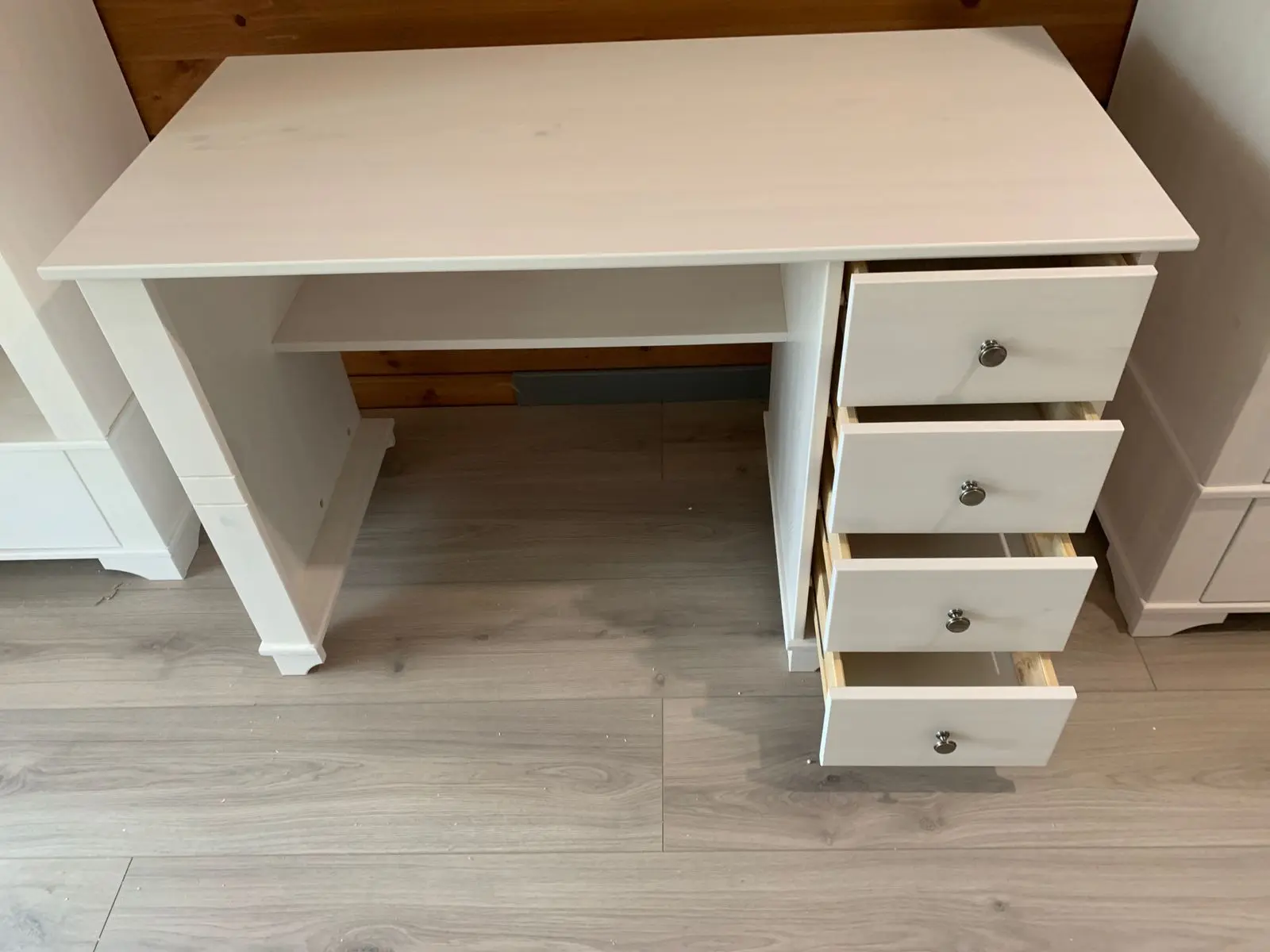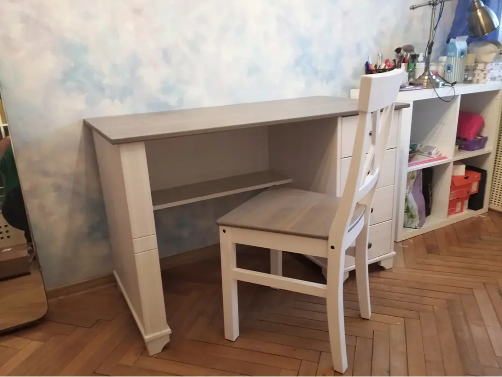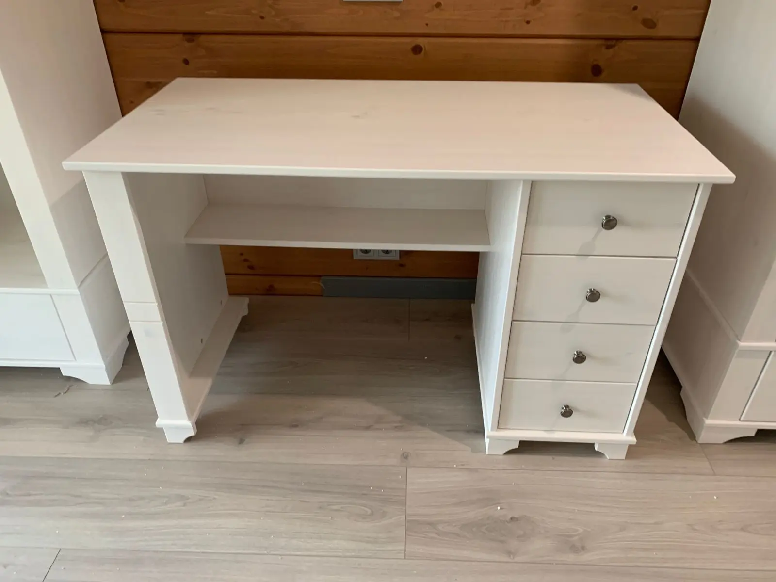 Выдвижные ящики стола на шариковых направляющих. Боковины ящиков выполнены из сосны, не покрыты лаком, но качественно отшлифованы. Дно ящиков - ДВП белого цвета. Также есть полка под столешницей, как дополнительное место хранения. Тумба стола устанавливается как слева, так и справа. Задняя стенка тумбы с ящиками - ДВП, а задняя стенка стола, где полка, массив сосны.