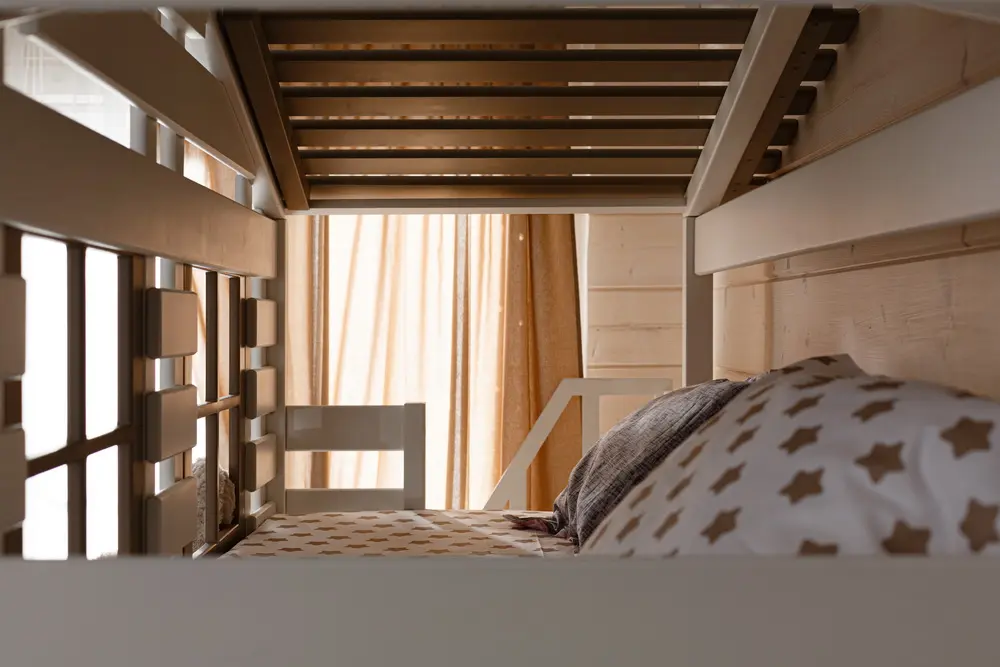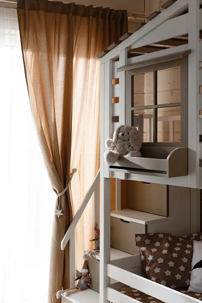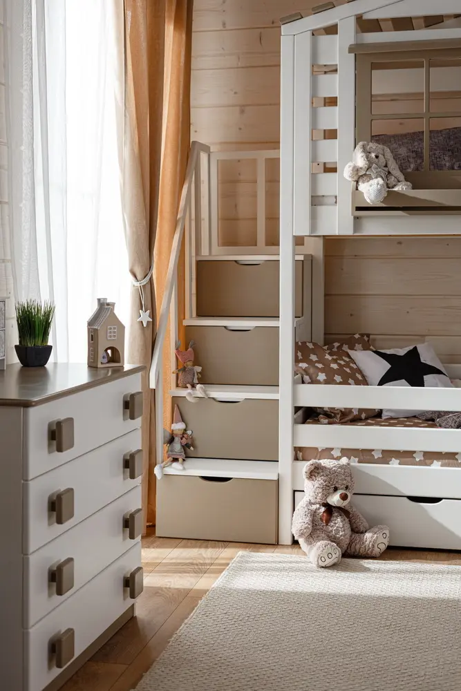В комплект входит деревянный настил и комод-лестница, которые обеспечивают удобство и безопасность при подъёме на второй этаж.