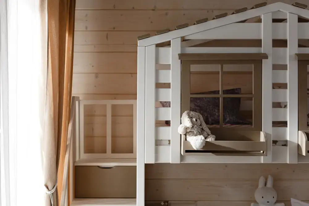 Кровать-домик имеет два яруса, что позволяет разместить двух детей или использовать верхний этаж как пространство для игр.