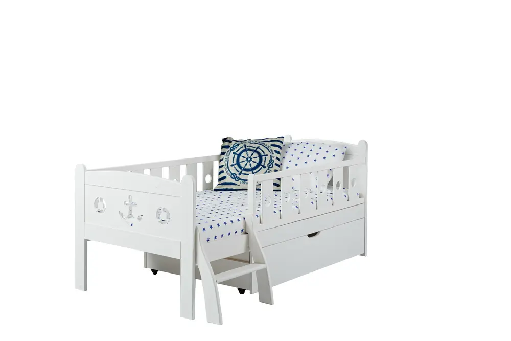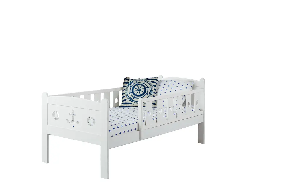 В данной кровати могут быть два вида декоративных элементов: «корона» и «якорь». Если выбран «якорь», то на спинке будет якорь, а на бортике круглые отверстия. Если выбрана «корона», то на спинке будет корона, а на бортике сердечки. Декоративные элементы выполнены из МДФ, что придаёт кровати стильный и современный вид.