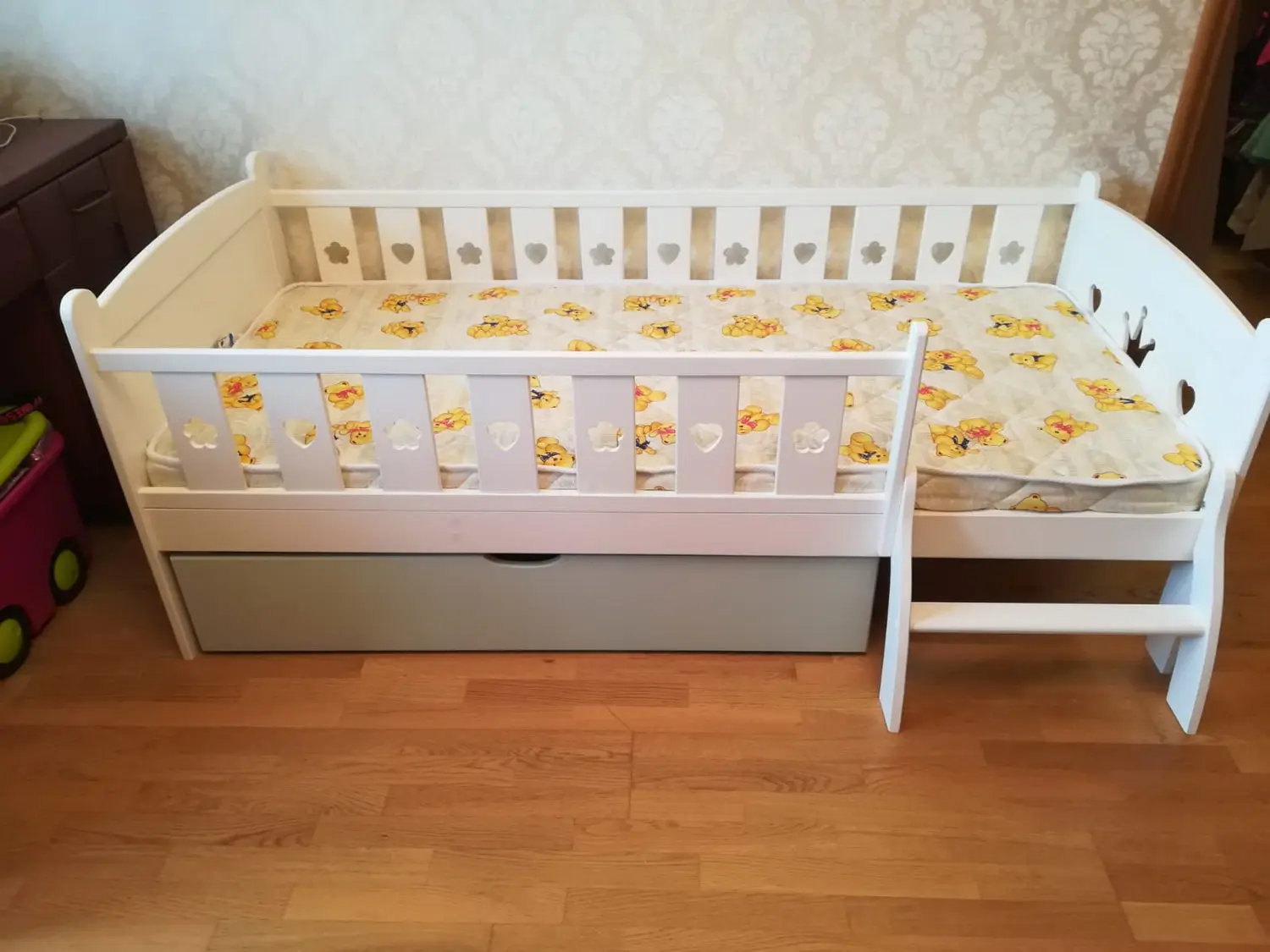Кровать комплектуется передними бортиками. Можно заказать один длинный или два коротких. Это поможет предотвратить падение ребёнка во время сна.