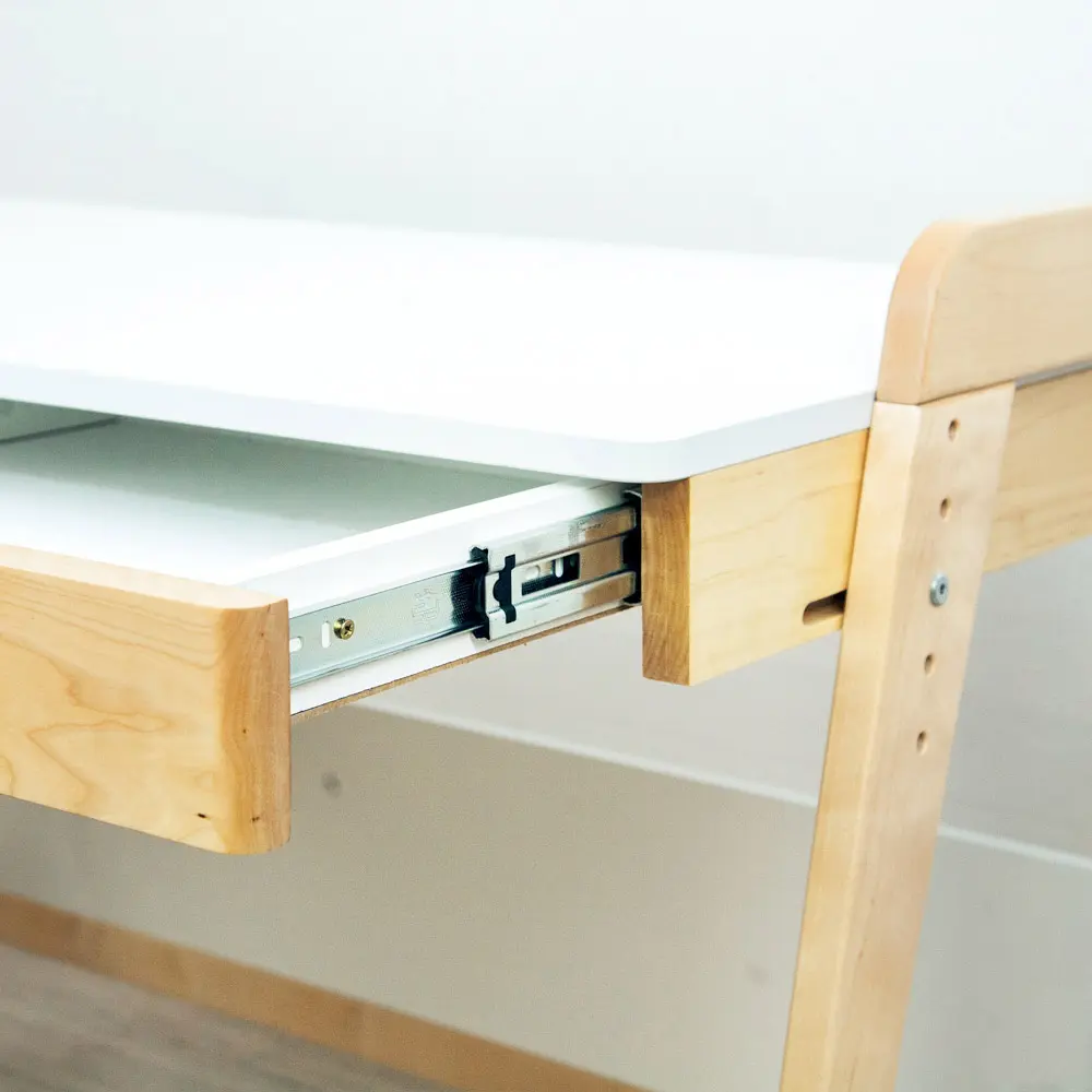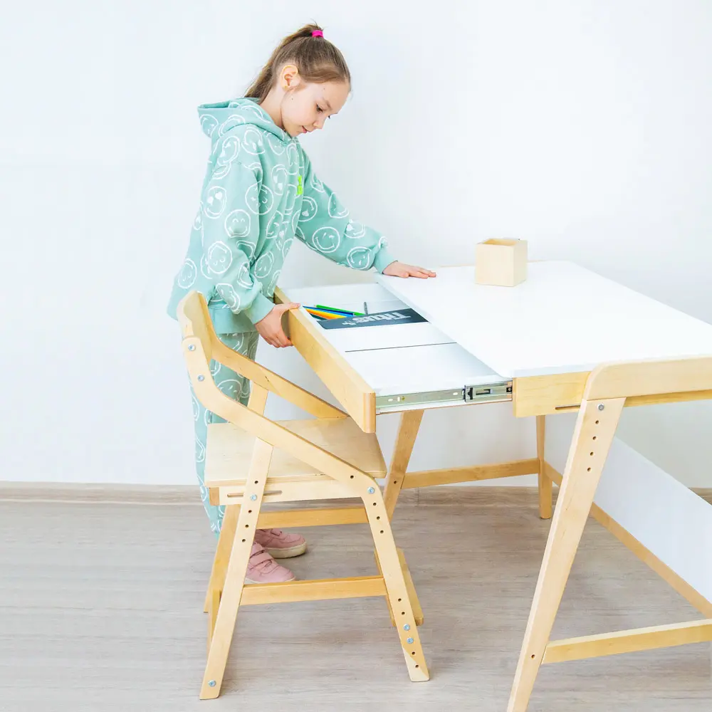 Стол легко регулируется по высоте, позволяя настроить его под рост ребёнка. Это помогает сохранить правильную осанку, снизить утомляемость и обеспечить комфорт во время занятий. Для удобства хранения небольших канцелярских принадлежностей и тетрадей предусмотрен выдвижной ящик.