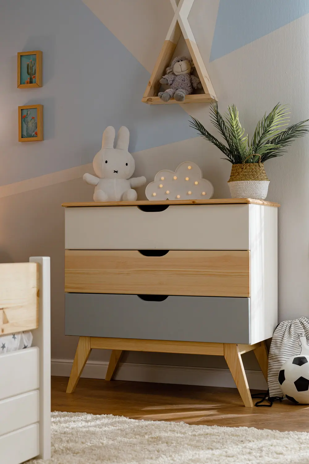 Коллекция мебели из натурального дерева включает в себя детские кровати, комоды, столы, стеллажи, шкафы и тумбы. Для изготовления корпусов и фасадов используется массив сосны, который отличается прочностью и долговечностью. Дно выдвижных ящиков и задние стенки шкафов и комодов изготавливаются из ДВП, что обеспечивает дополнительную прочность конструкции.