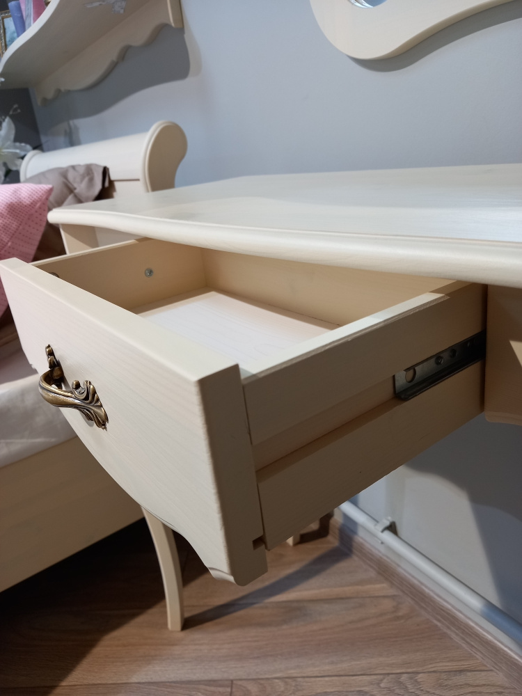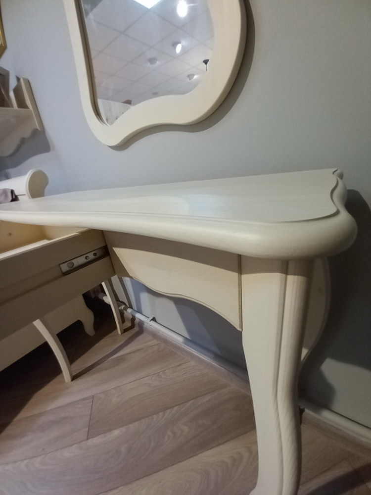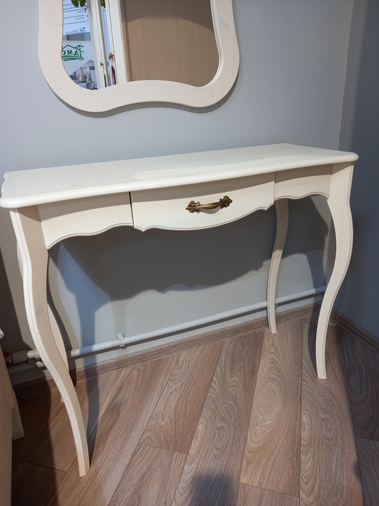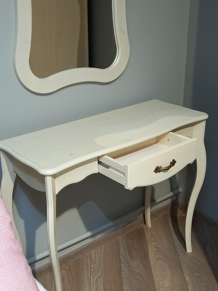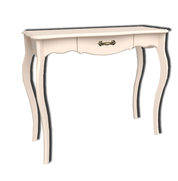 Стол Лебо туалетный – это маленький личный уголок, который должен быть у каждого дома. Здесь можно поправить прическу, нанести макияж, хранить косметику, украшения и разные аксессуары. У стола есть выдвижной ящик на шариковых направляющих для нужных предметов. Дизайн стола выдержан в общем стиле коллекции «Лебо», что позволяет спланировать гармонично все пространство помещения. Такой изящный стол принесет в мебельную обстановку очарование и комфорт. Не забудьте подобрать к столу зеркало. Зеркала представлены как в коллекции «Лебо», так и отдельным разделом. Изделие изготовлено из массива сосны. Цвет – бежевый воск, бежевый воск/антик. Комбинация цвета бежевый/антик подразумевает отделку столешницы в цвет «антик», остальная часть изделия в цвете «бежевый».