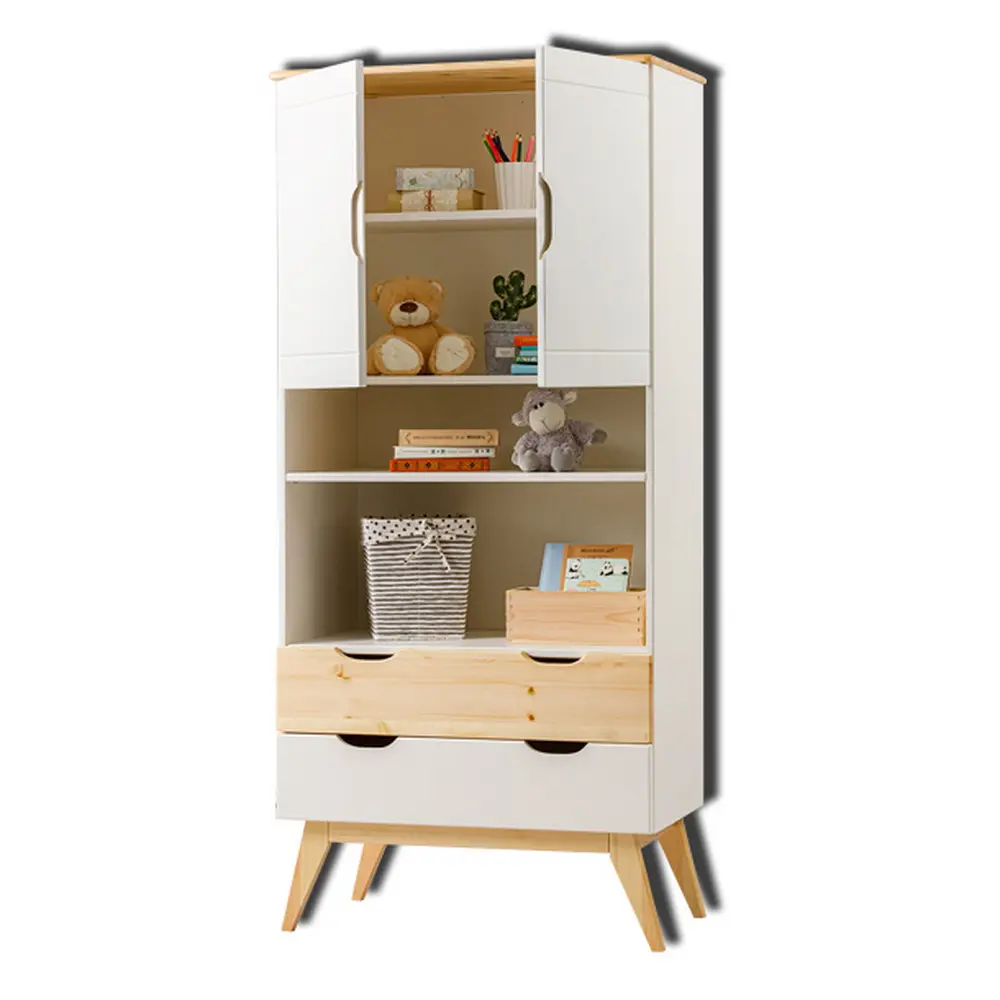 Размеры фасадов стеллажа составляют 177х798 мм (2 шт.), двери имеют размер 398х617 мм (2 шт), полки — 764х400 мм. Глубина ящиков составляет 350 мм, высота стенок ящиков — 110 мм. Высота ножек с горизонтальной планкой — 240 мм. Материал — сосна, задняя стенка и дно ящиков выполнены из ДВП белого цвета. Фурнитура без доводчиков. Ручки по выбору — деревянные кнопки (по умолчанию), кружки, квадраты, сердечки, запилы (на фото).