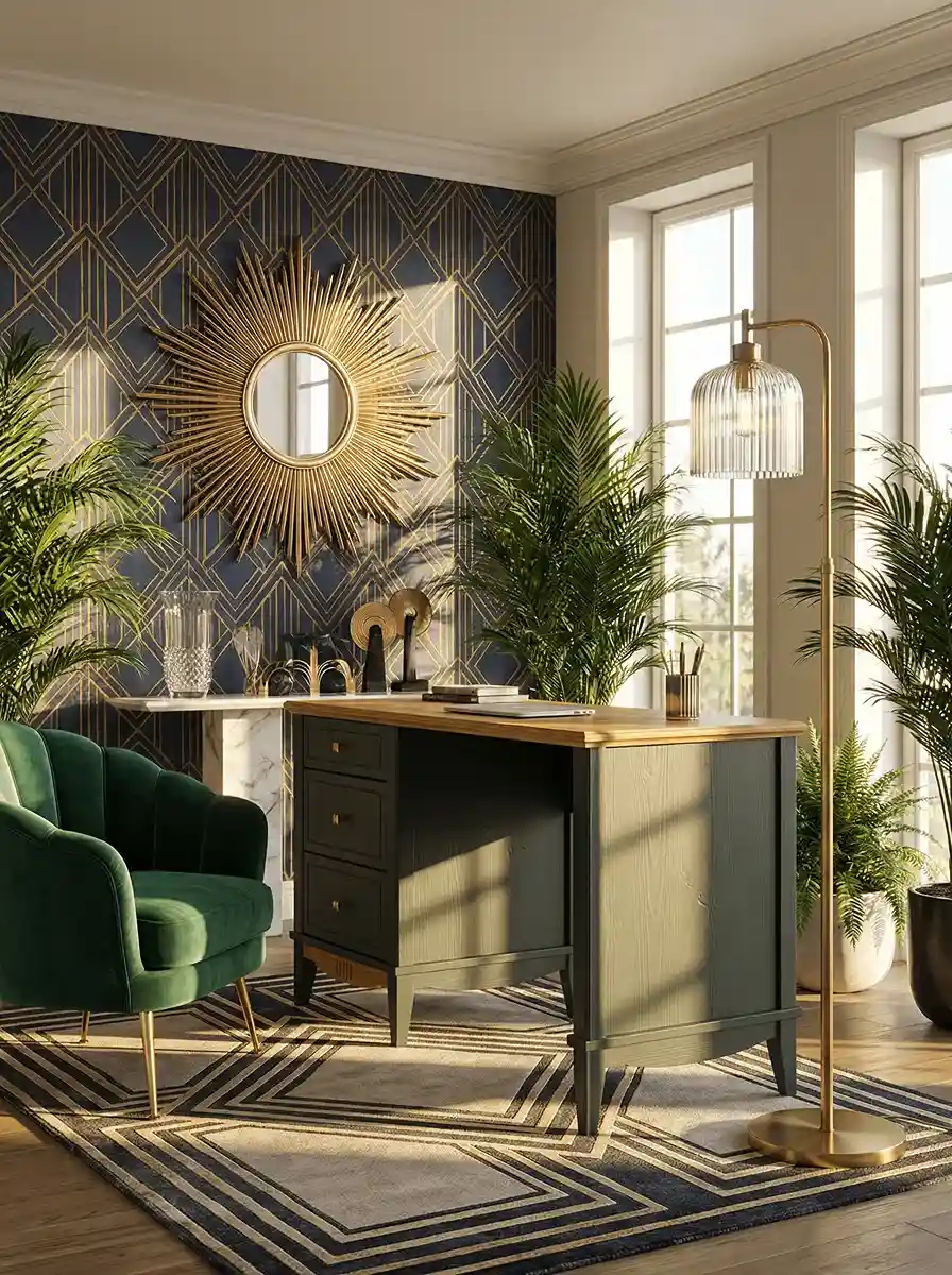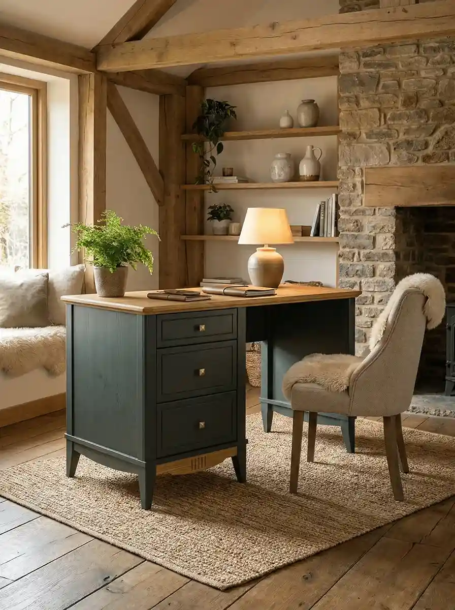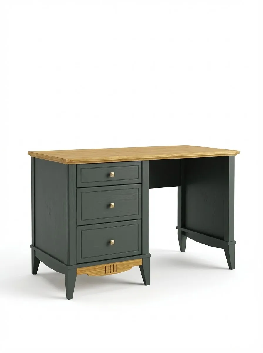 Столешница и нижняя декоративная планка под тумбой окрашены в цвет антик (светло-коричневый), через него просматривается текстура дерева. Корпус и фасады окрашены в зеленый цвет. Можно заказать эту же модель стола в отделках «серый/антик», «черный/антик» и «белый/антик». Для окрашивания применяются матовые лаки на водной основе от шведской компании Becker Acroma. Лаки соответствуют европейским стандартам качества, не пахнут и не провоцируют аллергию.