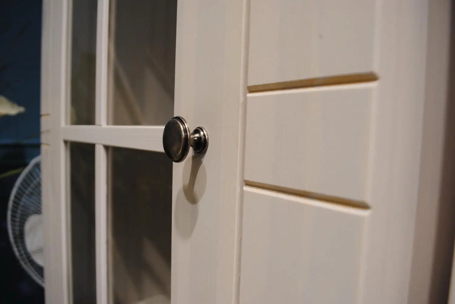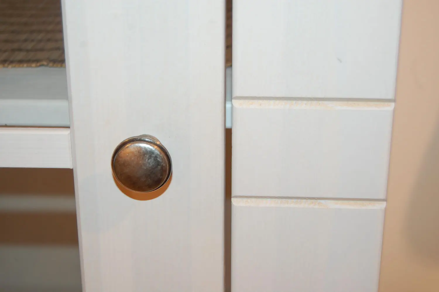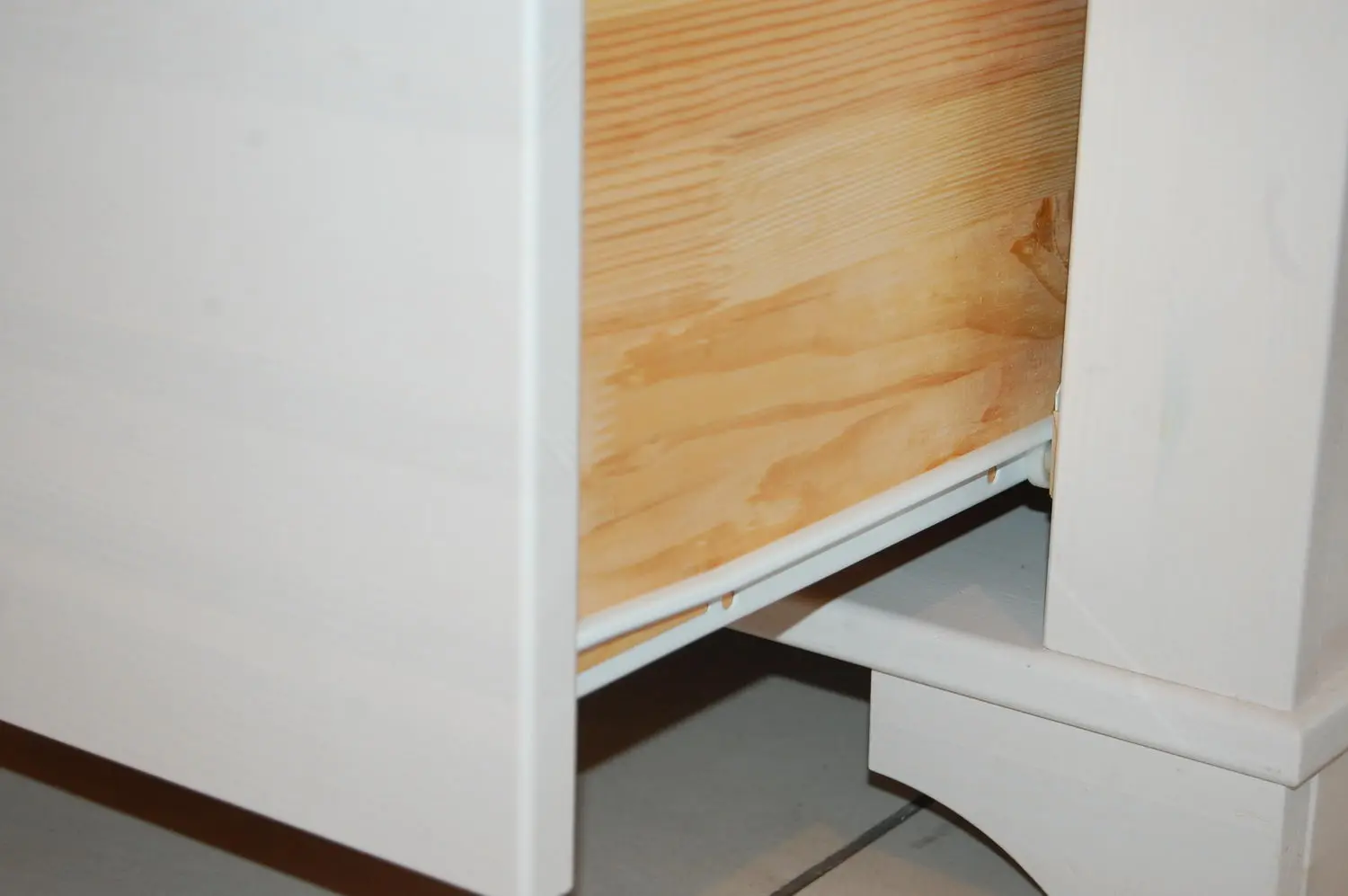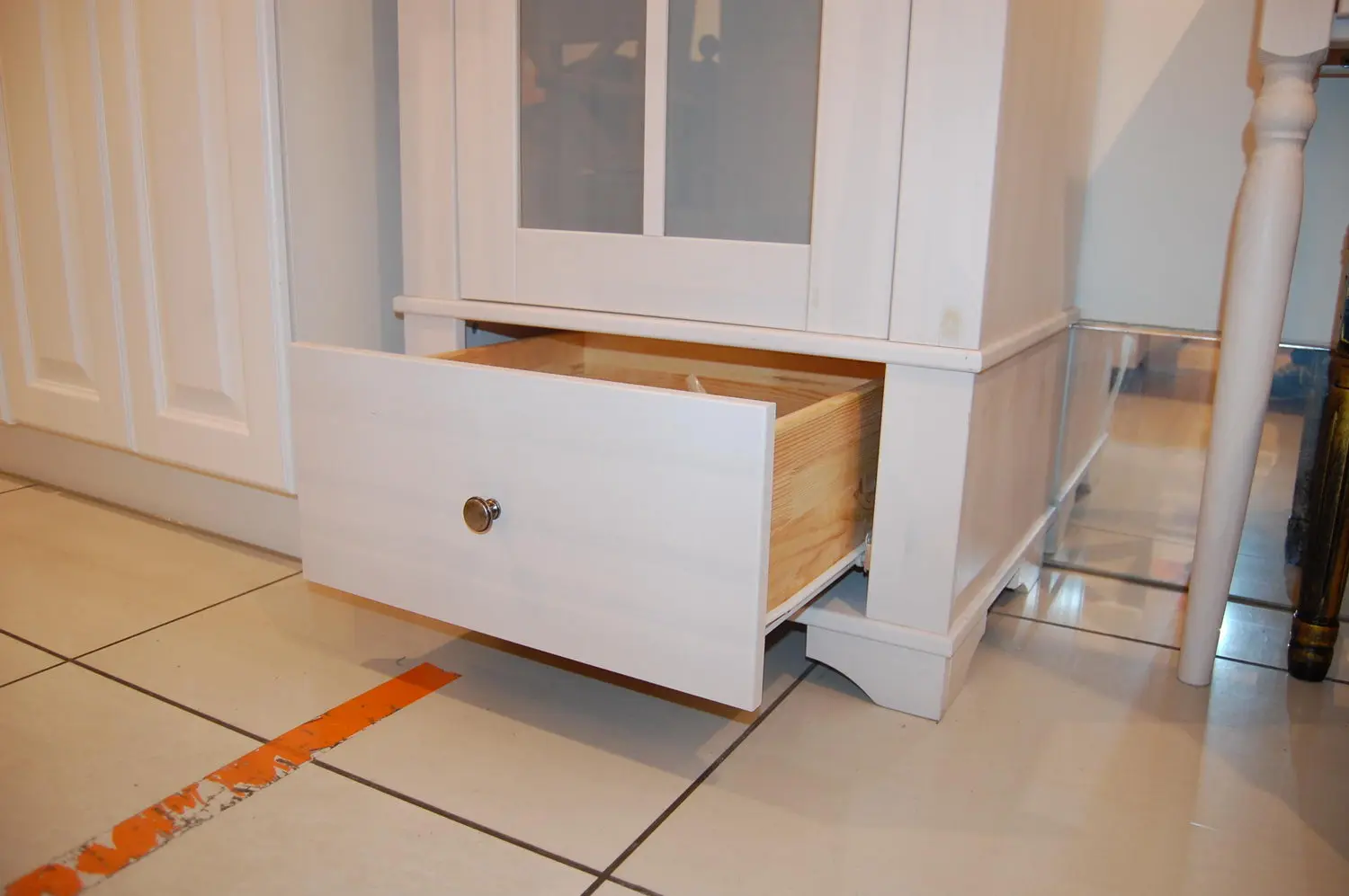 Витрина имеет стеклянную дверь и ящик. Внутри, за дверью 3 полки, которые можно регулировать по высоте. Направляющие ящика роликовые, частичного выдвижения. Внутренние части выдвижных ящиков выполнены из сосны, не покрыты лаком, но качественно отшлифованы. Дно ящика и задняя стенка витрины ДВП белого цвета.