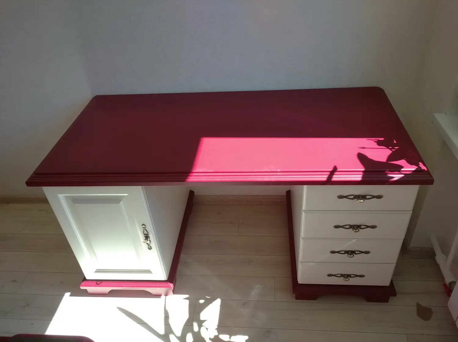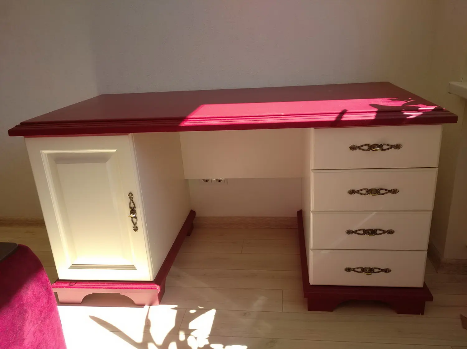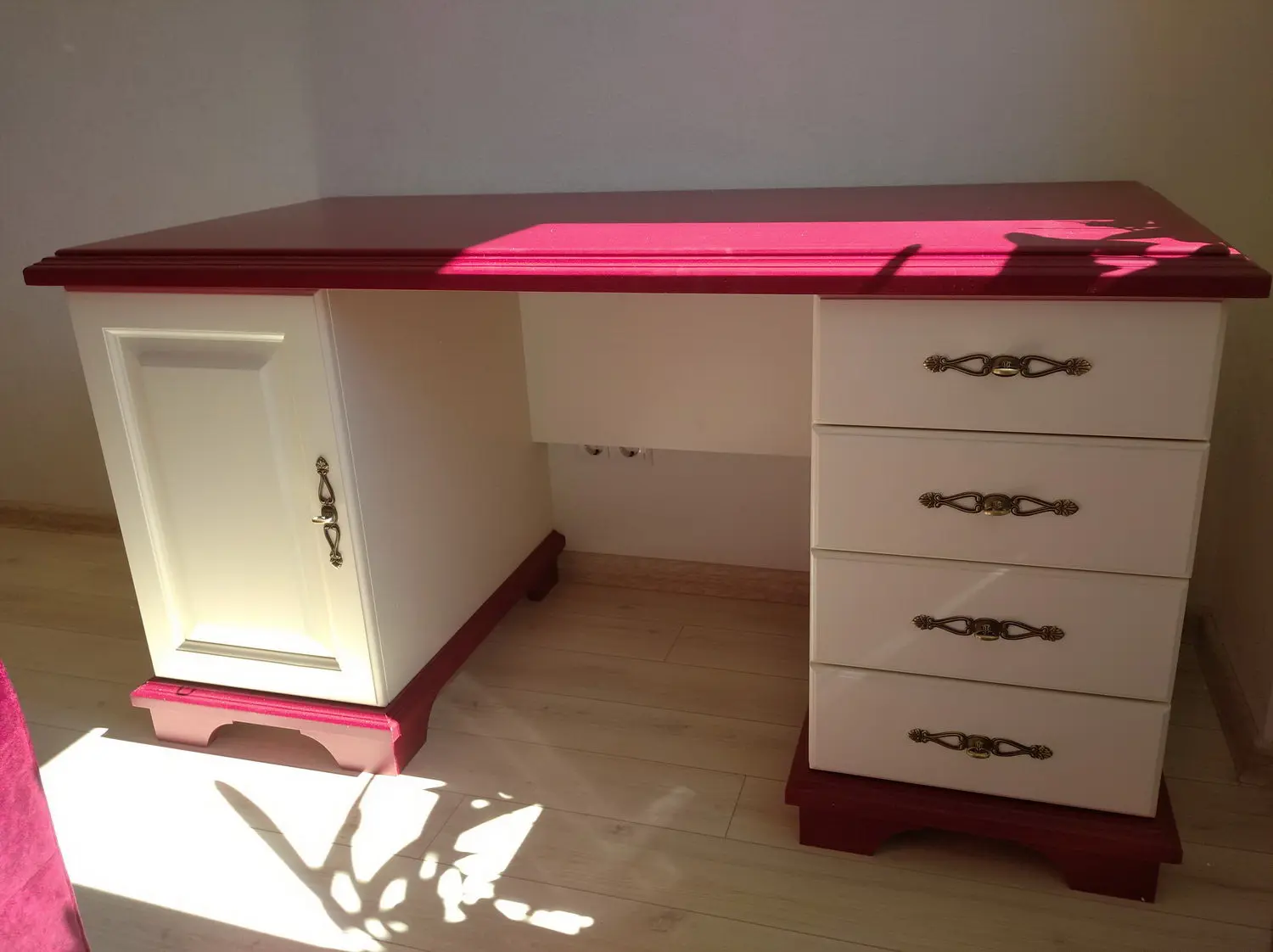 Внутренние боковины ящиков красятся в цвет лицевой панели. Задние стенки стола, а также дно ящиков, выполнены из белого двп.