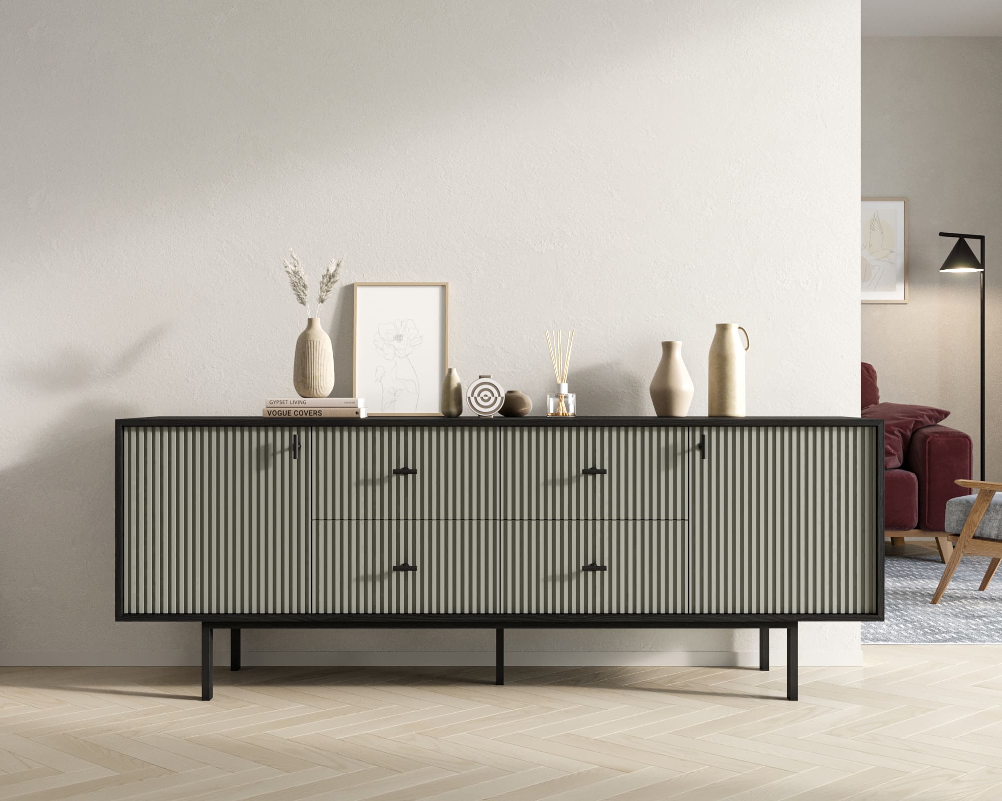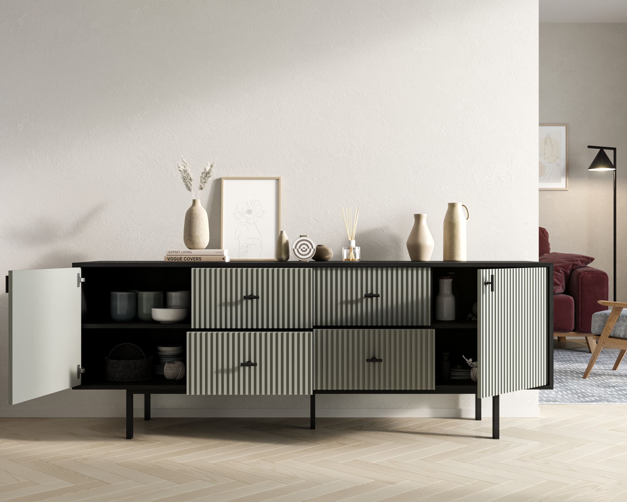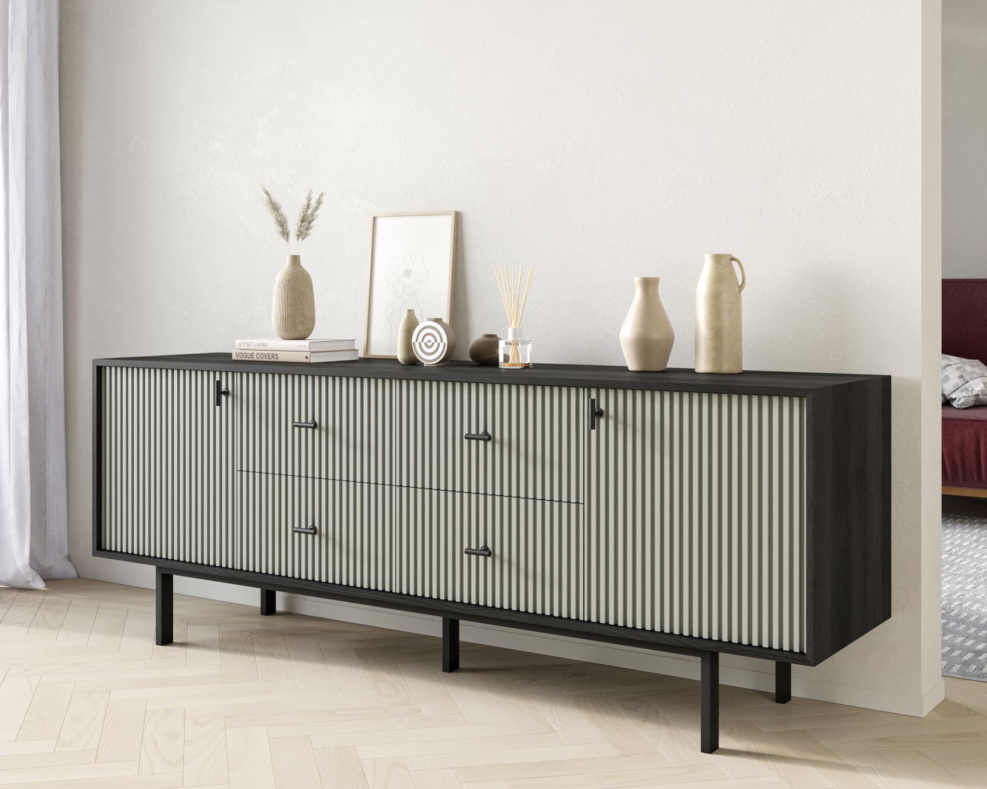 Мы предлагаем различные варианты исполнения: с фасадами или с фасадами и ящиками. Петли с доводчиком обеспечивают плавное закрывание дверей, а шариковые направляющие без доводчика позволяют легко выдвигать ящики. Комод поставляется в сборе, что упрощает его установку.