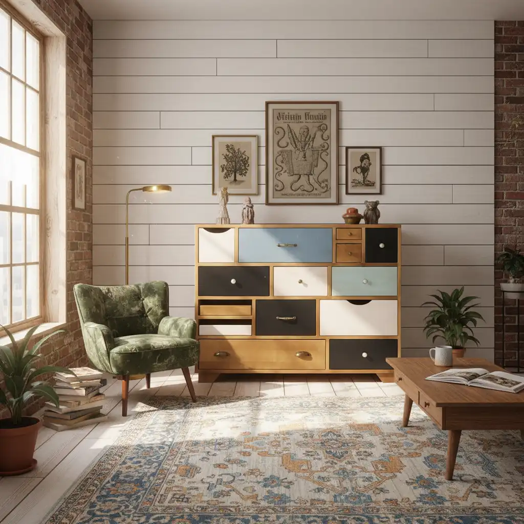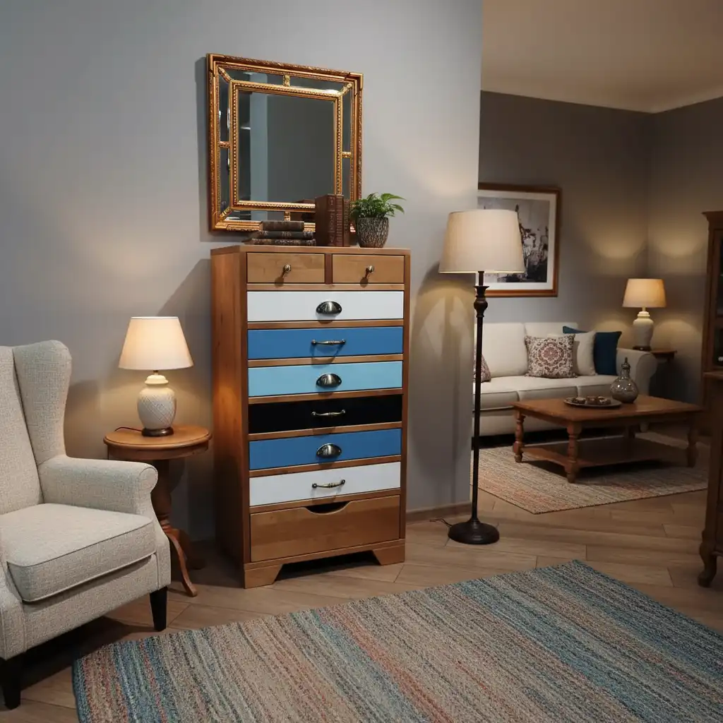 Дизайнерская мебель для гостиной «Акварель» выделяется оригинальными разноцветными фасадами и красивой фурнитурой с эффектом старения. Это мебель для тех, кто экспериментирует с интерьером и хочет добавить в него что-то необычное. В коллекцию входят маленькие и большие комоды с ящиками и дверцами, стеллажи, консоли.