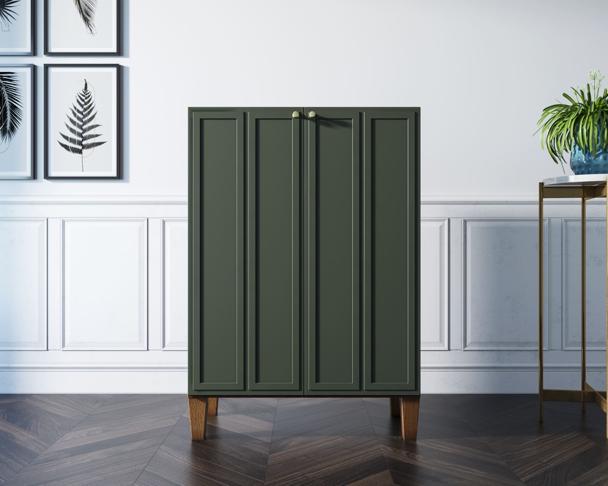 Основательность конструкции придают фасады с прямыми рамками и ножки из массива ясеня в цвете орех. Фасады имеют приятный зеленый оттенок.