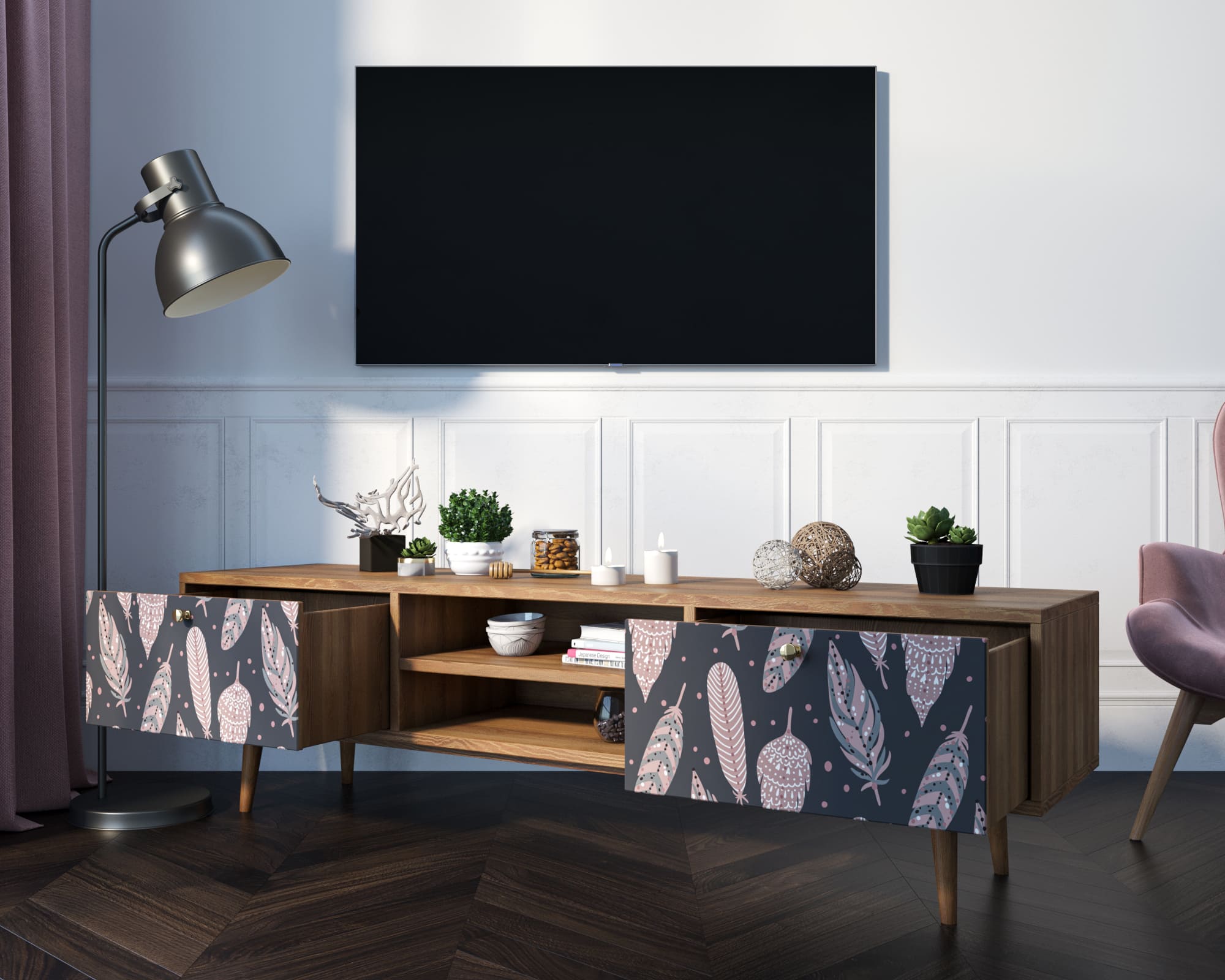 Комод под TV Berber имеет две дверцы, украшенные дизайнерским принтом и центральную нишу, разделенную съемной полкой. Ножки изготовлены из массива ясеня.