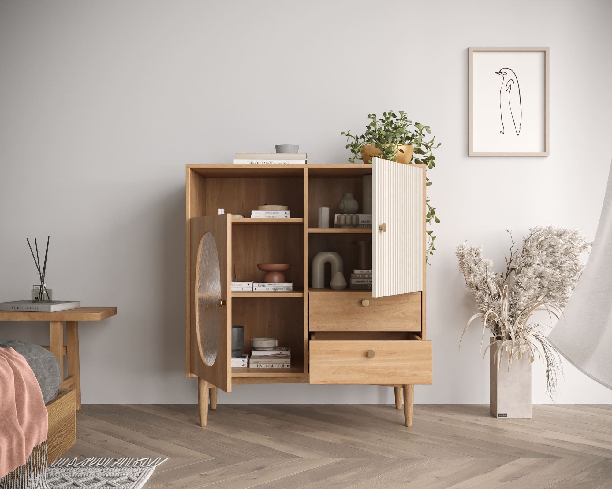 Ножки комода высокие и выполнены из ясеня, что придает ему элегантный и элегантный вид.