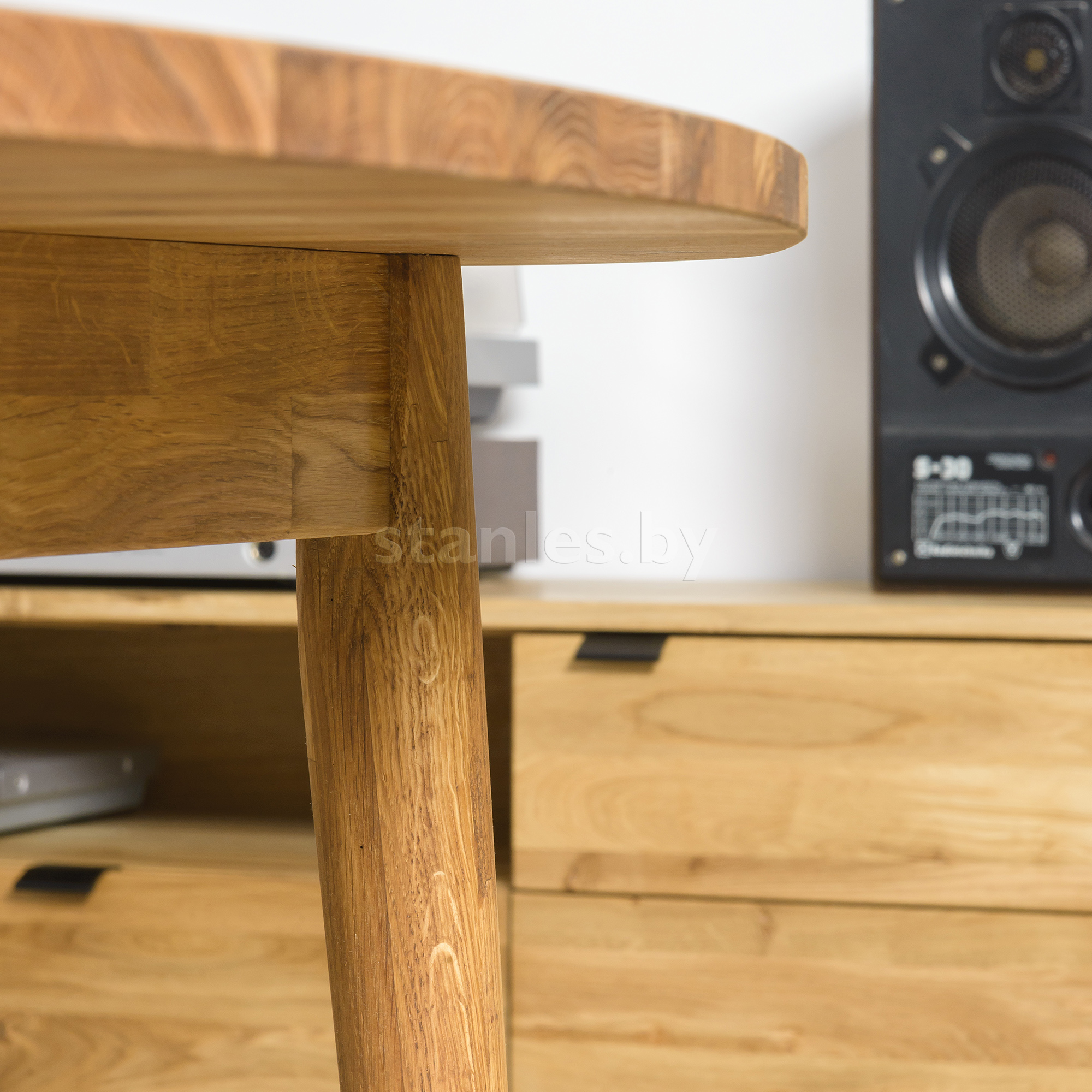 Столик изготовлен из натурального и долговечного материала – массива дуба. Доступно шесть вариантов отделки: бейц-масло, дуб отбеленный, дуб паркетный, дуб венге, тёмная вишня и итальянский орех. Вы можете выбрать тот вариант, который лучше всего подойдёт к вашему интерьеру. Высокие ножки стола устойчивы, расположены наклонно. Габариты стола 1310х1291х750 мм, вес 35 кг. Гарантия на стол составляет 1 год.