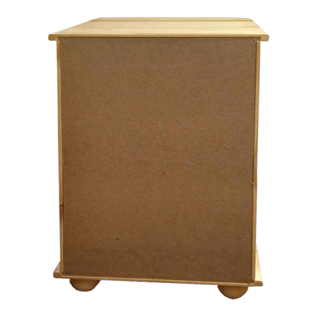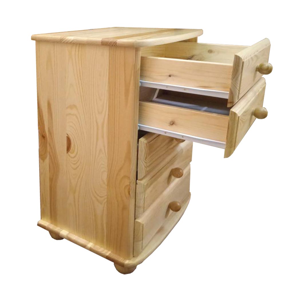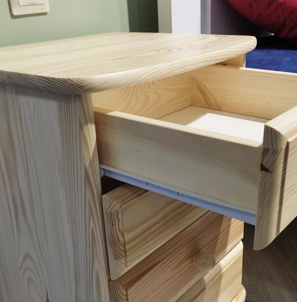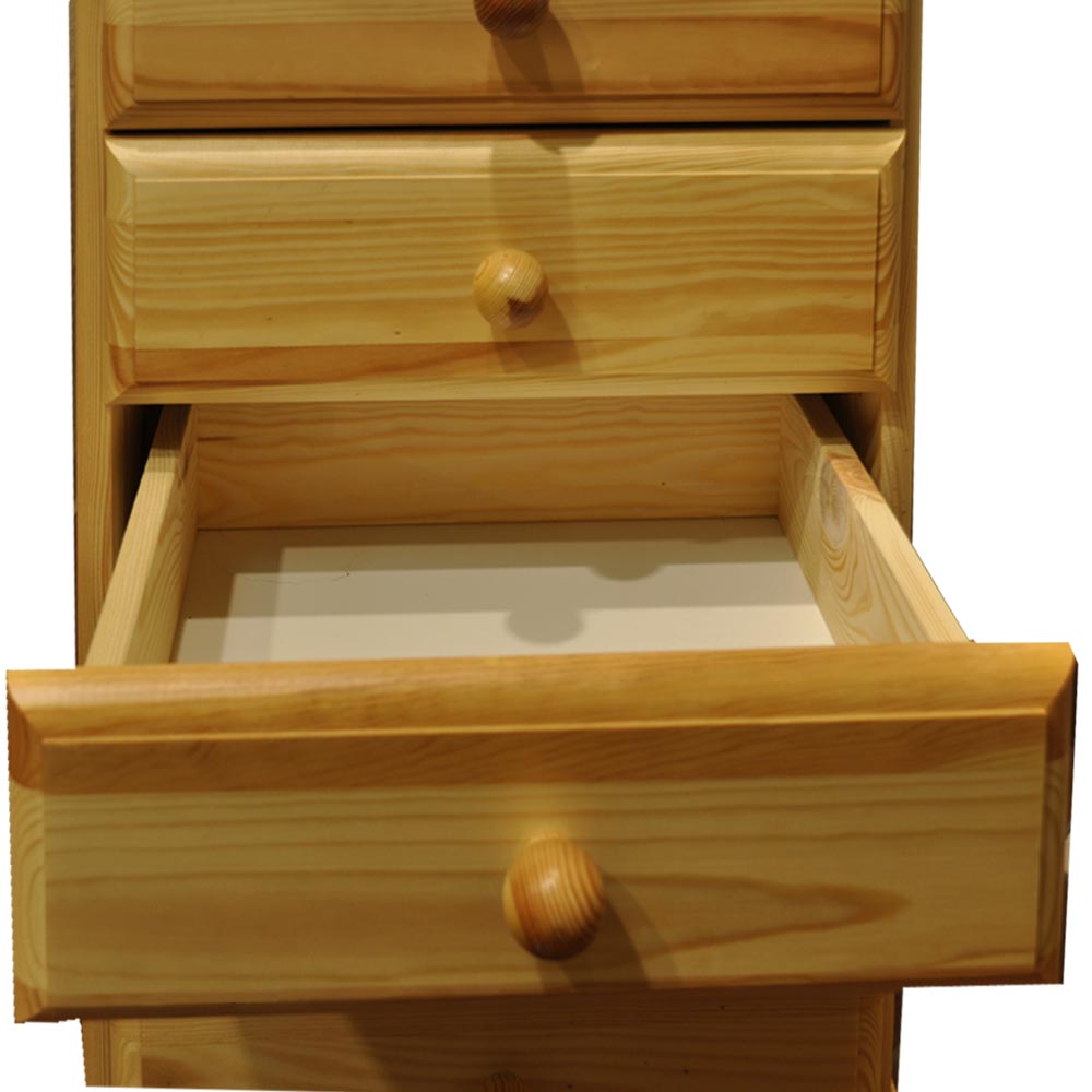 Все лицевые фасады комода, изготовлены из бессучкового массива, путём ручной сортировки сырья. Комод имеет привлекательный и неброский вид, а его классические линии будут уместны как в спальне (прикроватная тумба), детской комнате, так в гостиной и даже в маленькой прихожей. Ящики комода на роликовых направляющих частичного выдвижения (на 22 см.) имеют небольшую глубину, и вы легко найдёте нужную вам вещь. Высота лицевой панели ящика 12,8 см, а высота внутренних боковин ящика 8 см. Дно ящиков изготовлено из ДВП белого цвета. а направляющие выдерживают нагрузку 20 кг. Задняя стенка комода - ДВП серого цвета.