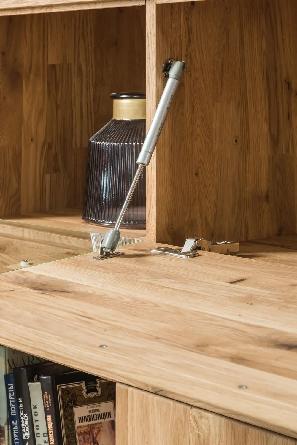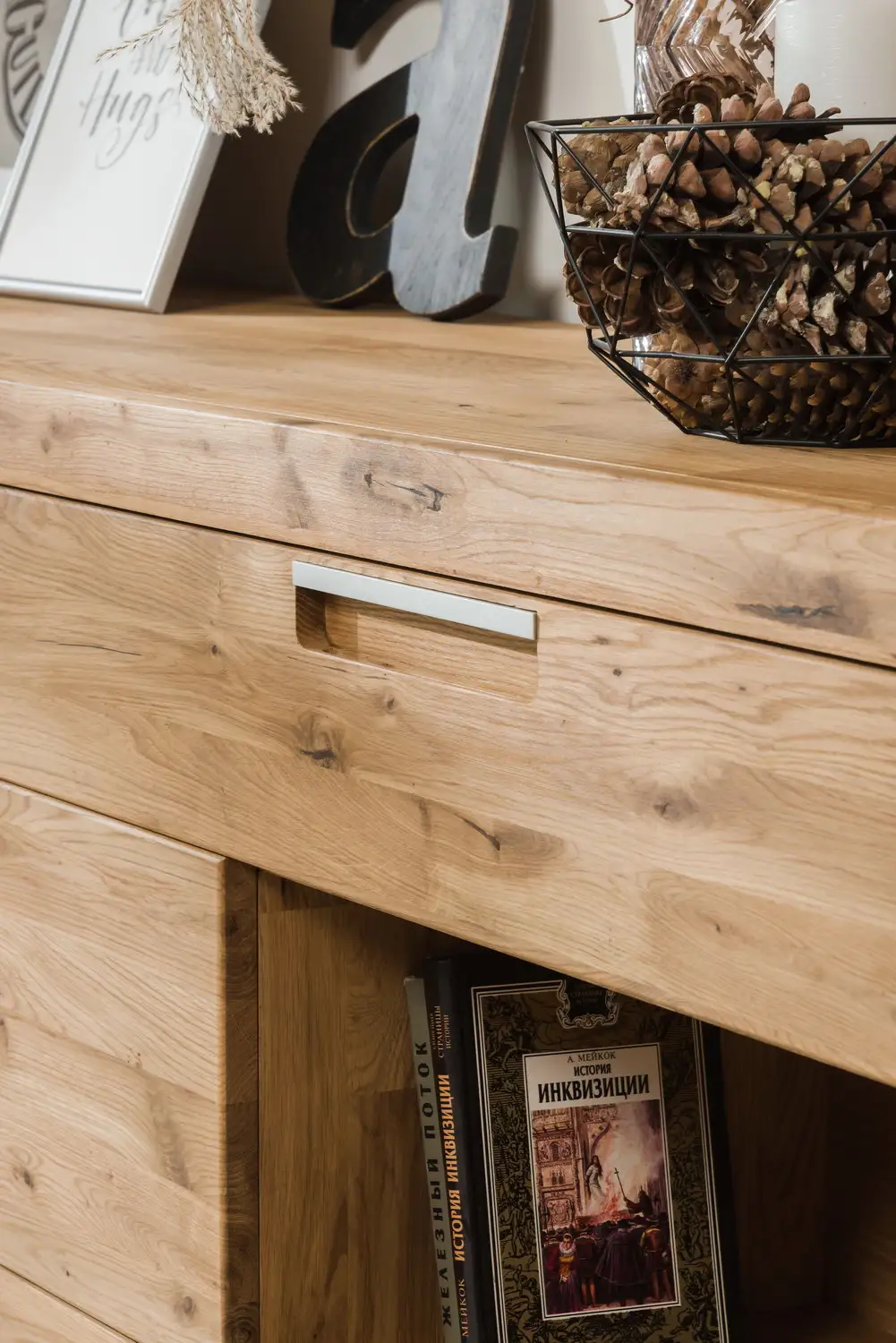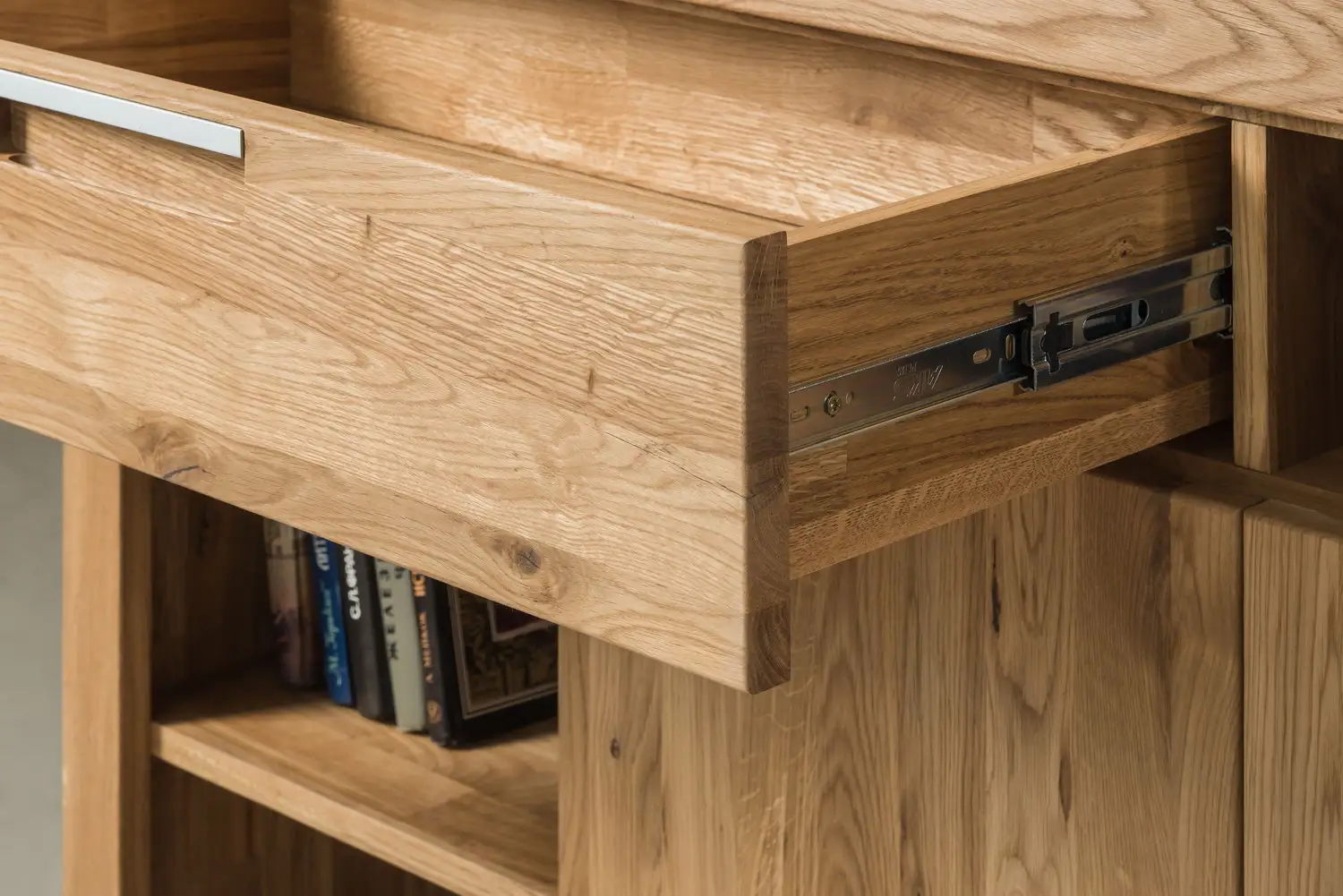 Корпуса, полки и фасады выполнены из массива дуба, задние стенки – из фанеры в шпоне дуба. Ящики устанавливаются на надежных шариковых направляющих с доводчиками для мягкого бесшумного задвигания. Дверные петли также имеют доводчики. Металлические ручки утоплены в фасады.