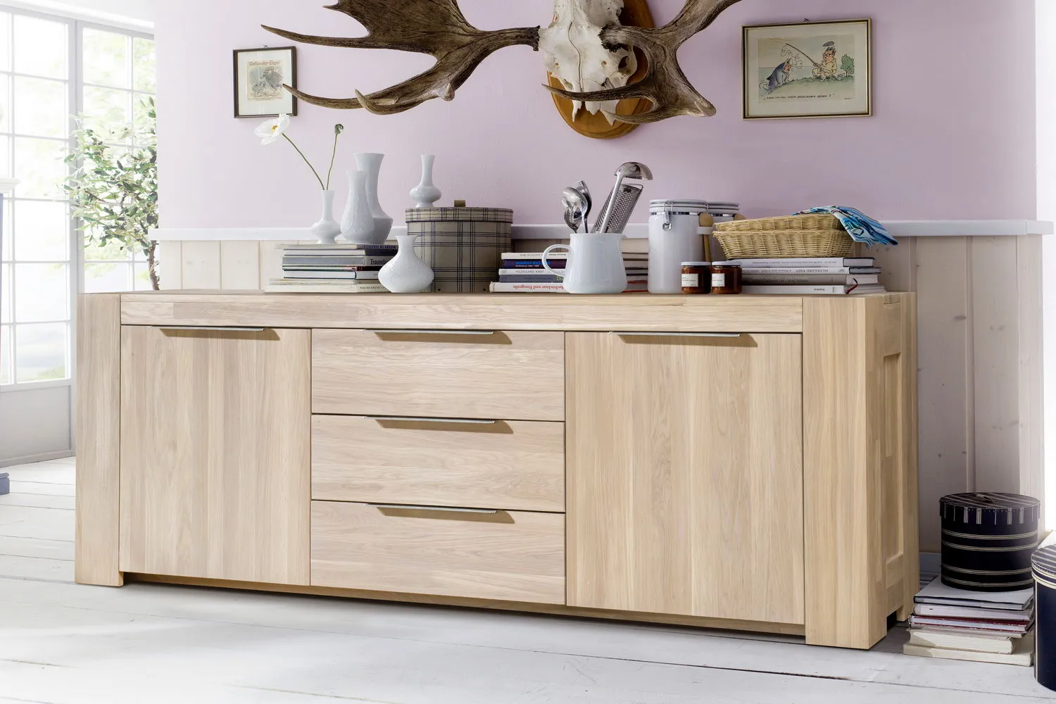 Для изготовления корпусов и фасадов используется массив дуба высокого качества. Задние стенки изделий и донья ящиков производятся из фанеры с облицовкой шпоном дуба. Ящики монтируются на шариковых направляющих со встроенными доводчиками для плавного задвигания. Дверные петли тоже имеют доводчики. На ящиках и дверцах тонкие ручки из металлического профиля, ручки почти не заметны на фасадах.