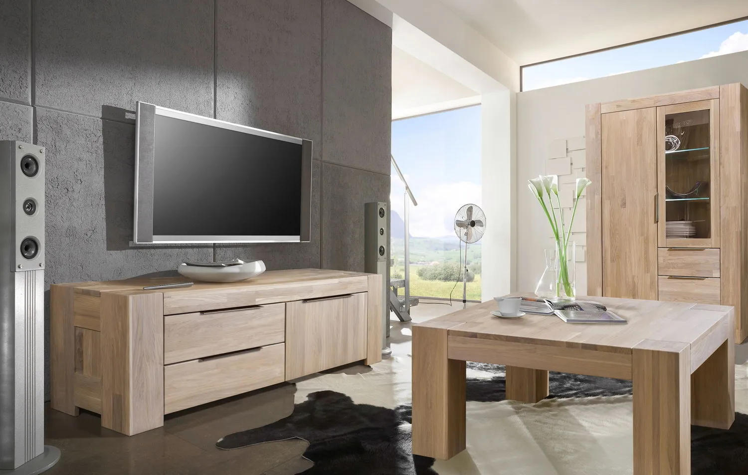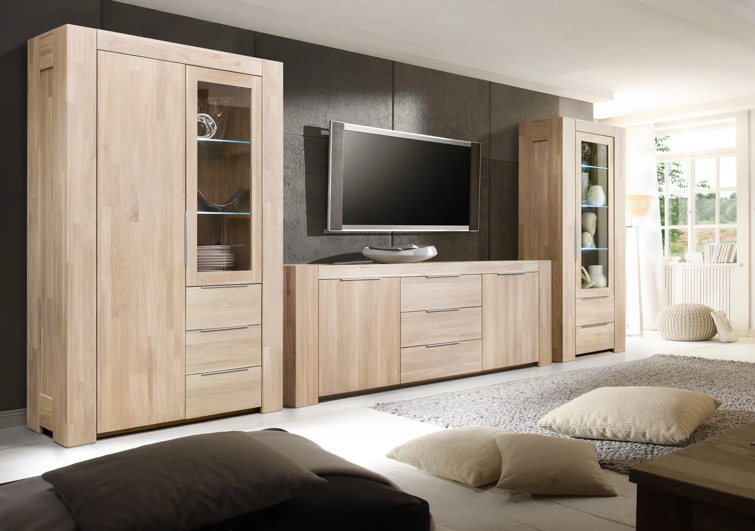 Мебель для гостиной «Фьорд» отличается простыми массивными формами, но при этом не выглядит тяжеловесной. В дизайне подчеркиваются естественные древесные цвета и текстура. В коллекцию входят шкаф с остекленной витриной, буфет, тумба ТВ, комод с ящиками, журнальный стол.