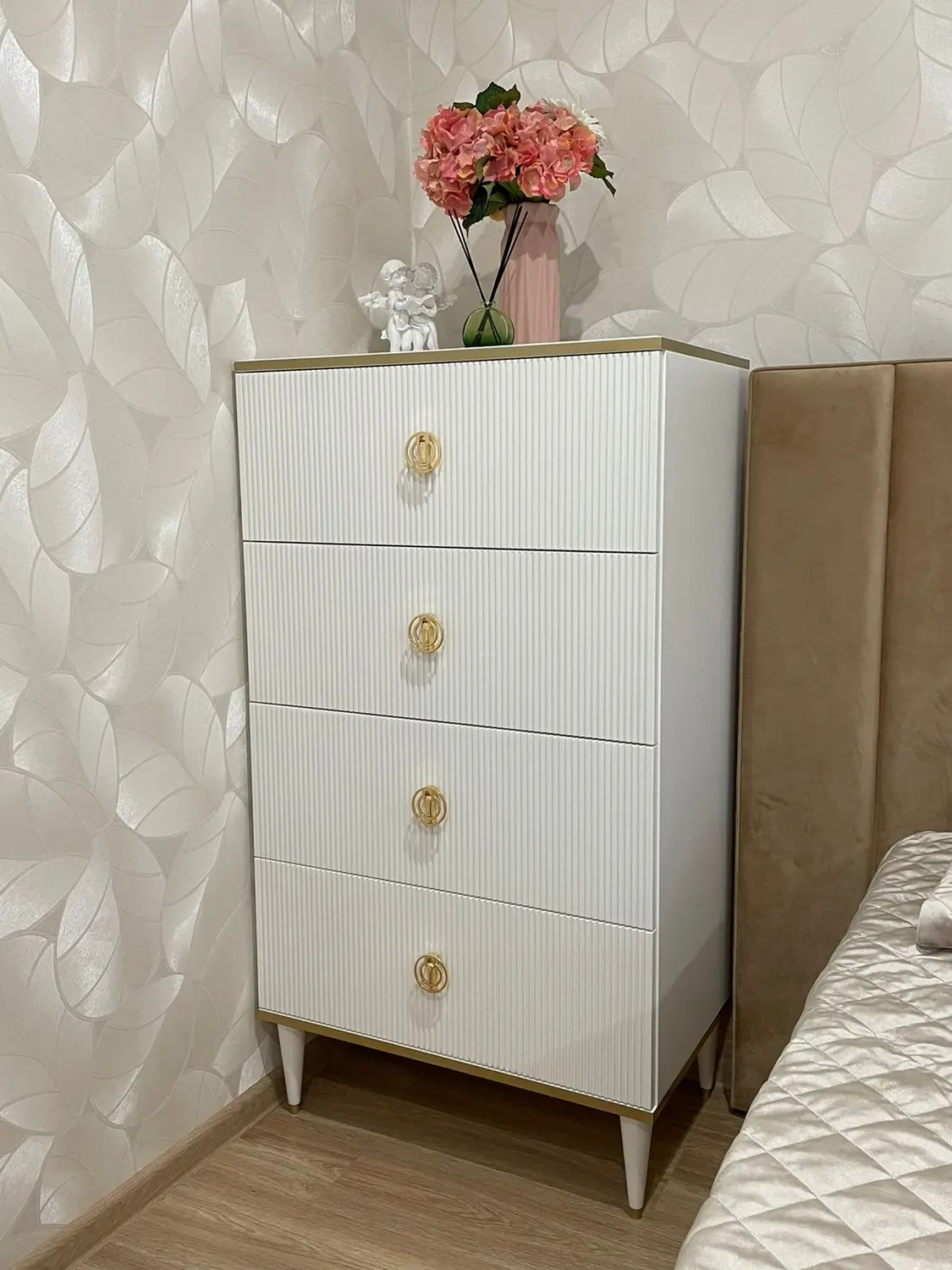 Фрезерованные фасады изящно сочетаются с металлическими ручками, ножки с золотой каймой завершают элегантный стиль модели.