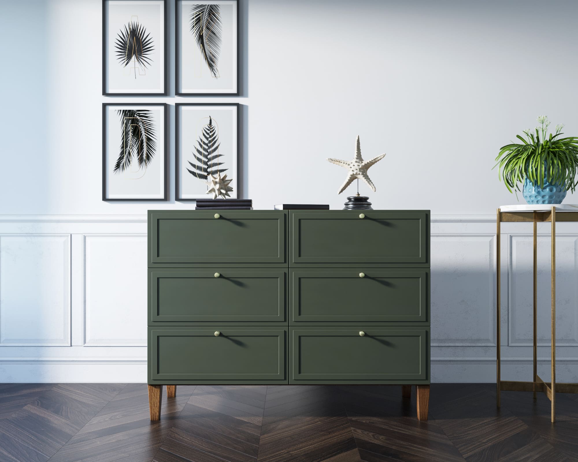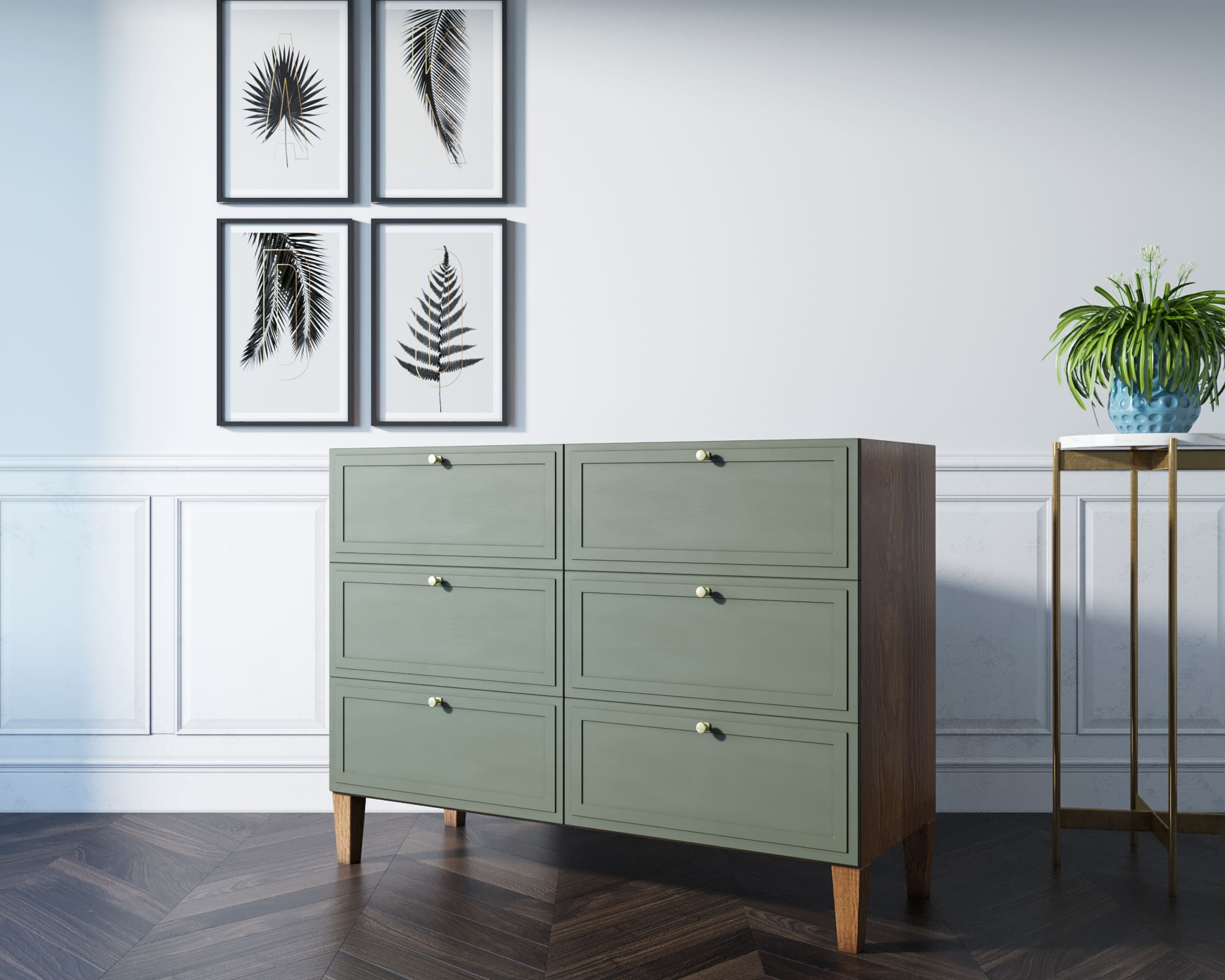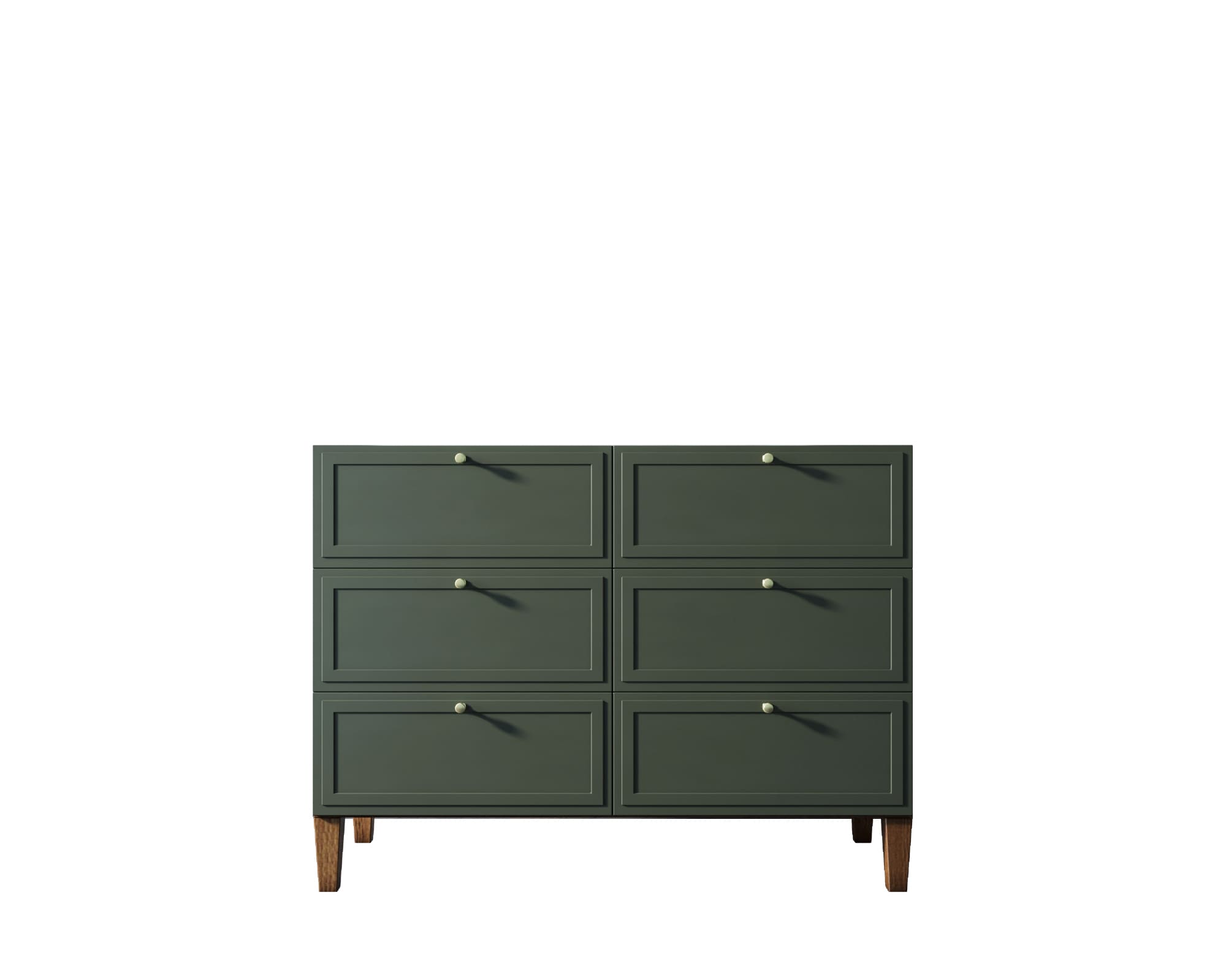 Основательность конструкции придают шесть фасадов с прямыми рамками и ножки из массива ясеня в цвете орех.