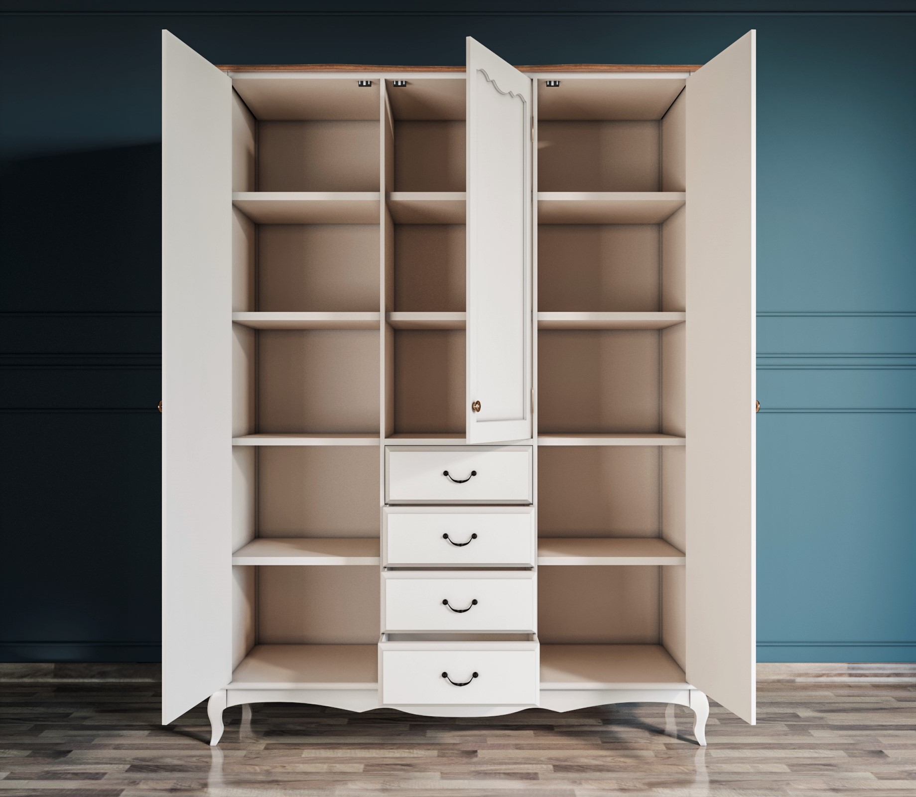 За тремя створками скрываются вместительные полки для хранения одежды в сложенном виде