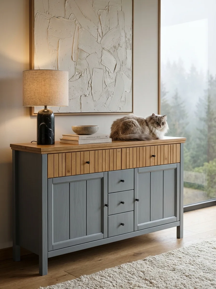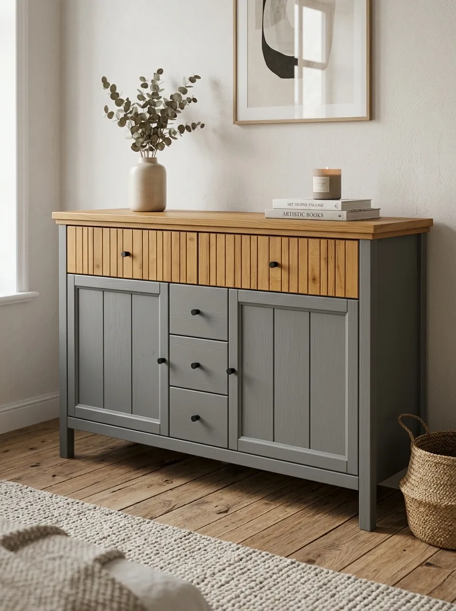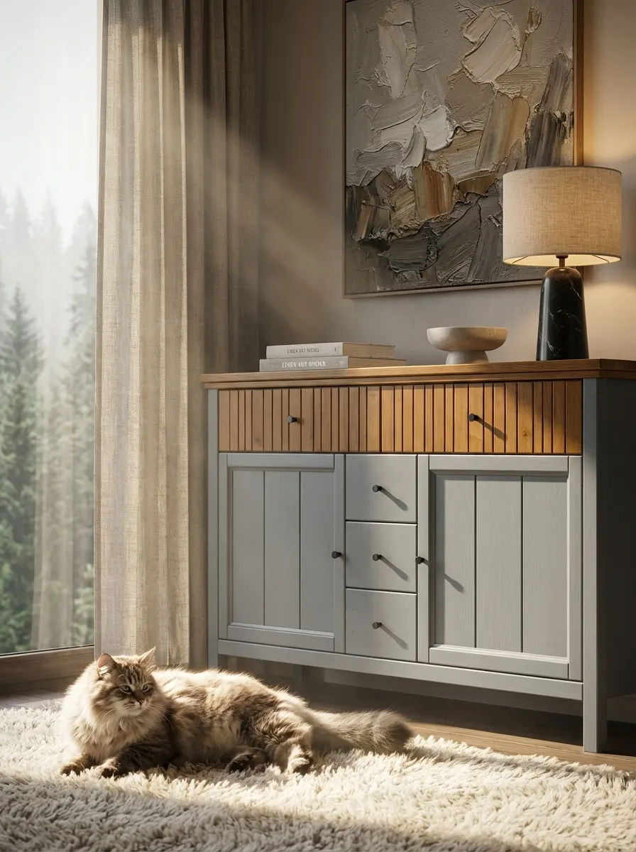 Тумба «Сканди 232» имеет пять ящиков на шариковых направляющих фирмы «Hafele» и две глухие дверки, за каждой из которых расположена полка. Это позволяет удобно хранить различные предметы, сохраняя порядок в комнате.