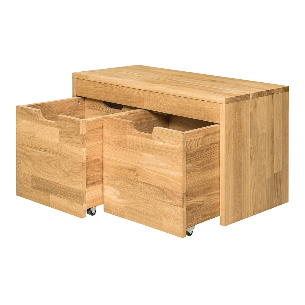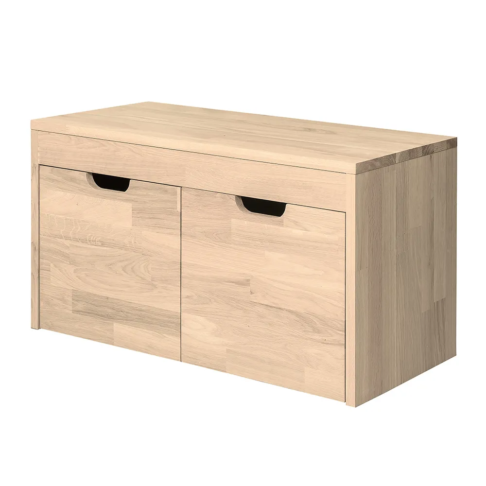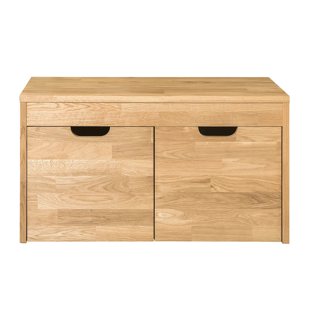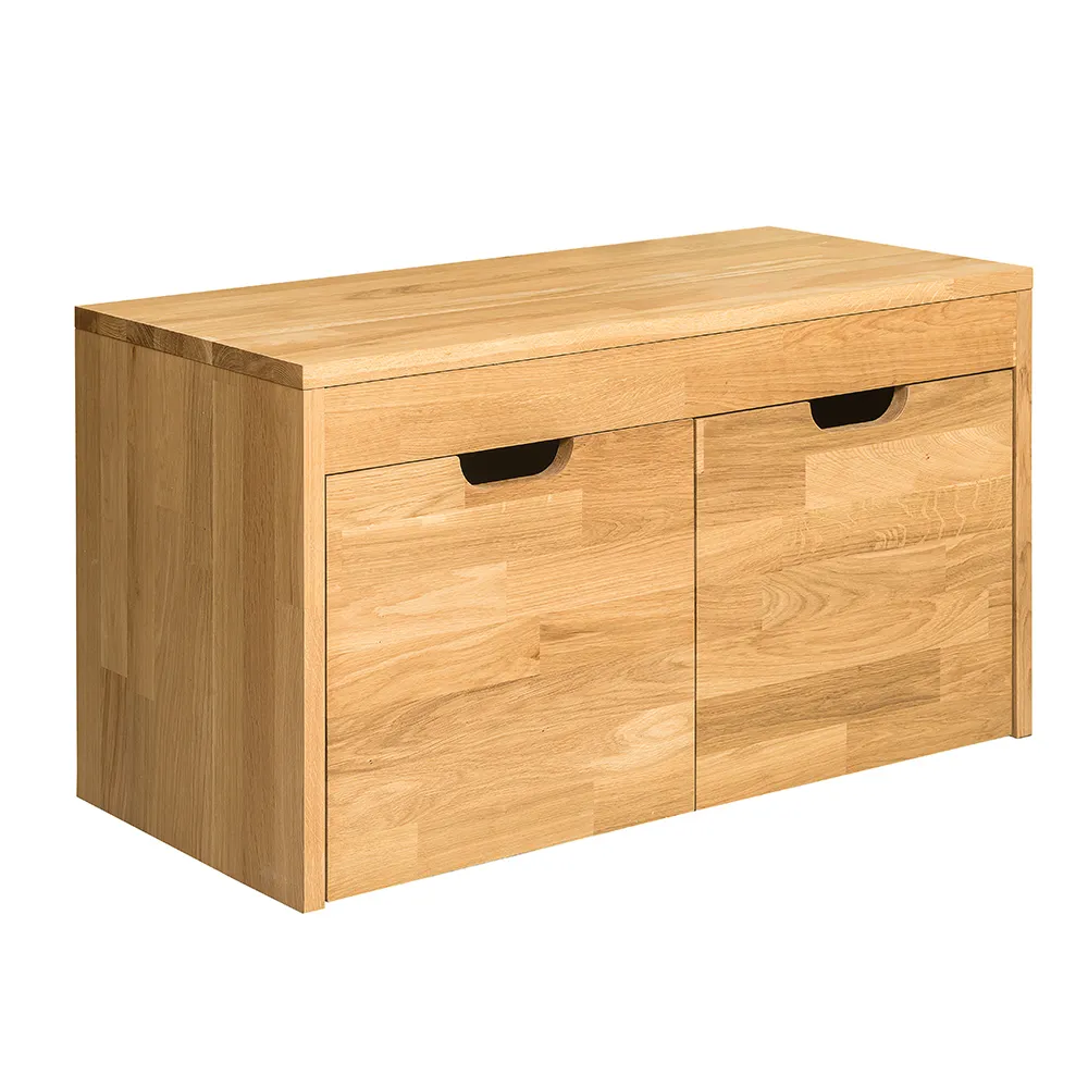 Стильная и удобная скамья для обуви «Терамо 2» изготавливается из натурального материала – массива дуба. Задняя стенка и днища ящиков сделаны из фанеры в шпоне дуба. Есть возможность выбрать один из шести цветов отделки – бейц-масло, дуб паркетный, дуб венге, дуб отбеленный, темная вишня или итальянский орех.