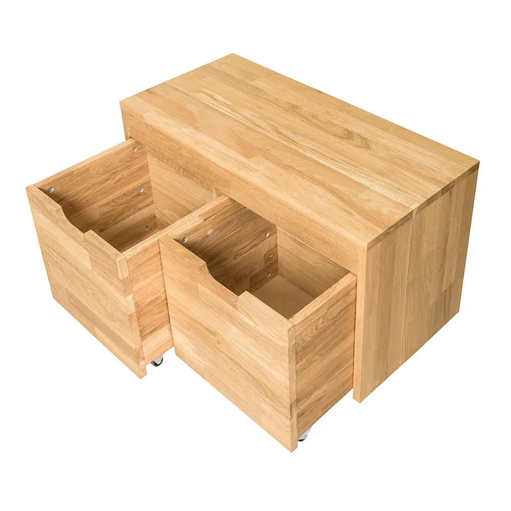 Скамья имеет два больших выкатных ящика с фрезерованными ручками. Поставляется в собранном виде, весит 33 кг. Габаритные размеры 820х400х450 мм.