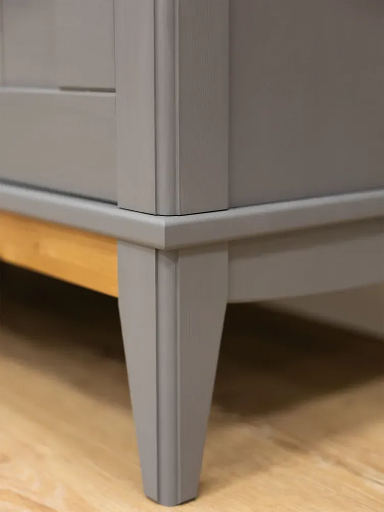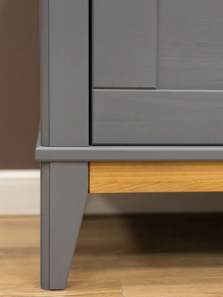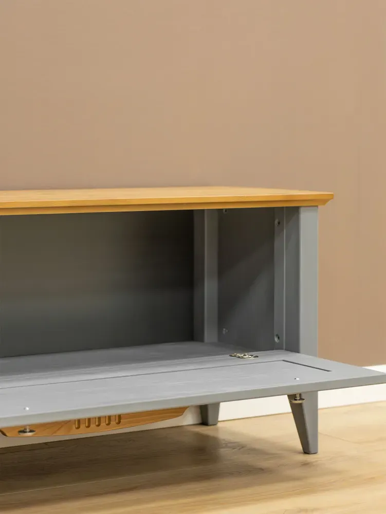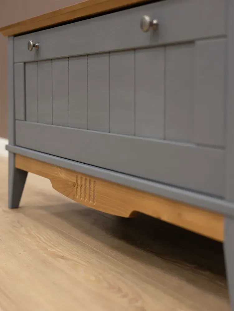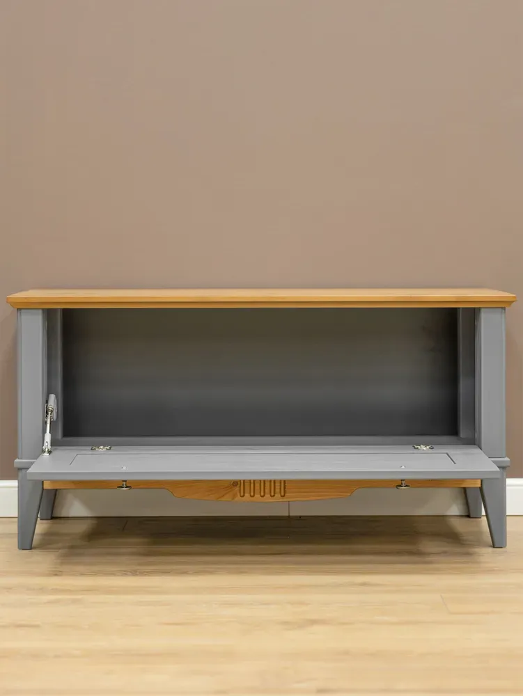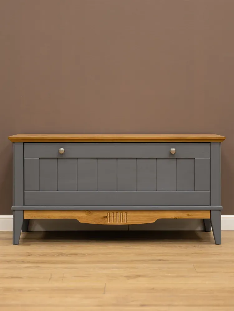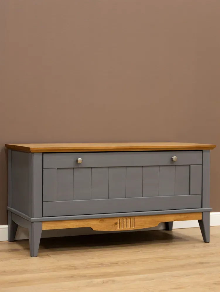 Корпус и фасад окрашены в серый цвет, крышка и нижняя декоративная планка в цвете «антик». Эта же модель обувной тумбы доступна в сочетаниях цветов «белый воск/антик» и «черный/антик». Для отделки применяются качественные, неаллергенные красители шведской марки Becker Acroma.