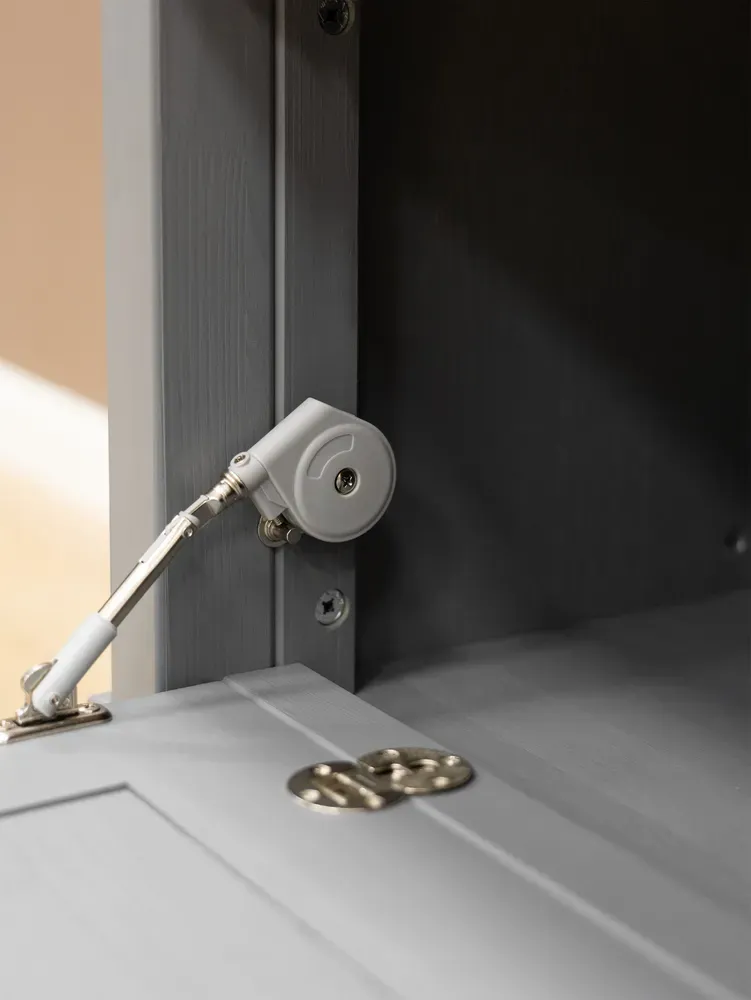 Тумба имеет вместительное отделение с откидной дверцей. Дверца декорирована вертикальной фрезеровкой, нижняя планка также с вертикальными пропилами. В комплекте идут круглые ручки-кнопки с искусственным старением. Высота от пола до нижнего края планки 12 см, под тумбу может заехать робот-пылесос.