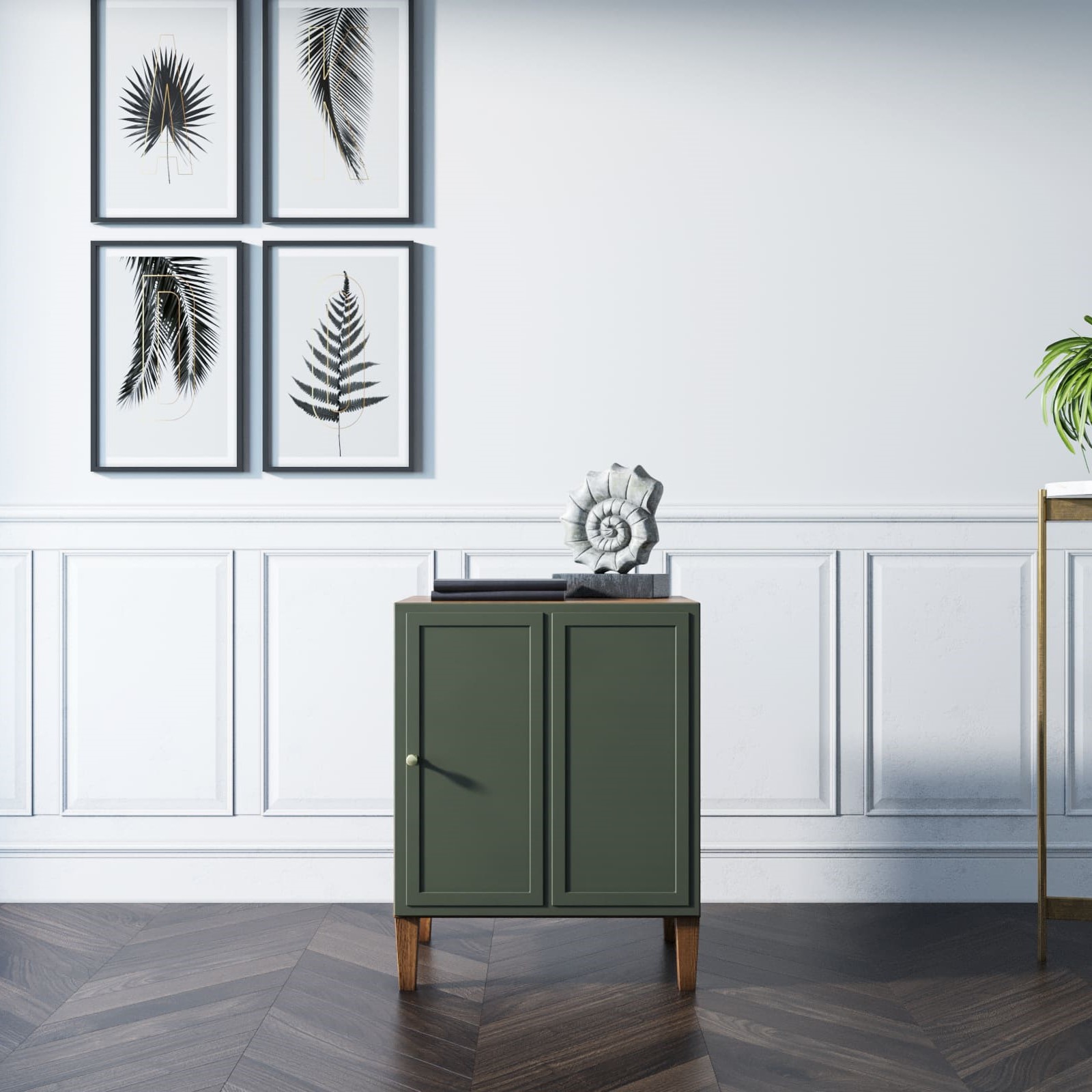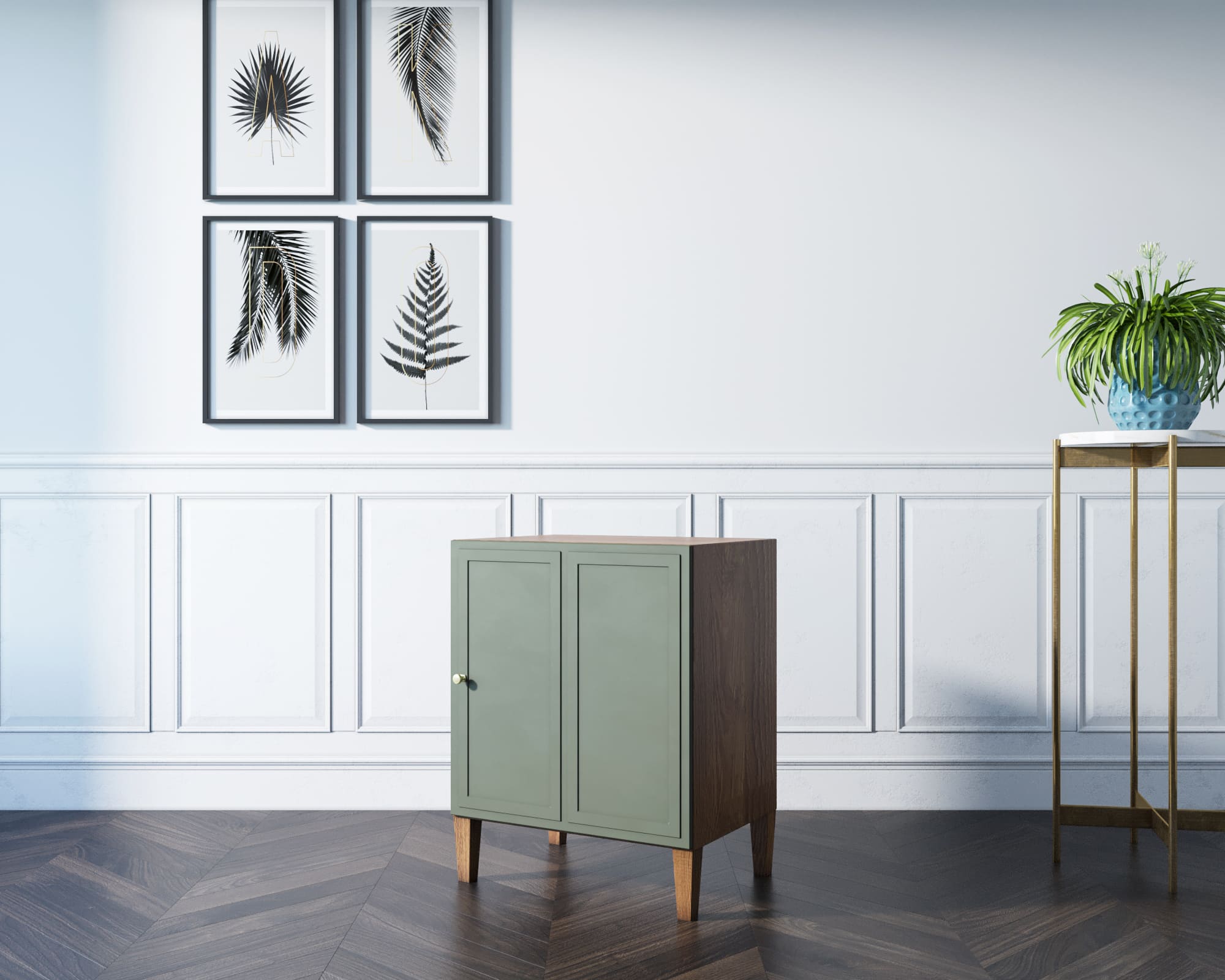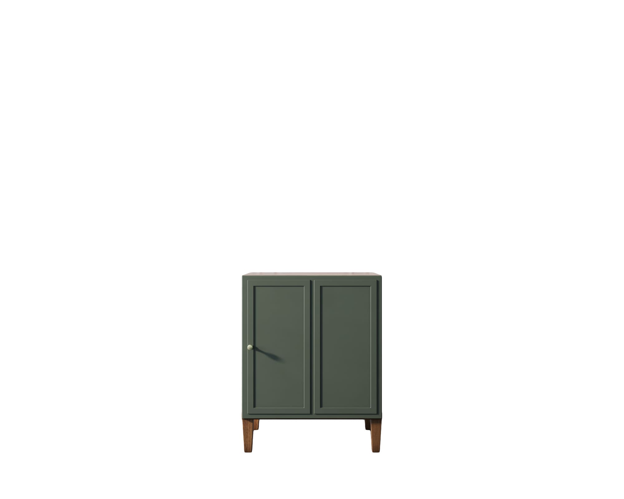 Единый фасад приятного зеленого оттенка с прямыми рамками выигрышно смотрится с ножками из массива ясеня в цвете орех.
