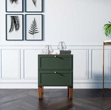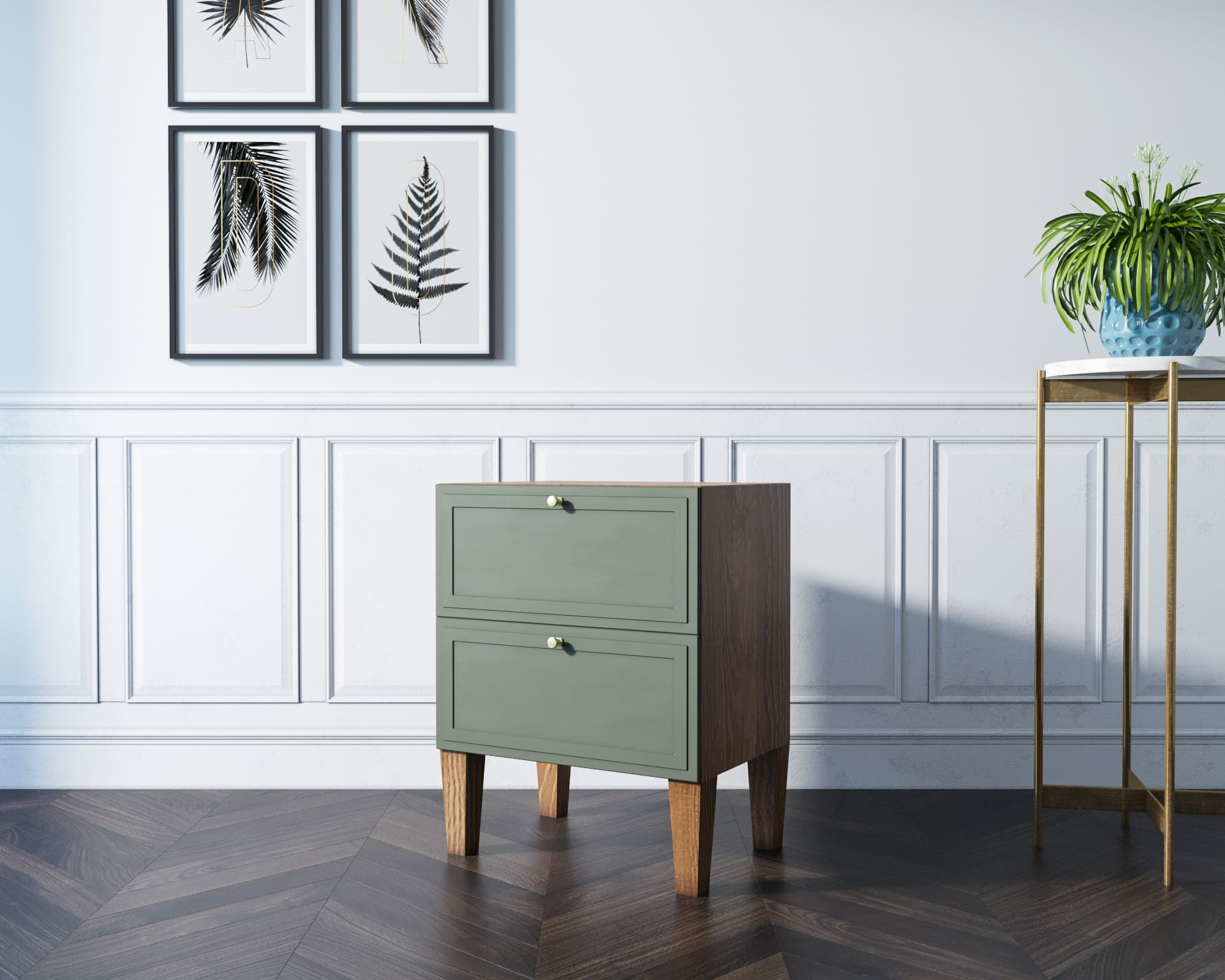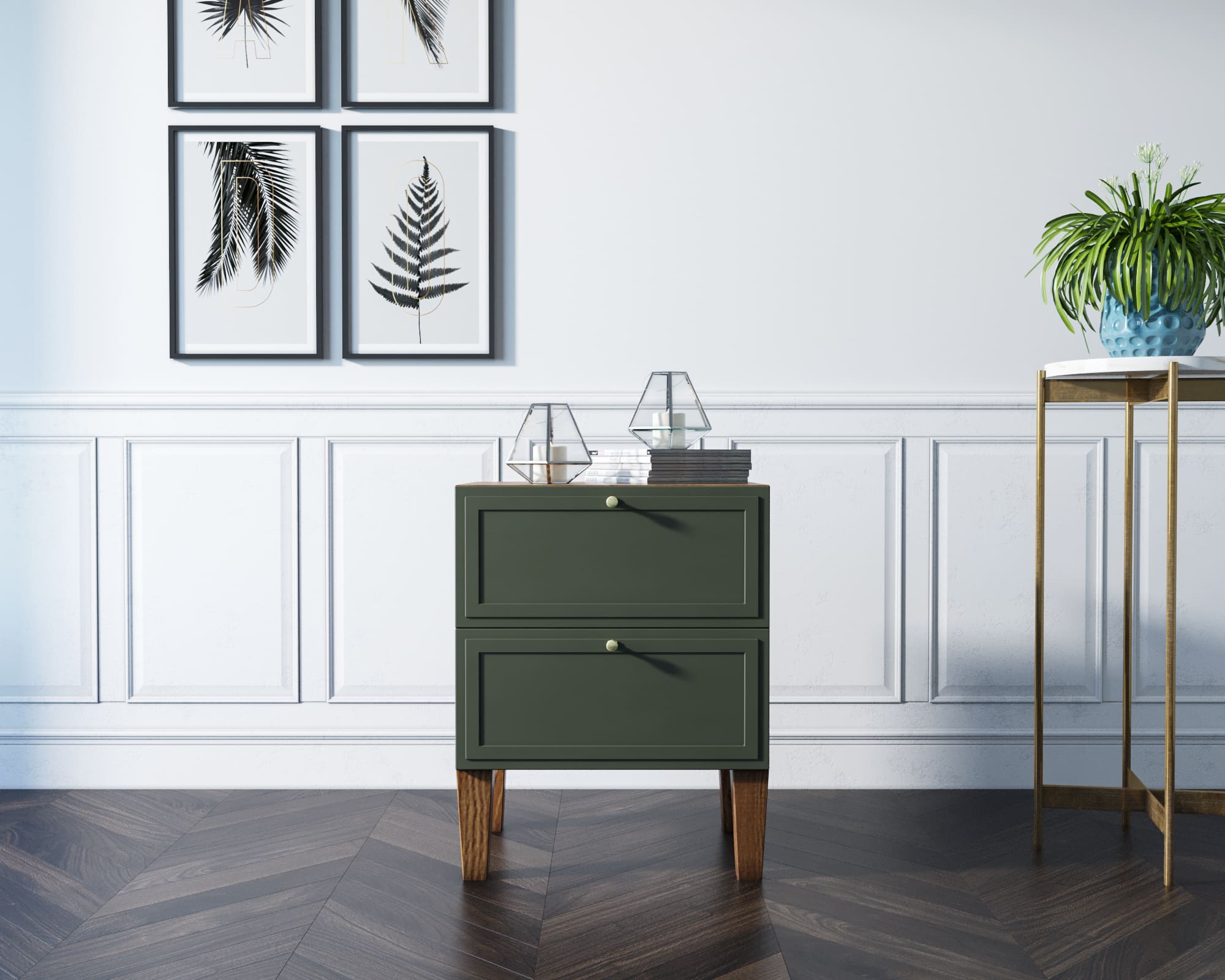 Два оригинальных фасада приятного зеленого оттенка с прямыми рамками выигрышно смотрятся с ножками из массива ясеня в цвете орех.