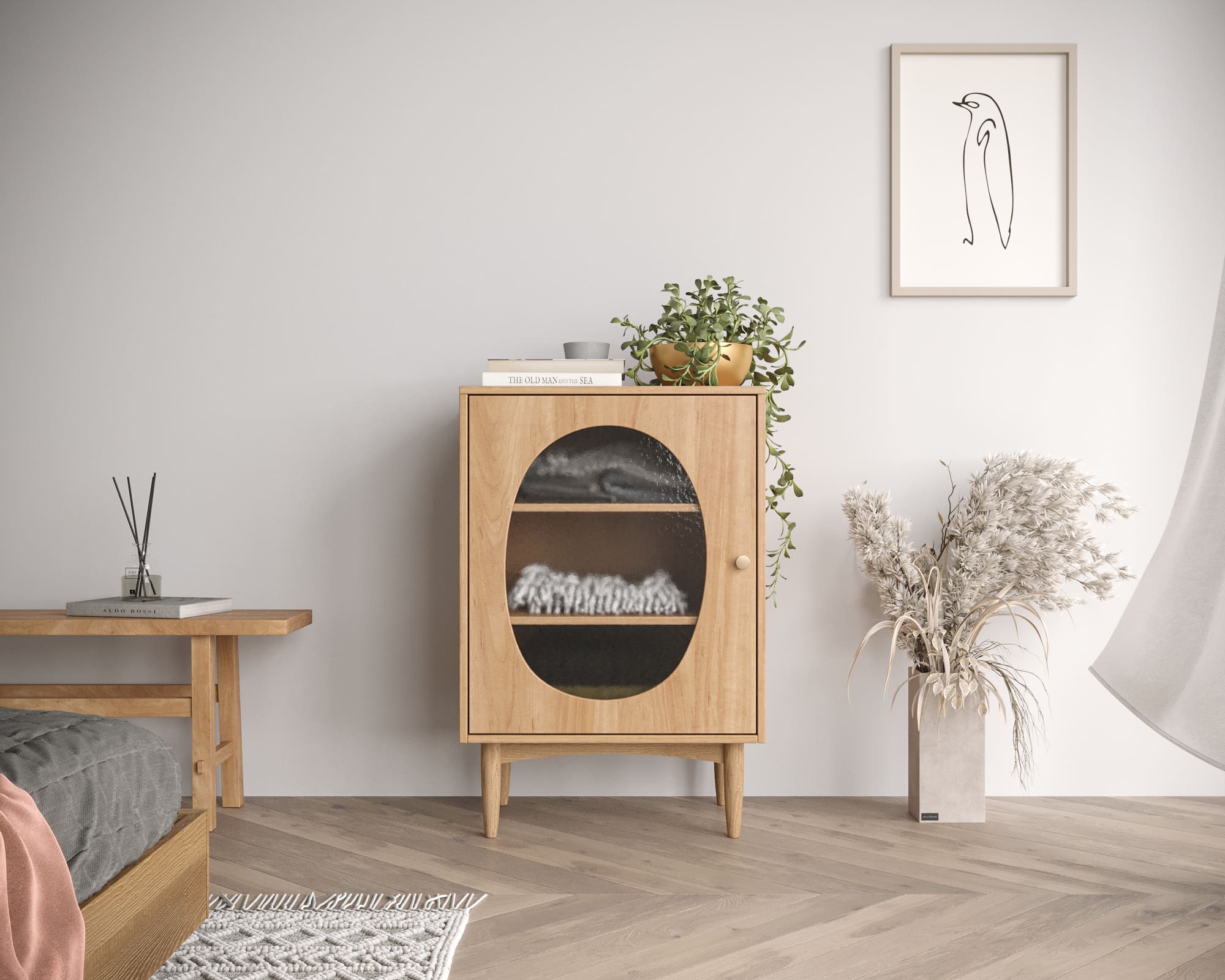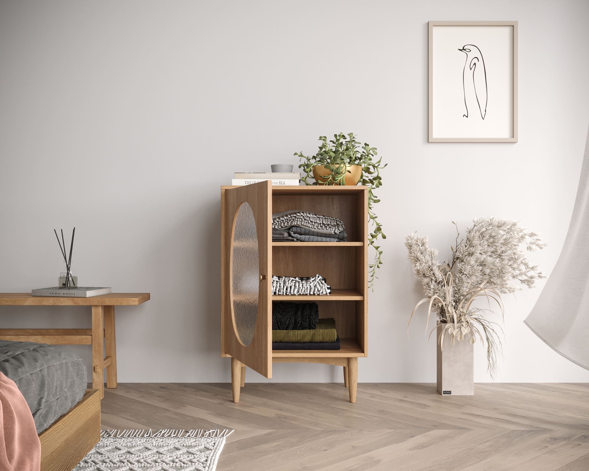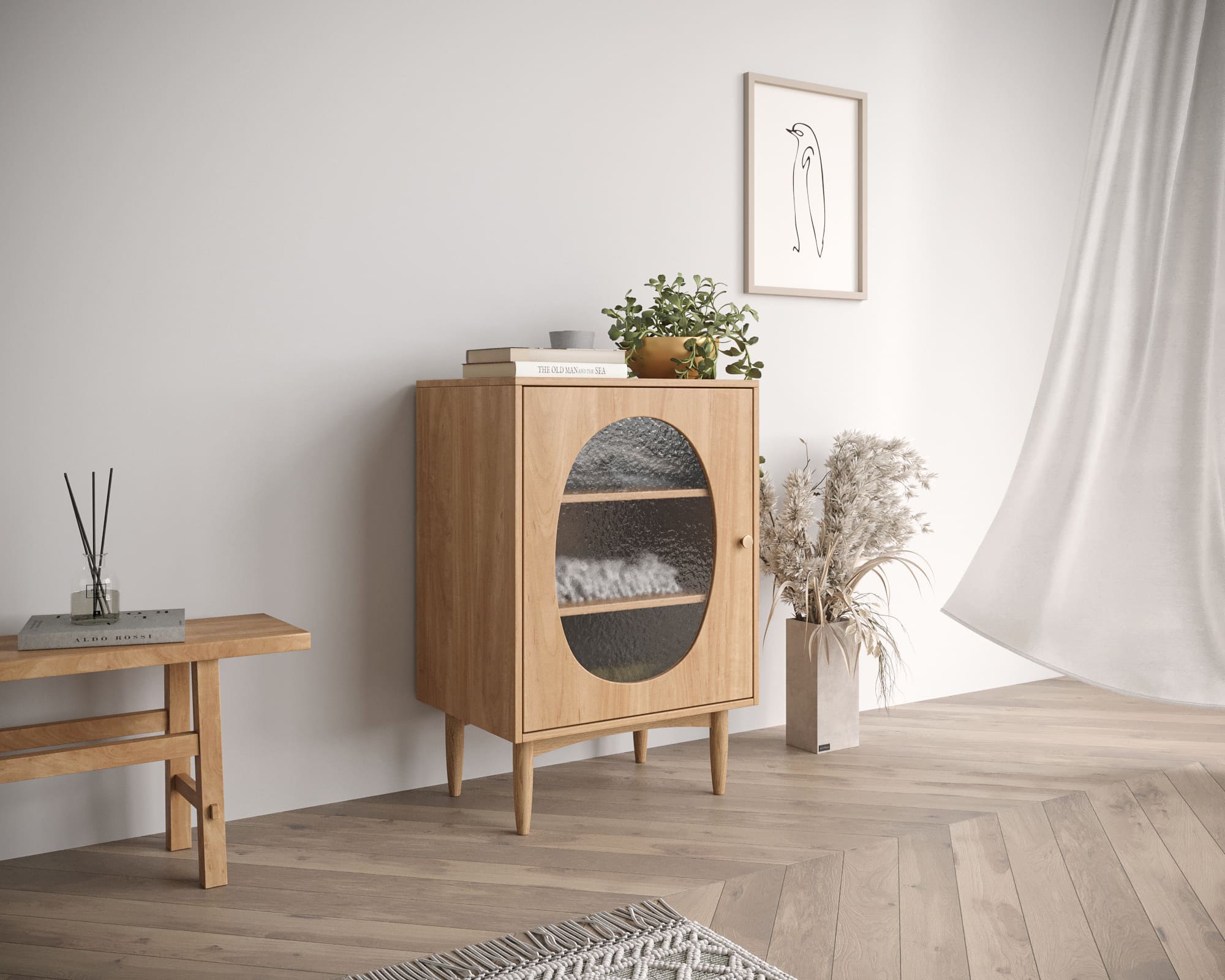 Она имеет одну дверку, ножки из массива ясеня и стильный скандинавский дизайн.