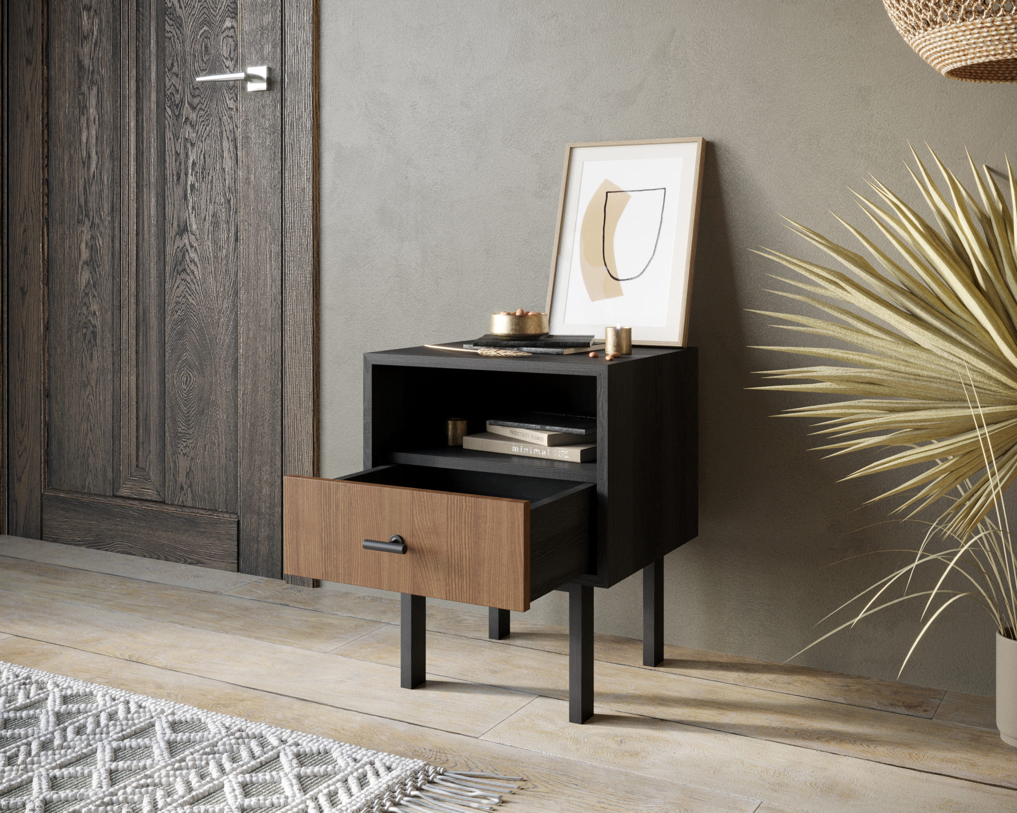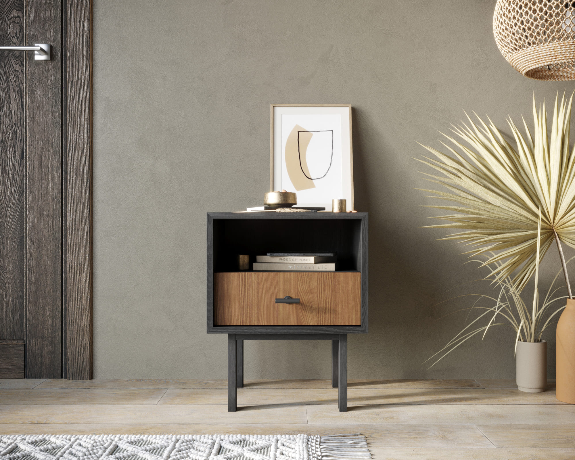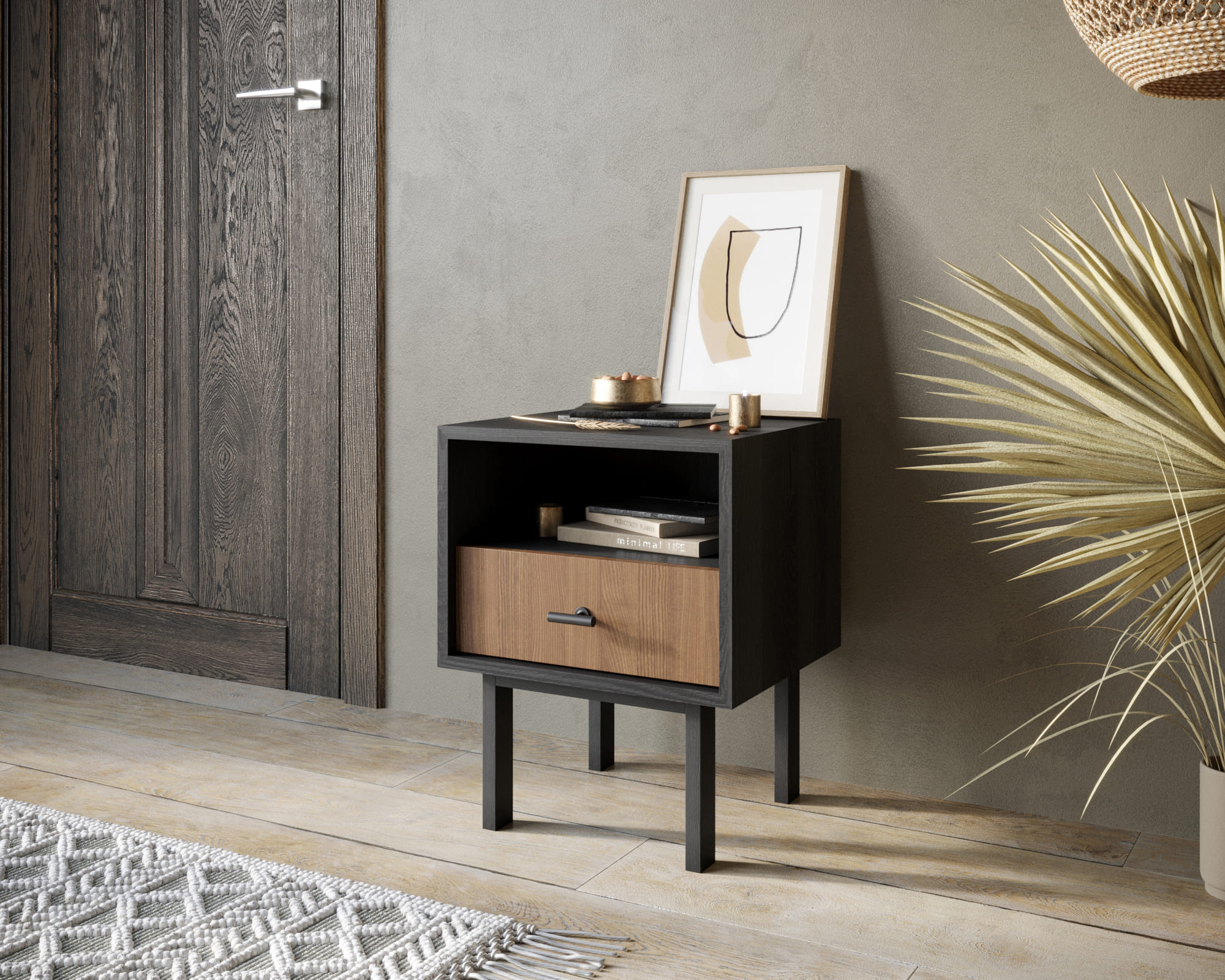 Фасады тумбы изготовлены из ламинированной древесно-стружечной плиты (ЛДСП), которая обеспечивает долговечность и надёжность изделия. Внутри тумбы расположены один или два ящика с шариковыми направляющими без доводчика. Это позволяет легко открывать и закрывать ящики.